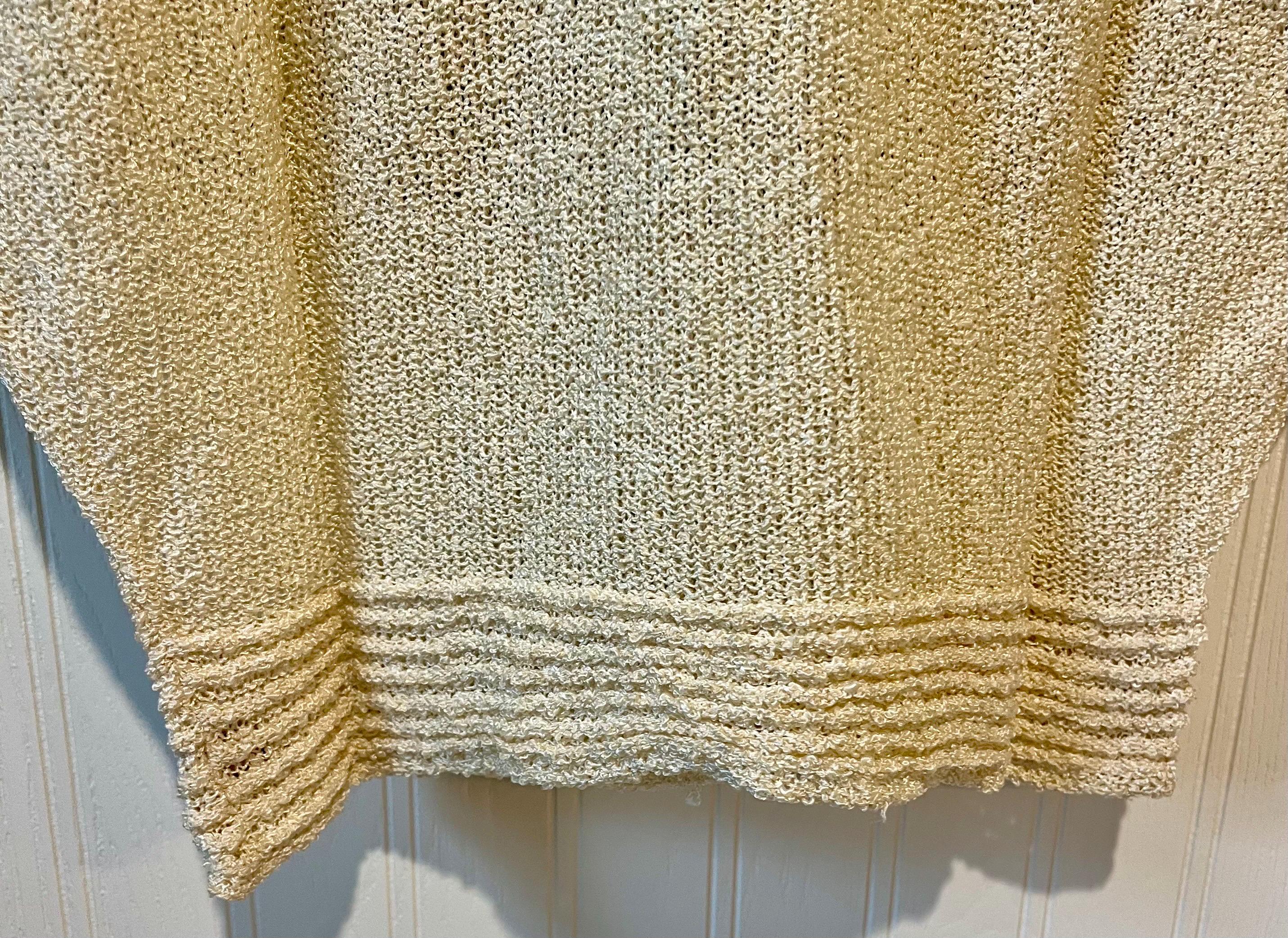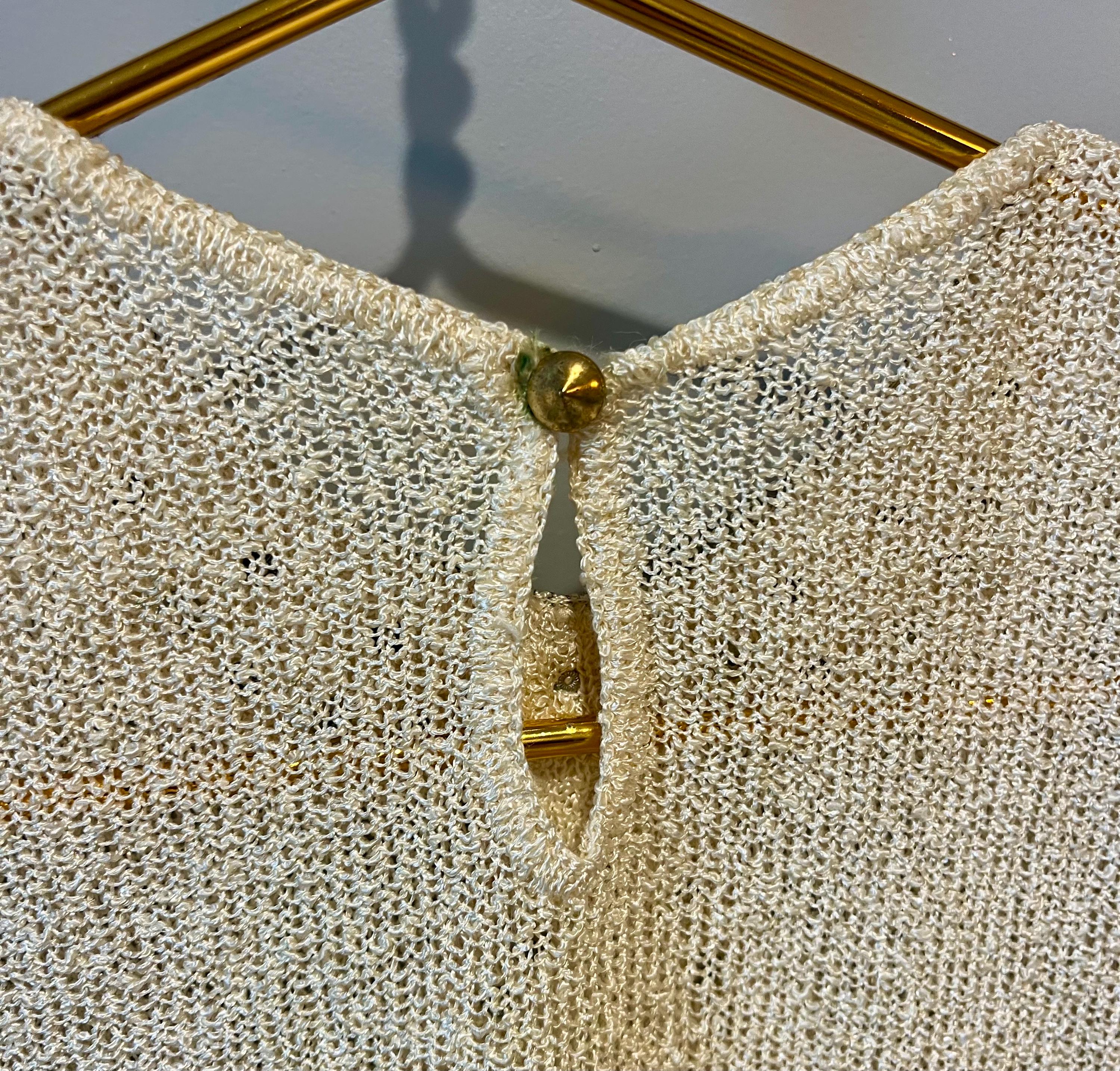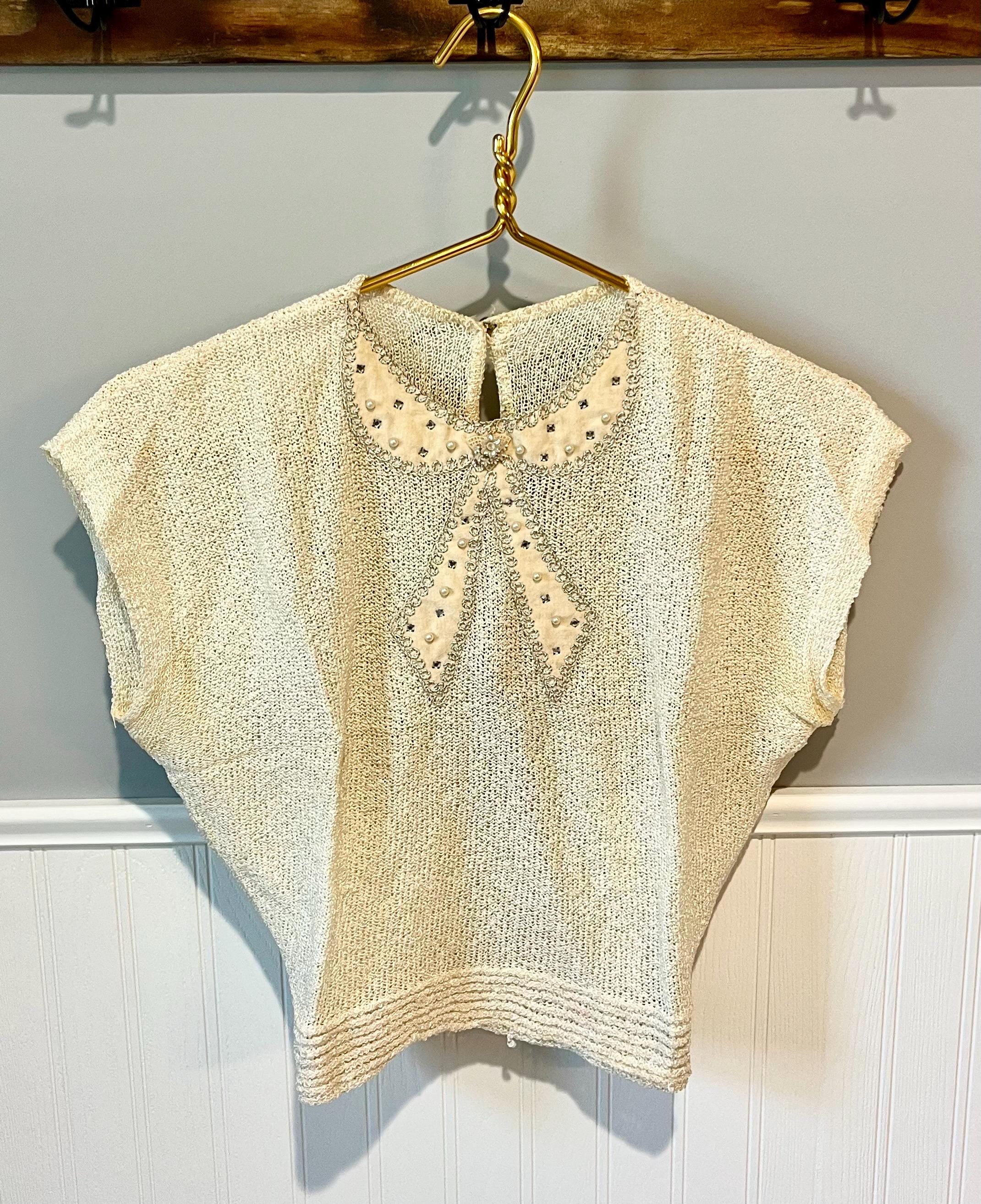 Features: • Authentic 1930s–1940s era knit top • Label: Beau-Pal, New York City • Soft cream knit with beautiful drape • Velvet-like collar detail shaped like a bow with rhinestone embellishments • Cap sleeves with elegant shoulder shaping • Keyhole back with button closure • Ribbed hemline adds a subtle tailored finish