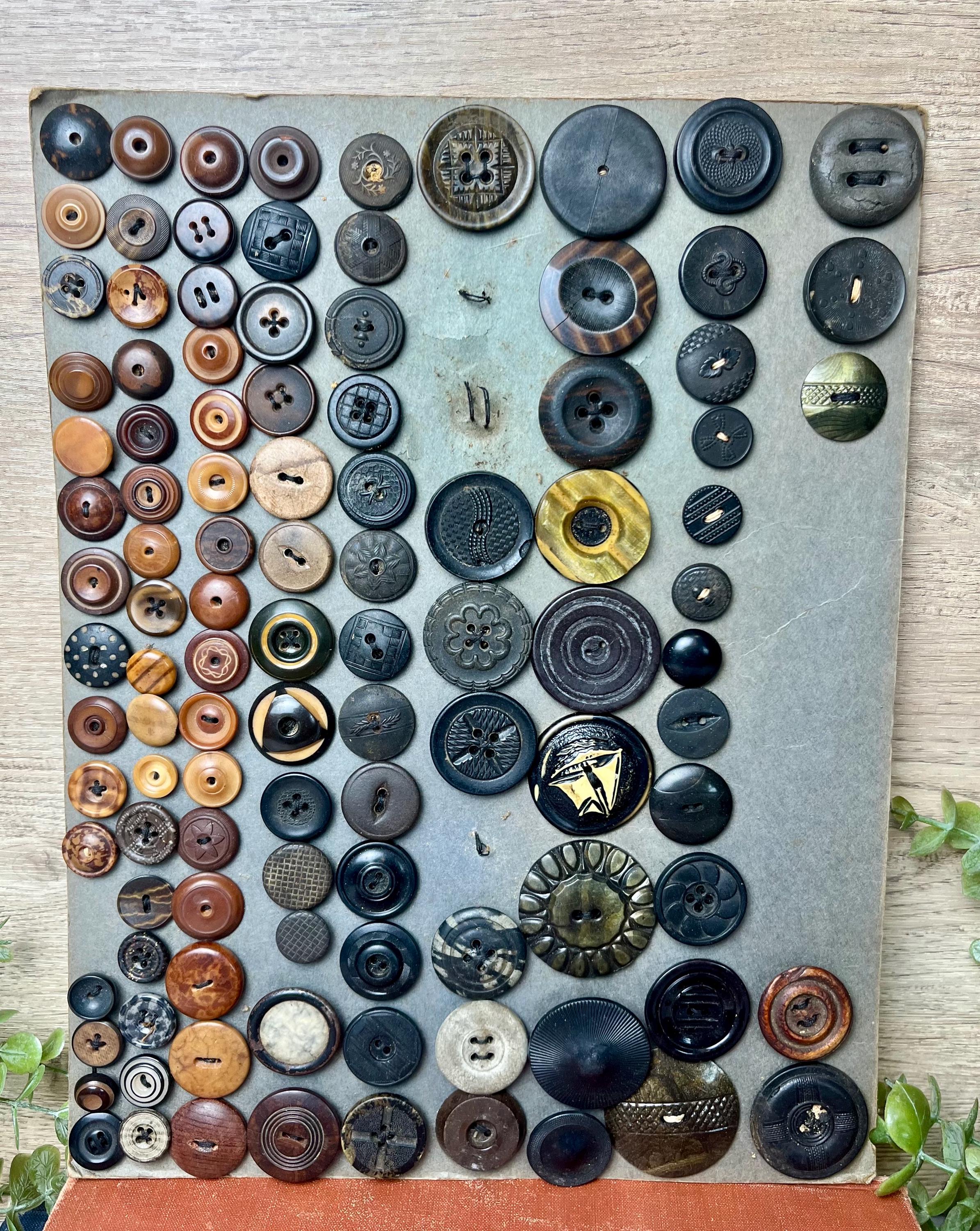 🖤 Board 3: Browns & Blacks — Bakelite & Carved Buttons • Elegant, classic tones with a mix of carved and textured designs. • Some larger statement pieces included.