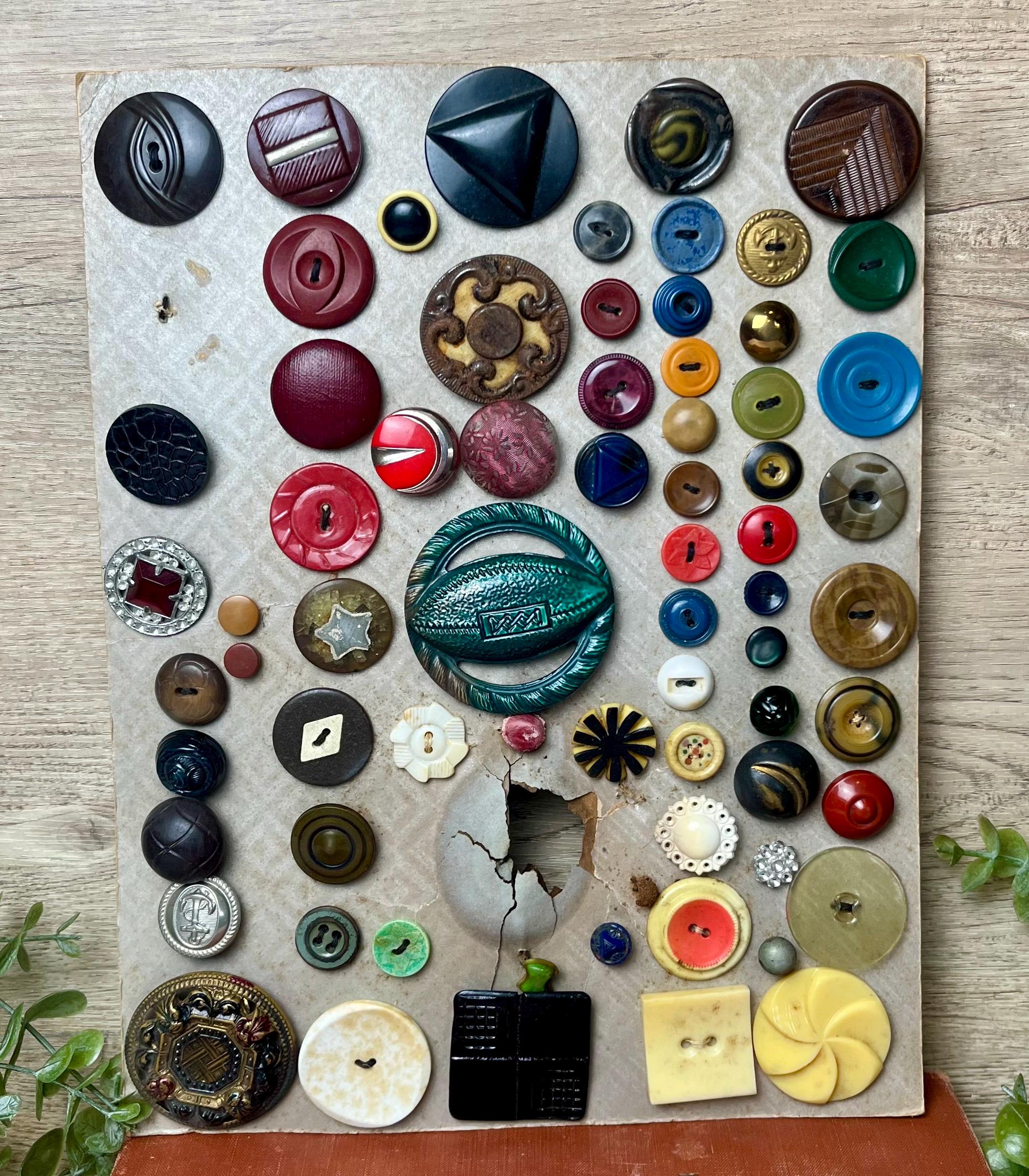These authentic pieces feature a mix of Bakelite, celluloid, glass, mother of pearl, and early plastic buttons, each showcasing unique patterns, textures, and craftsmanship typical of the era.