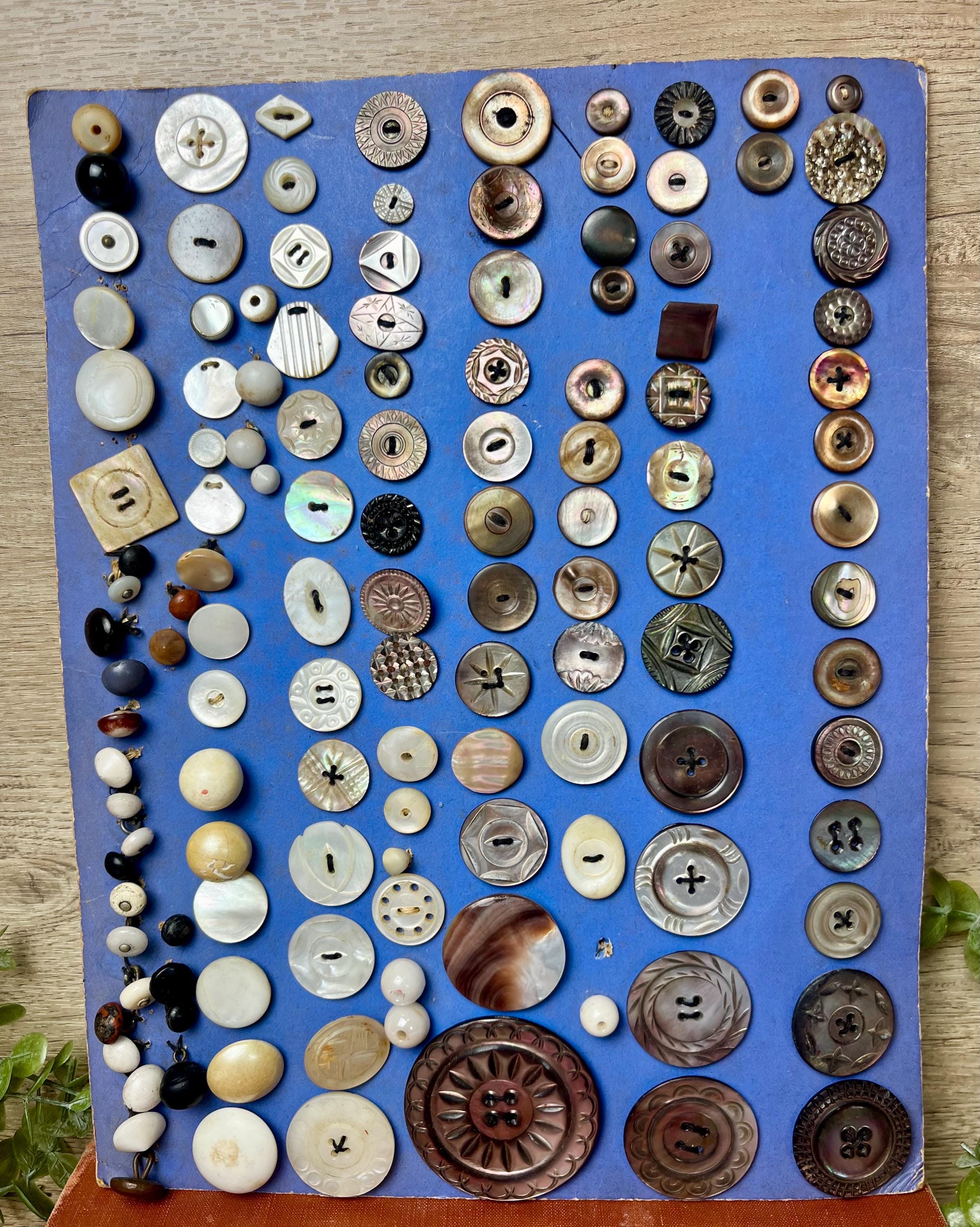 Step back in time with this stunning collection of original 1940s vintage buttons — carefully curated and mounted on three display boards.