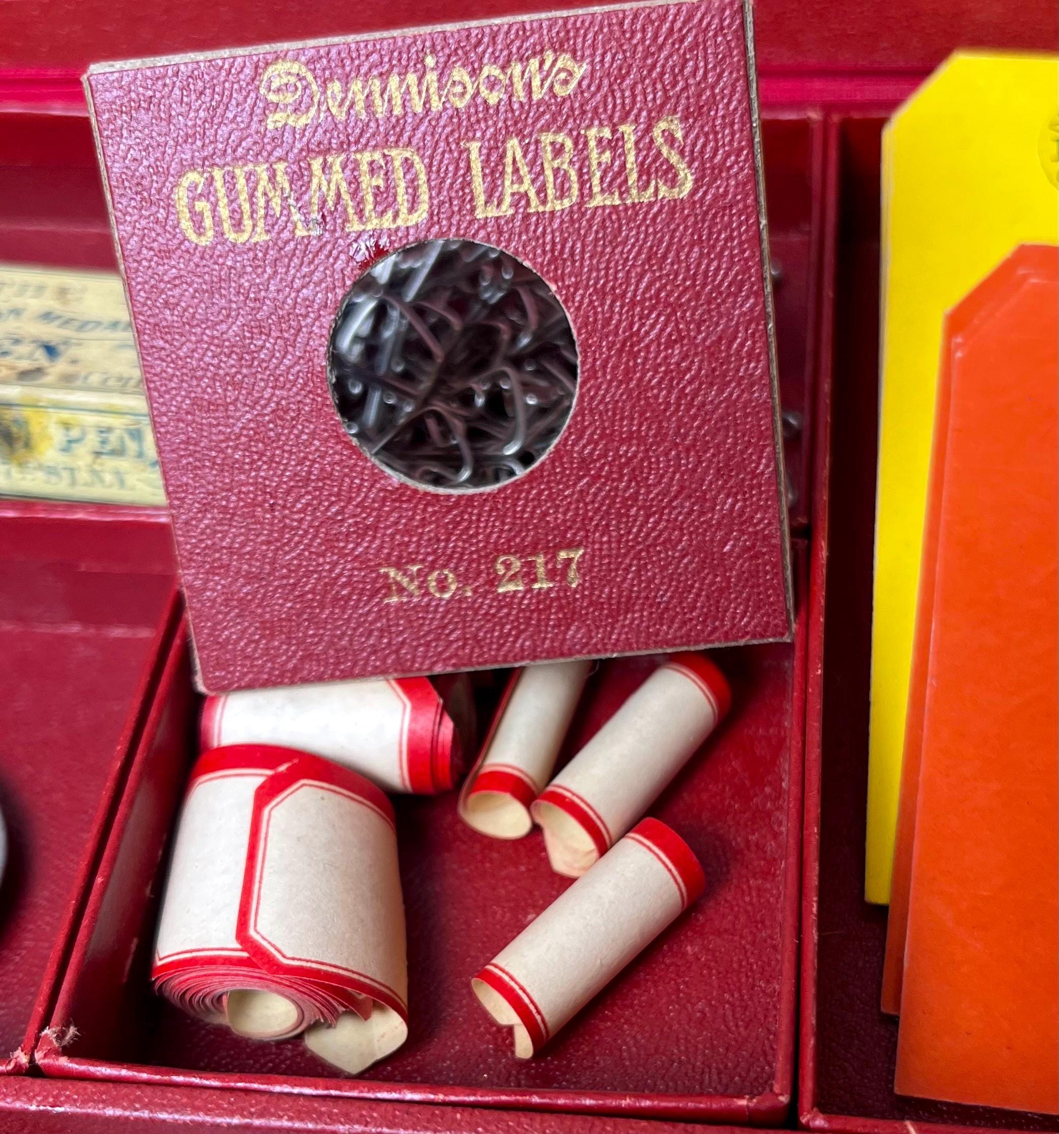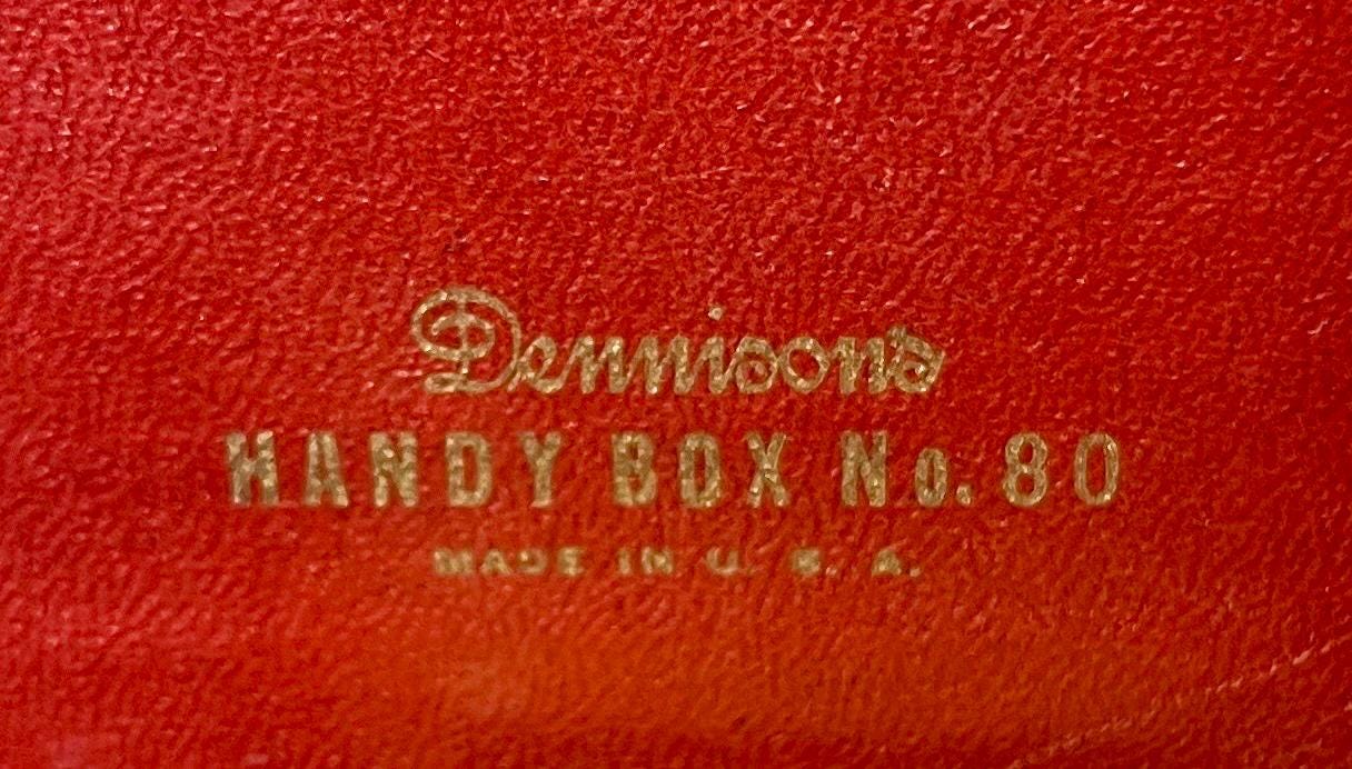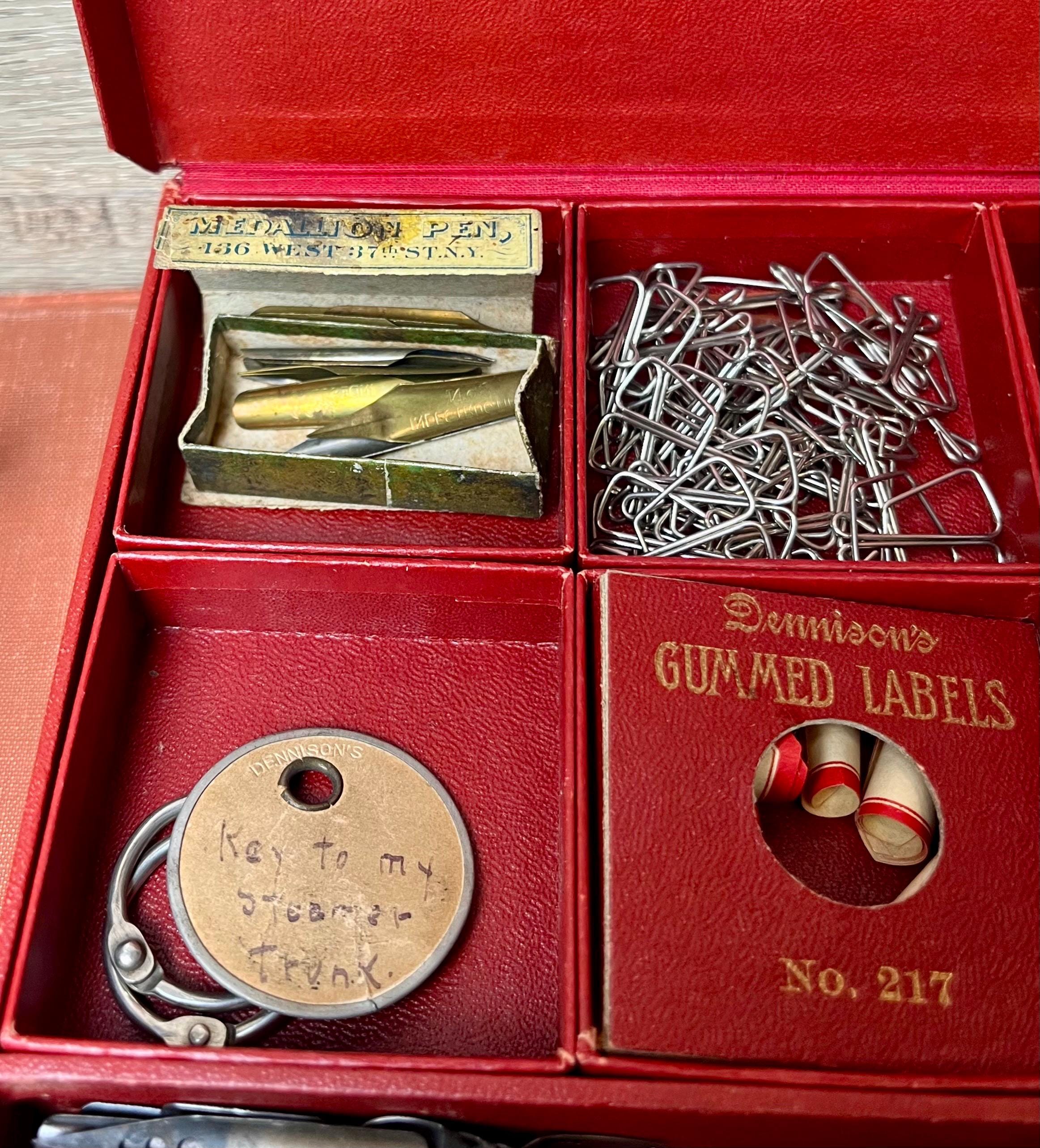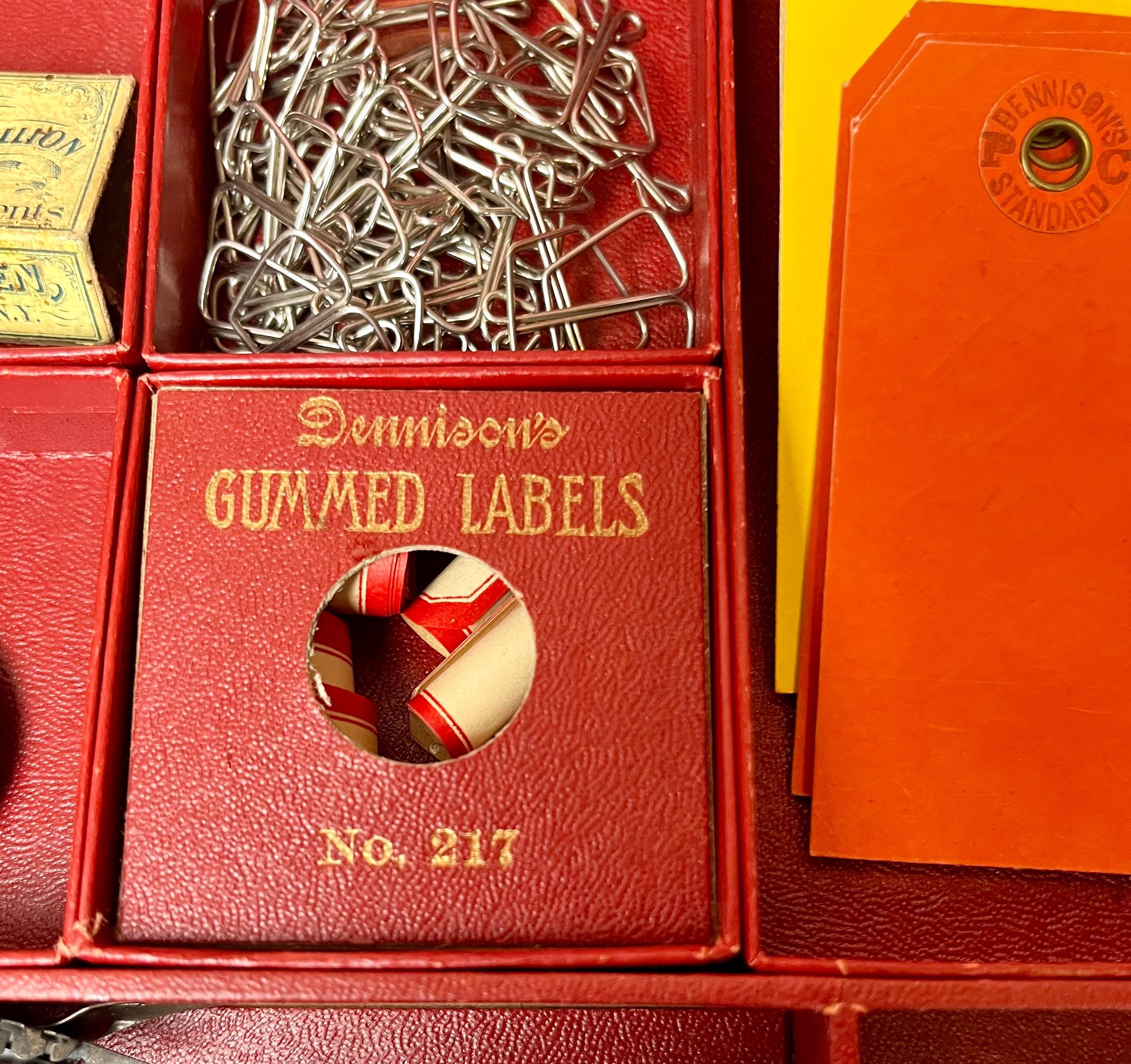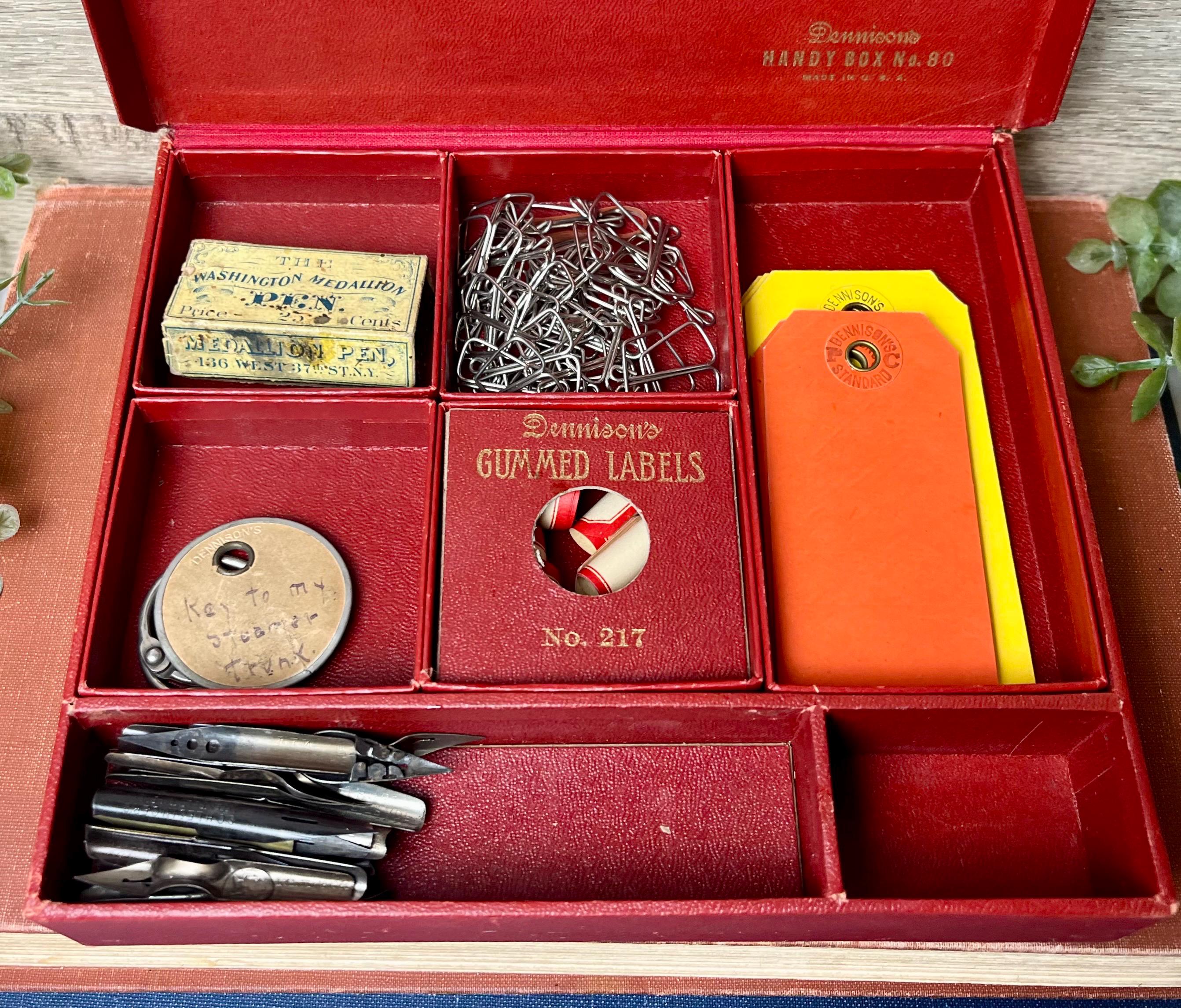 ✨ Features: • Original Dennison Handy Box No. 80 in deep red with gold lettering • Interior compartments with original vintage contents, including: • Vintage Washington Medalion Pen nib box • Original Dennison gummed labels No. 217 • Metal paper clips • Vintage shipping/tag labels • A small round tag key marked “Key to my steamer trunk” • Various vintage pen nibs • Sturdy construction with a classic hinged lid • “Dennison’s Handy Box No. 80 – Made in U.S.A.” printed inside the lid