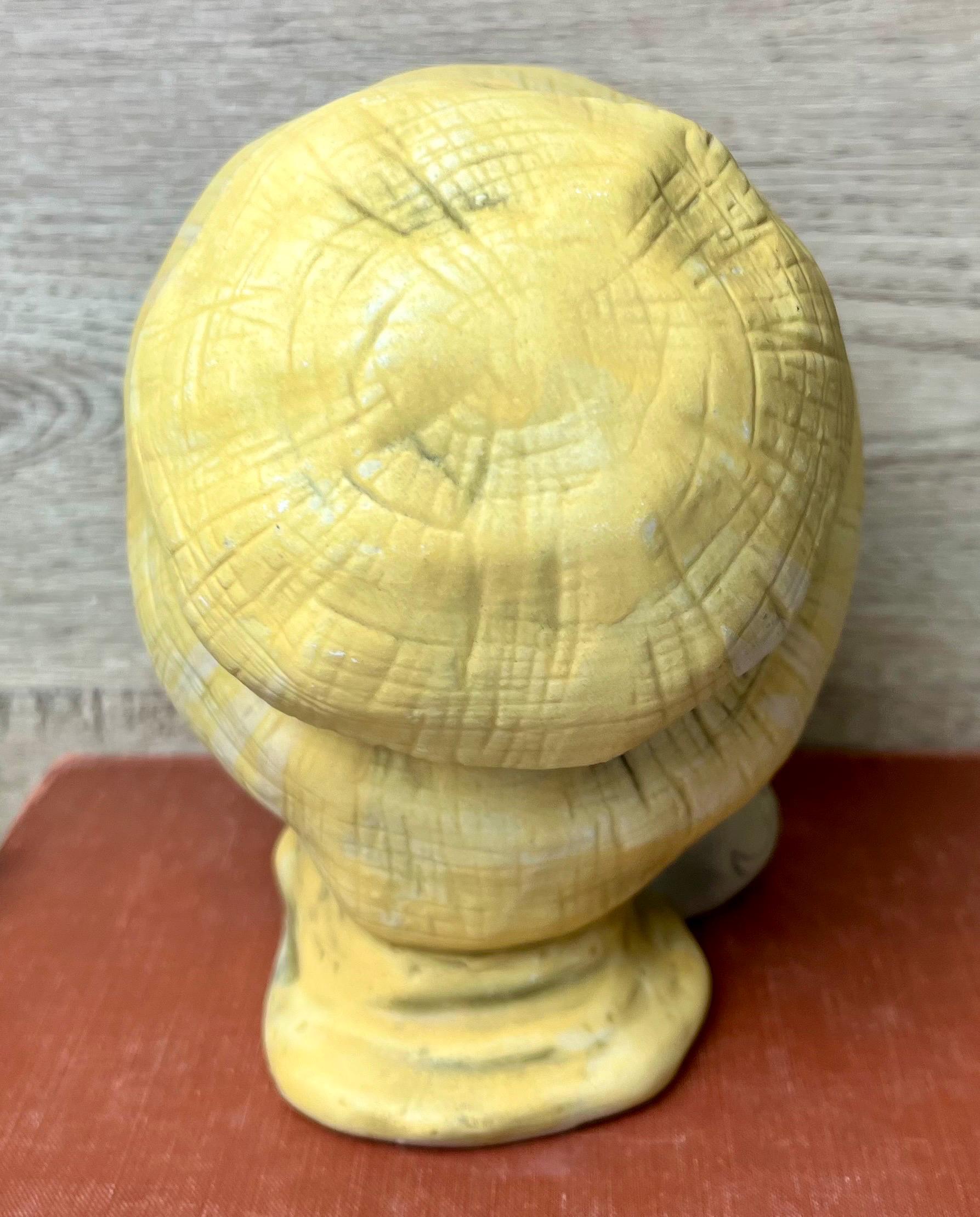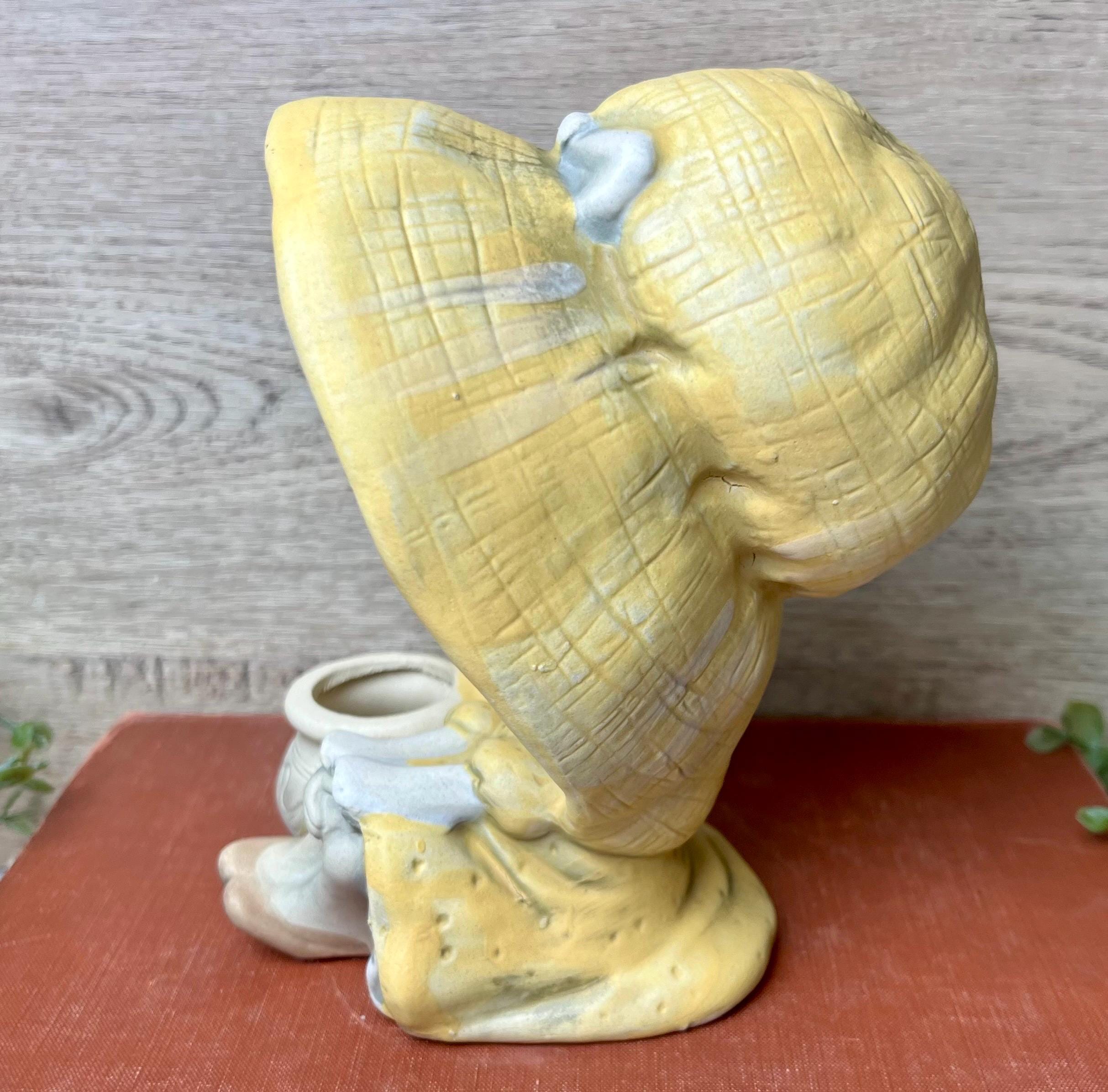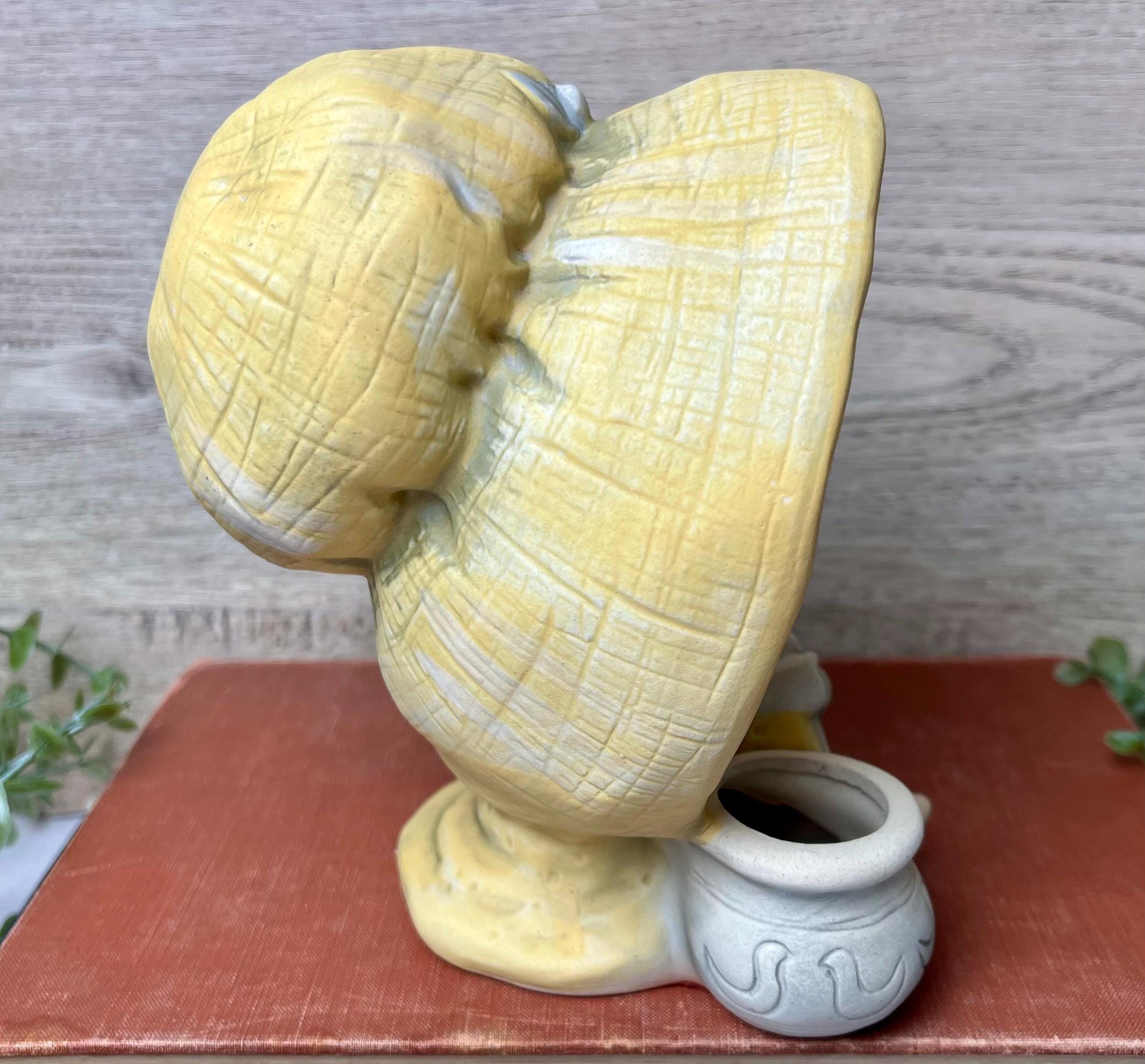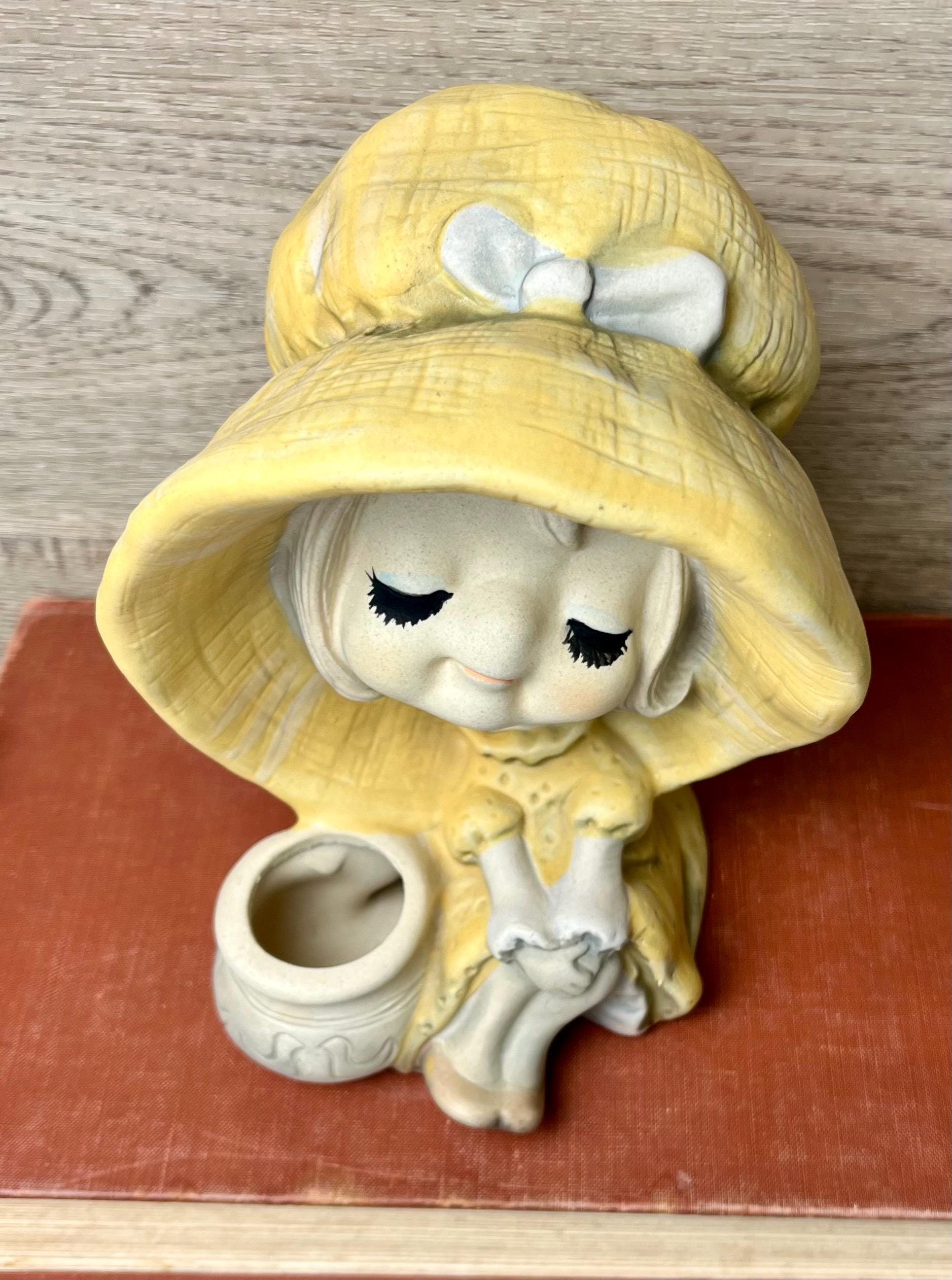 Features: • 🪴 Era: 1970s • 🎨 Material: Ceramic • 💛 Color: Soft cream with sunny yellow hat and dress • 🌸 Style: Whimsical, cottagecore, retro decor • 📏 Approximate size: 6.5” H × 5” W × 4”