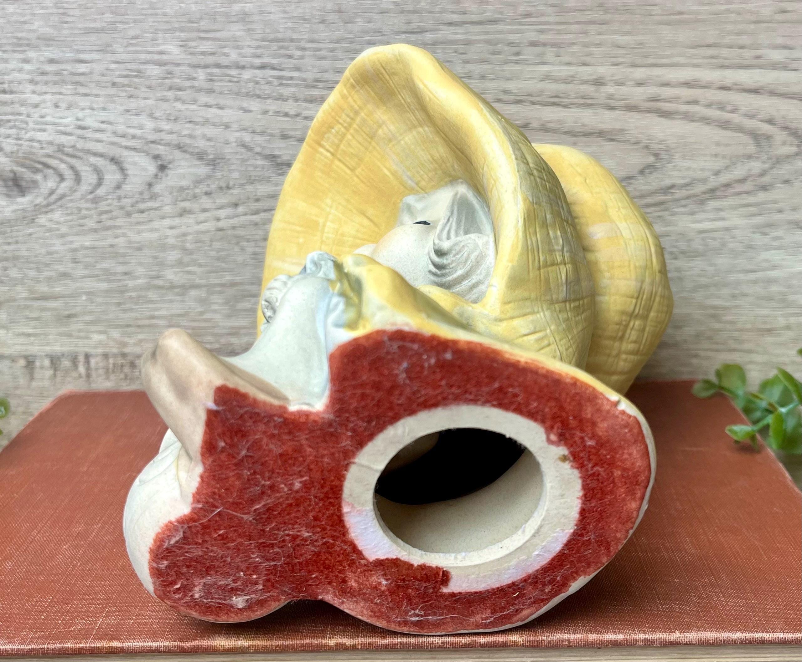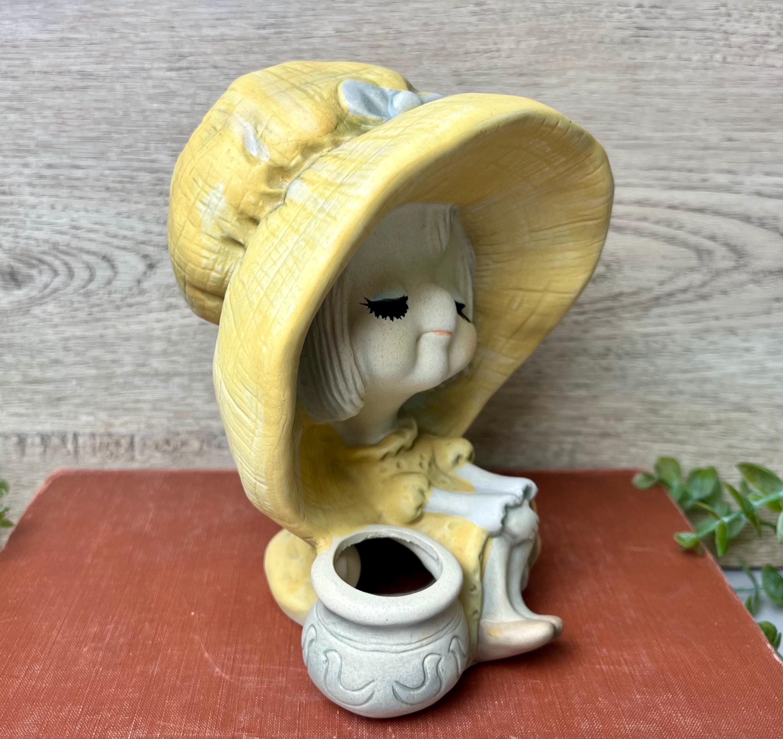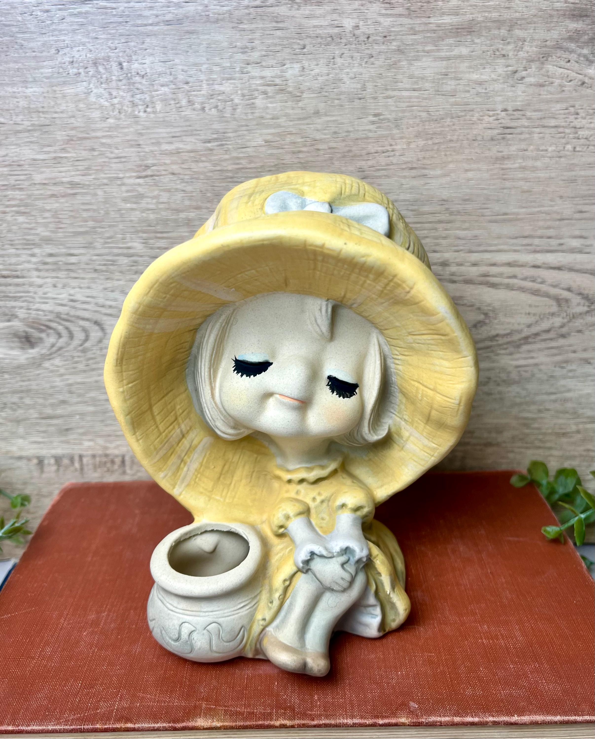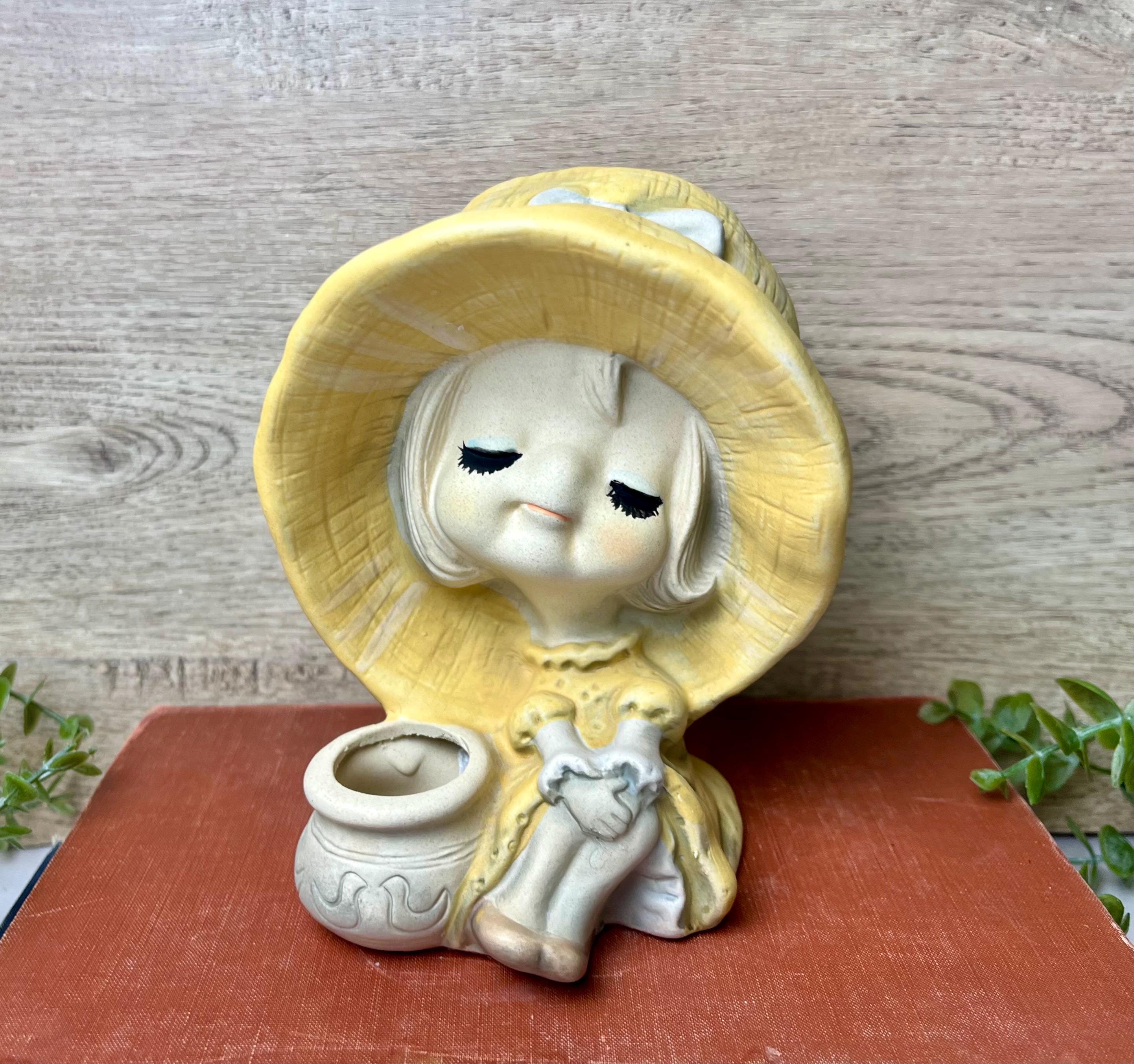 Bring a touch of vintage charm to your home decor with this sweet 1970s ceramic girl figurine planter. Featuring a serene expression with long lashes and a wide-brimmed yellow sun hat, this piece captures the whimsical style of mid-century collectible ceramics. The small pot by her side is perfect for a tiny plant, dried flowers, or even as a decorative holder.