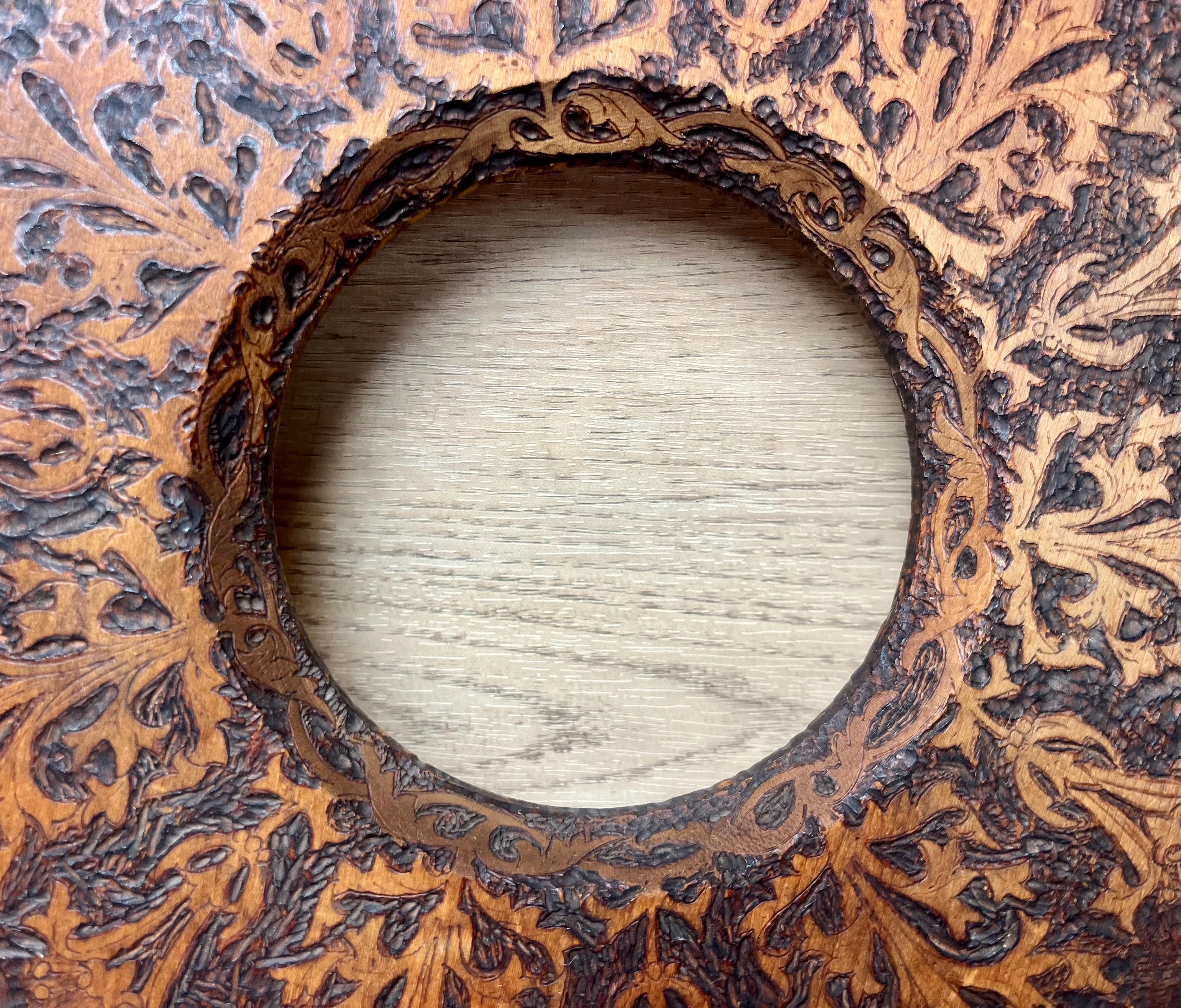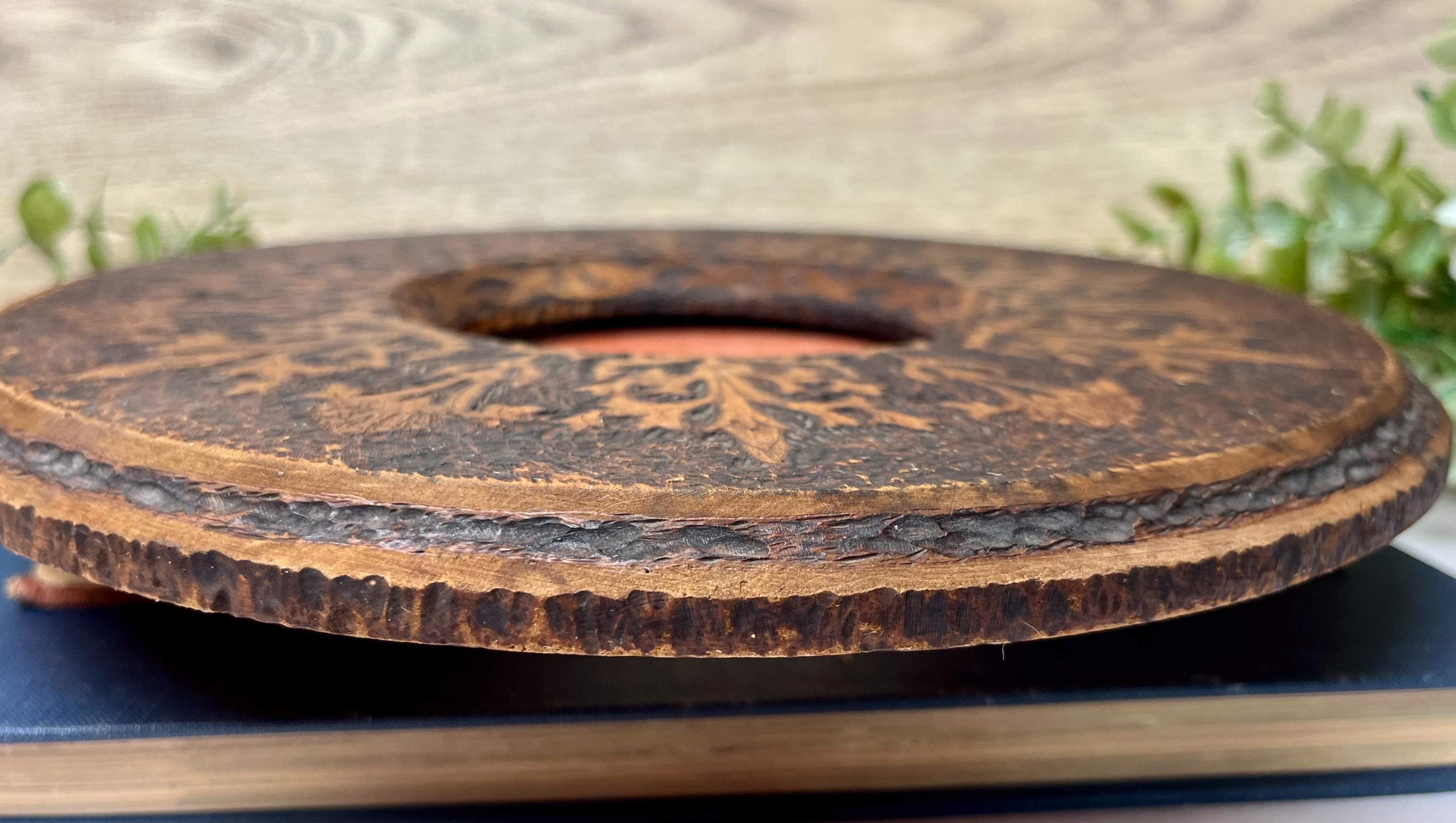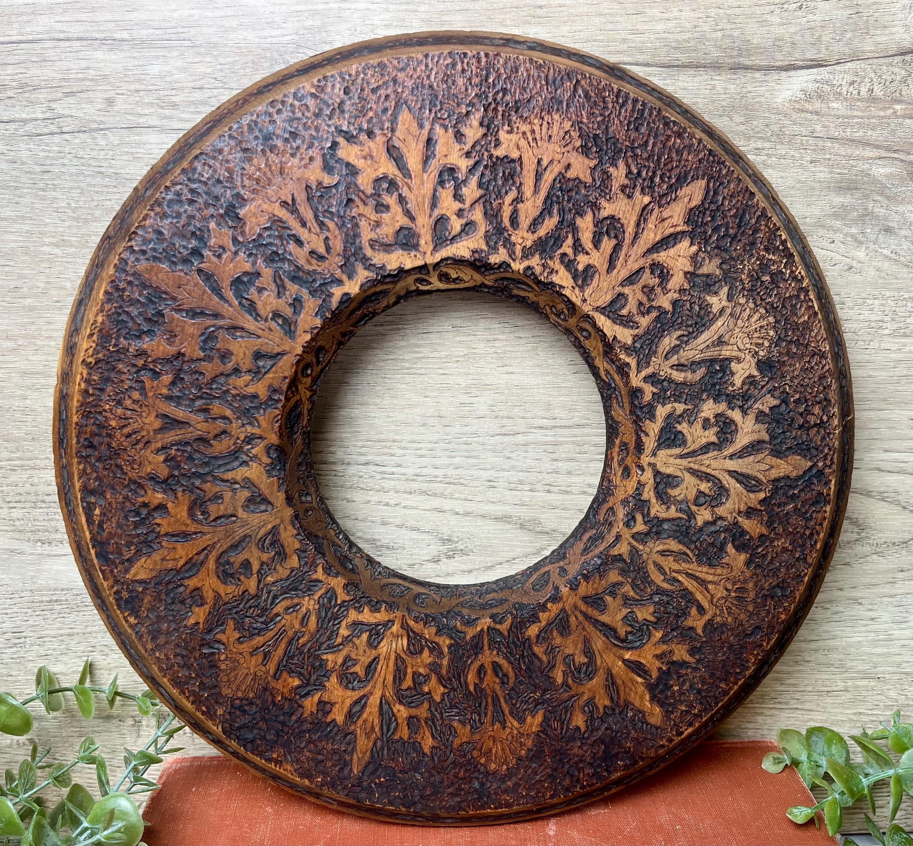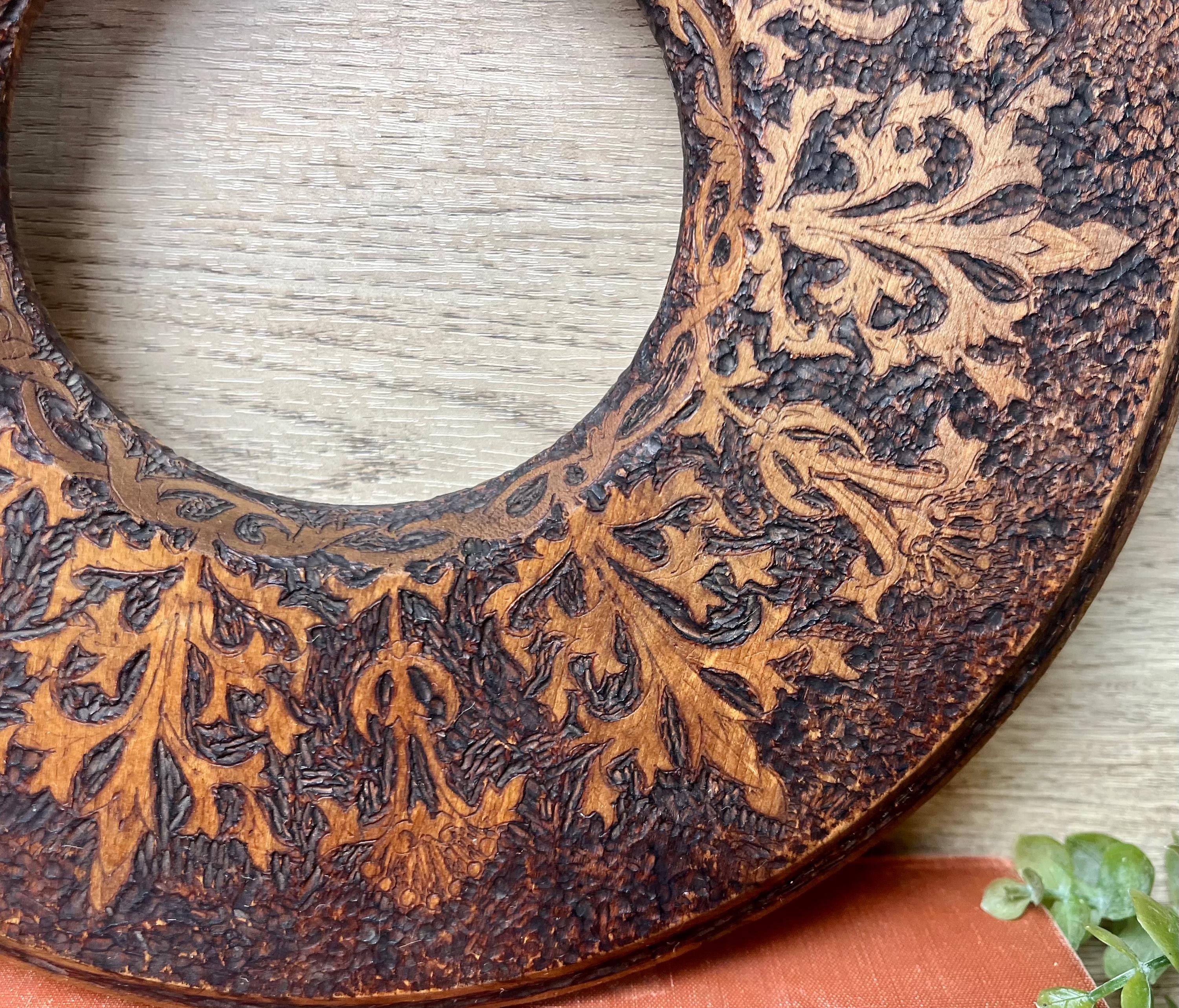 This stunning vintage wooden pyrography frame showcases exquisite craftsmanship with a beautifully detailed wood-burned floral pattern. The warm, earthy tones and intricate leaf and thistle design give it a timeless rustic charm — perfect for cottagecore, farmhouse, or vintage-inspired interiors.