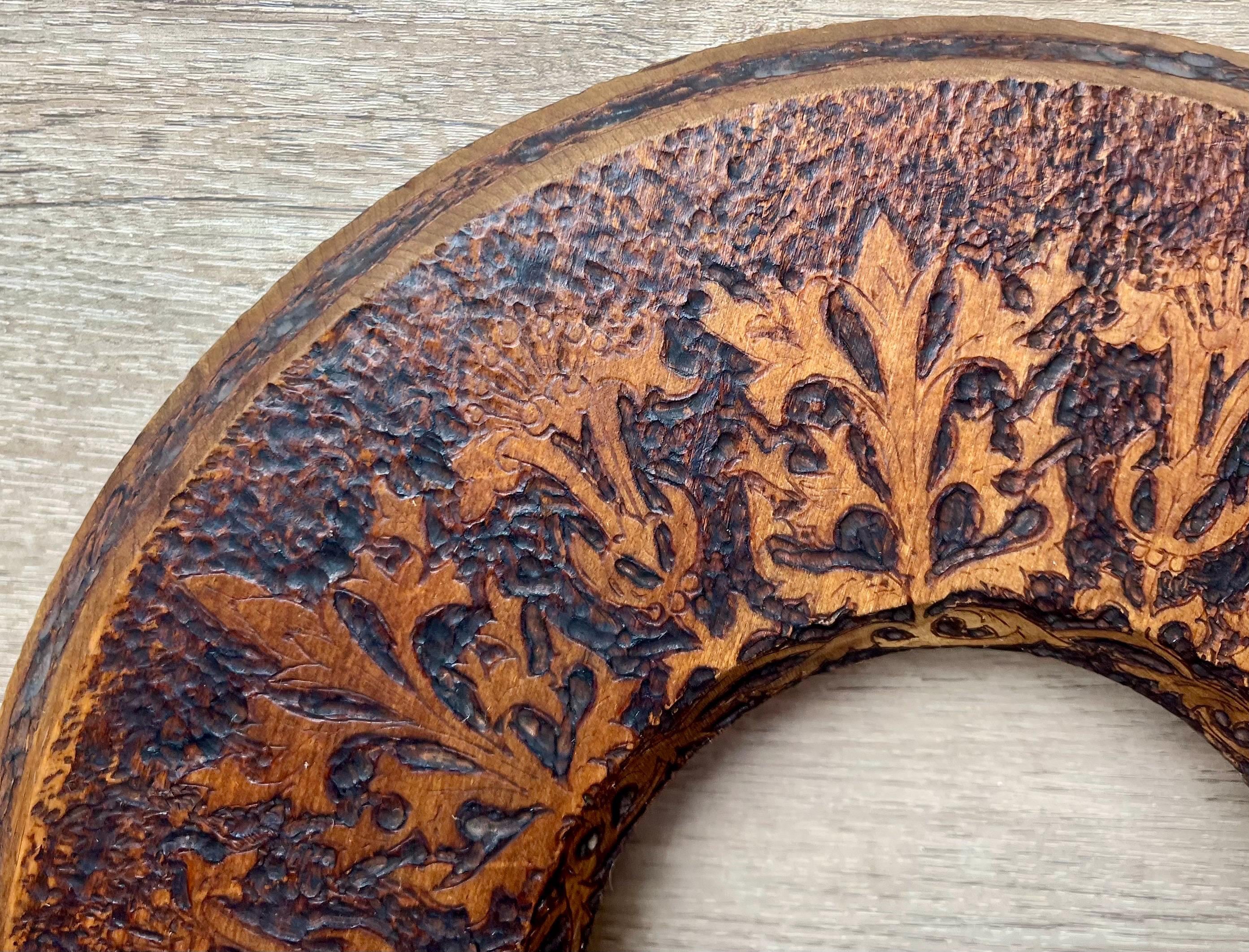 Features: • 🪵 Material: Solid wood, hand-burned design • 🌿 Design: Detailed floral and thistle motif in rich brown tones.