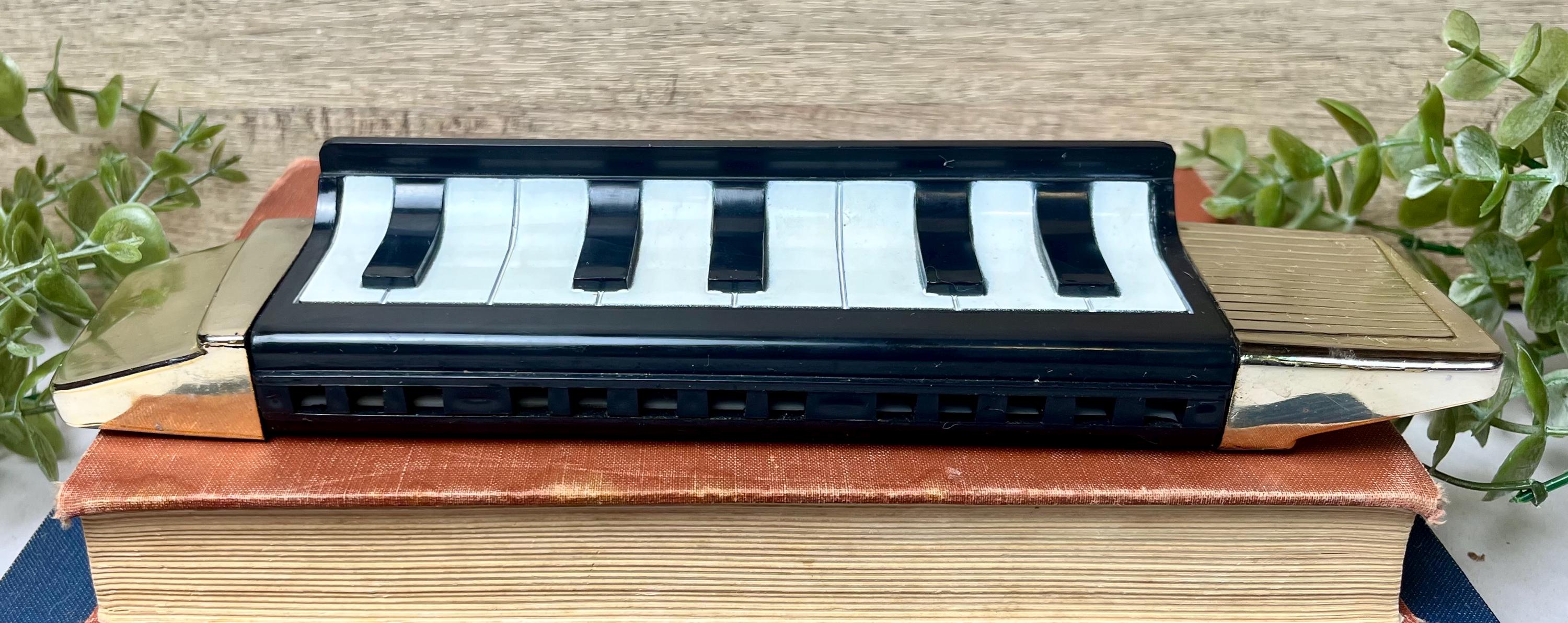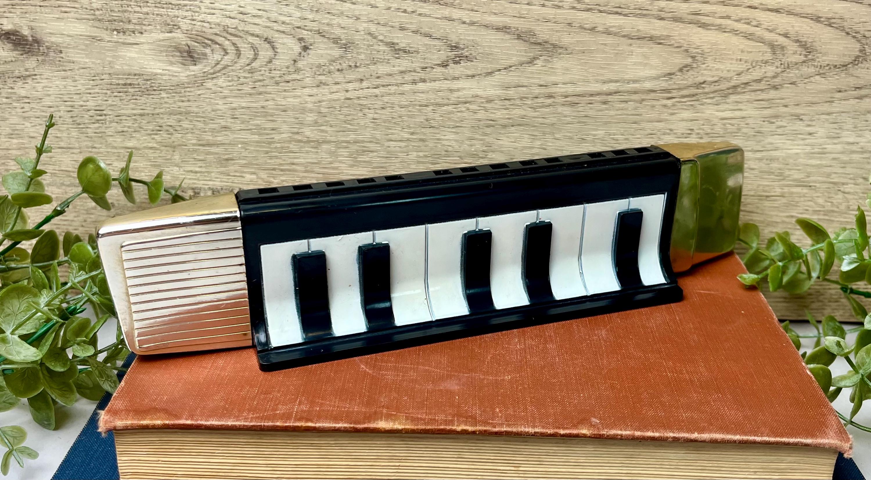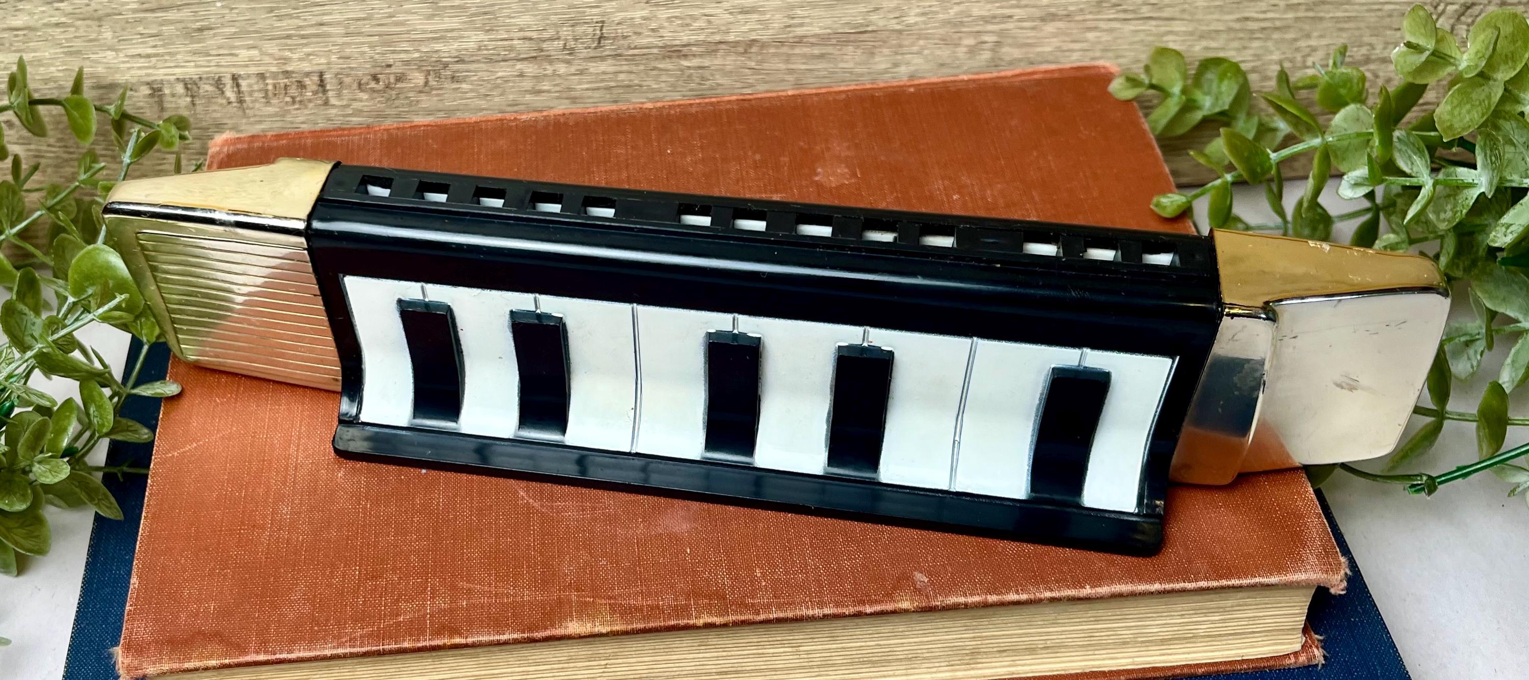 Add a touch of fun, musical nostalgia with this vintage piano key harmonica. Featuring a black and white keyboard design with gold and green ends, this fun retro piece is perfect for collectors, music lovers, or as unique home decor.