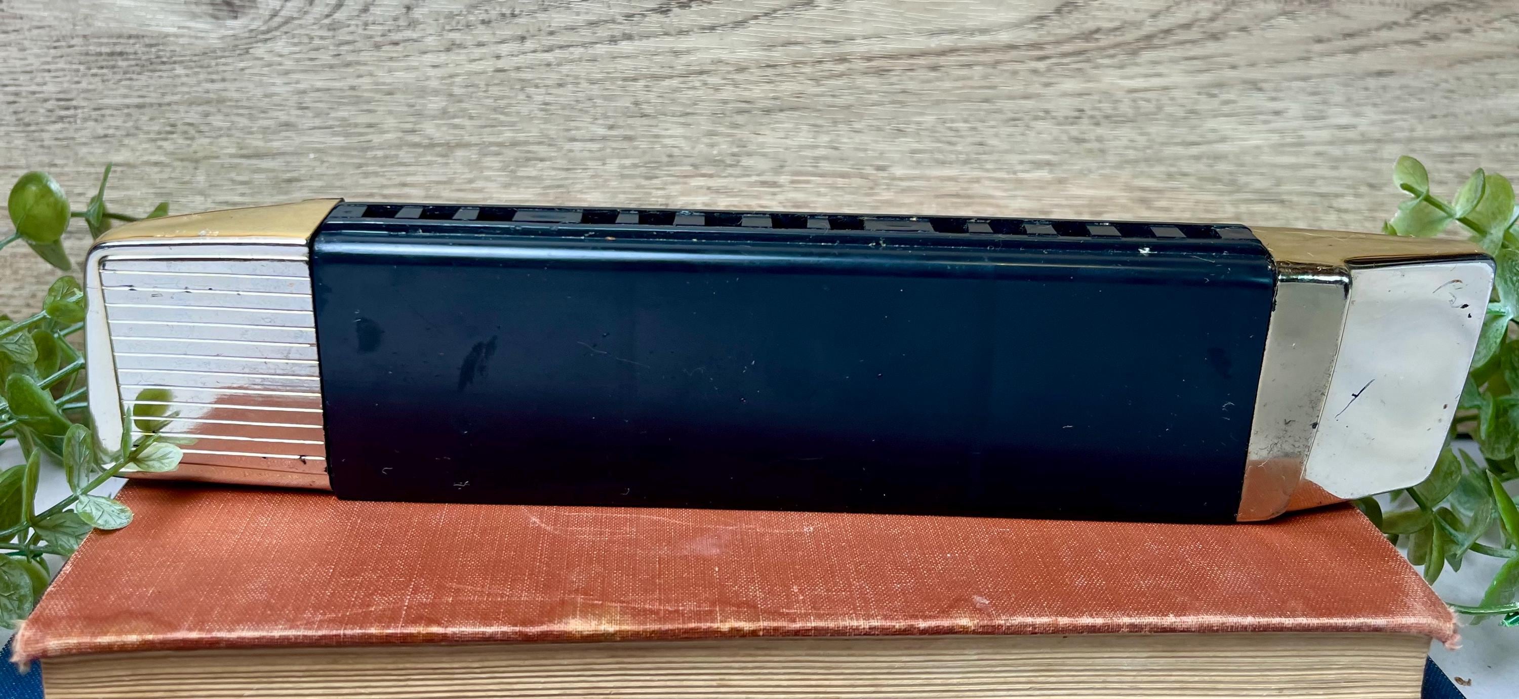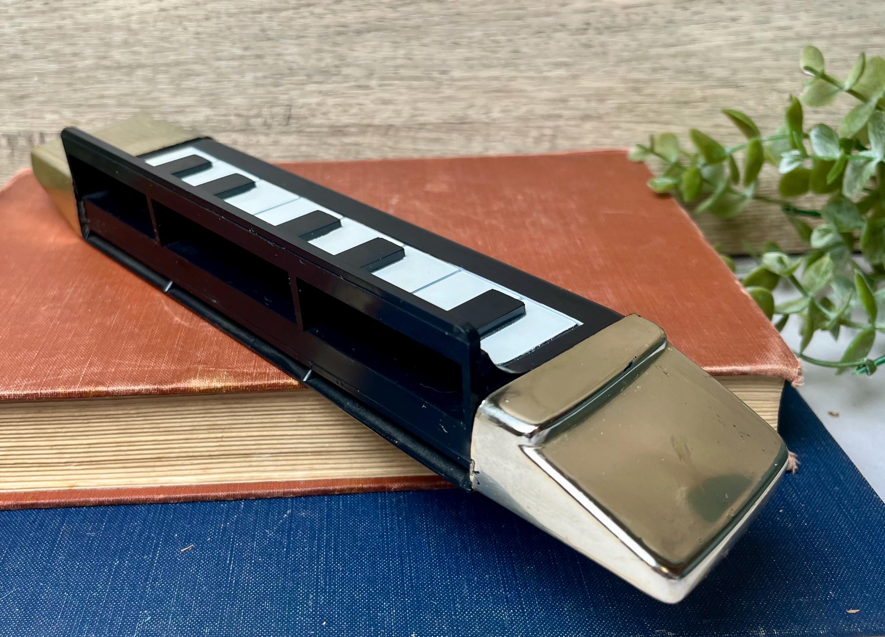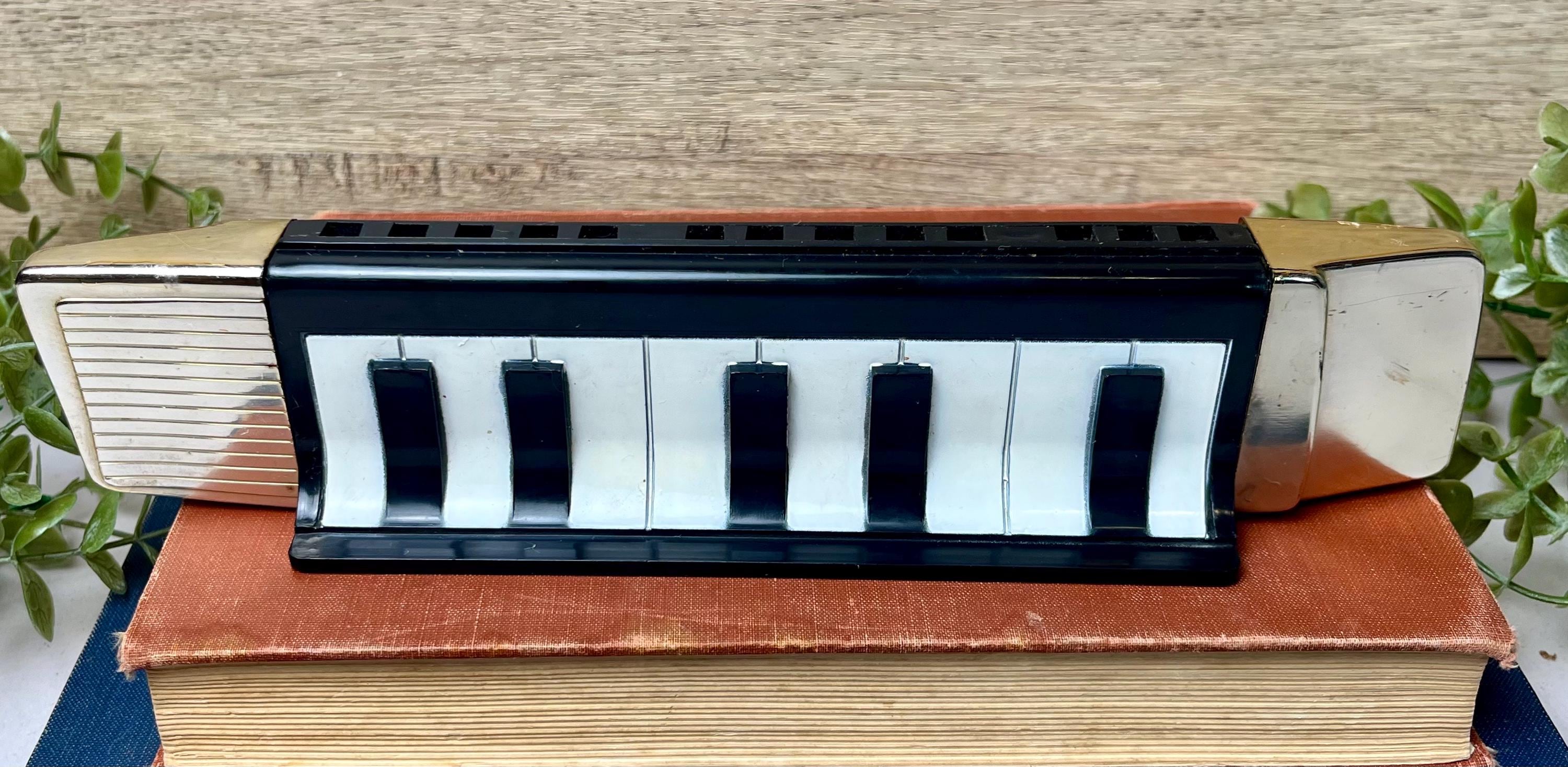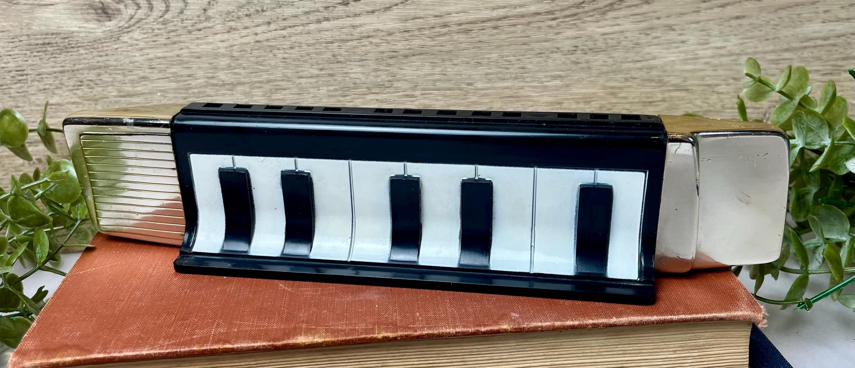 Add a touch of fun, musical nostalgia with this vintage piano key harmonica. Featuring a black and white keyboard design with gold and green ends, this fun retro piece is perfect for collectors, music lovers, or as unique home decor.