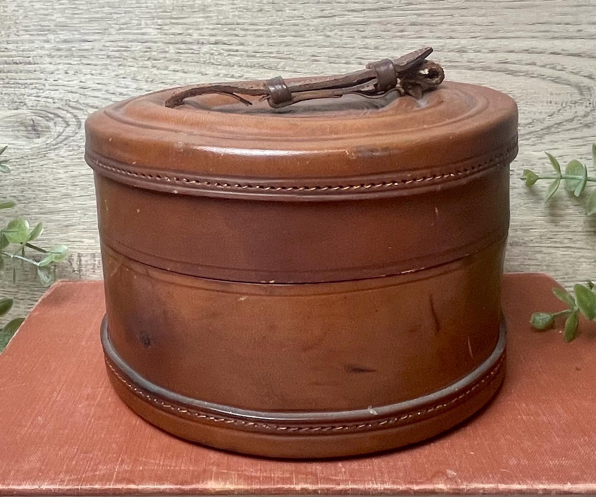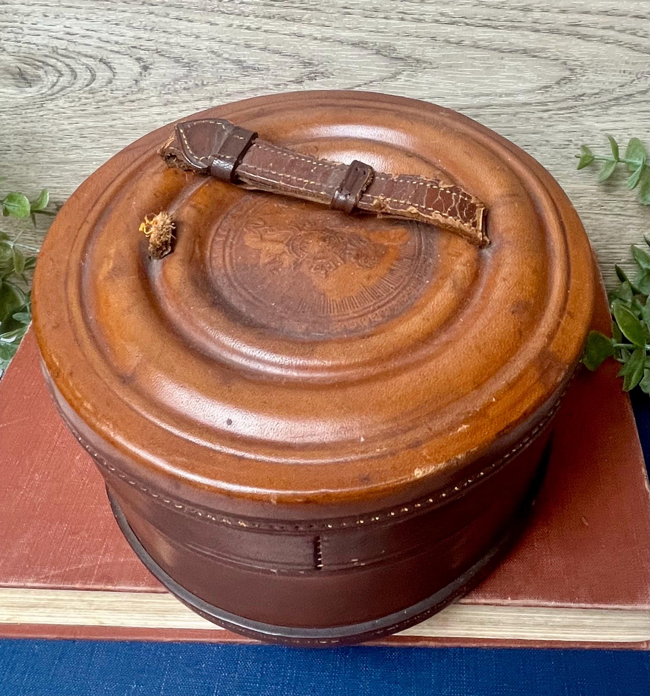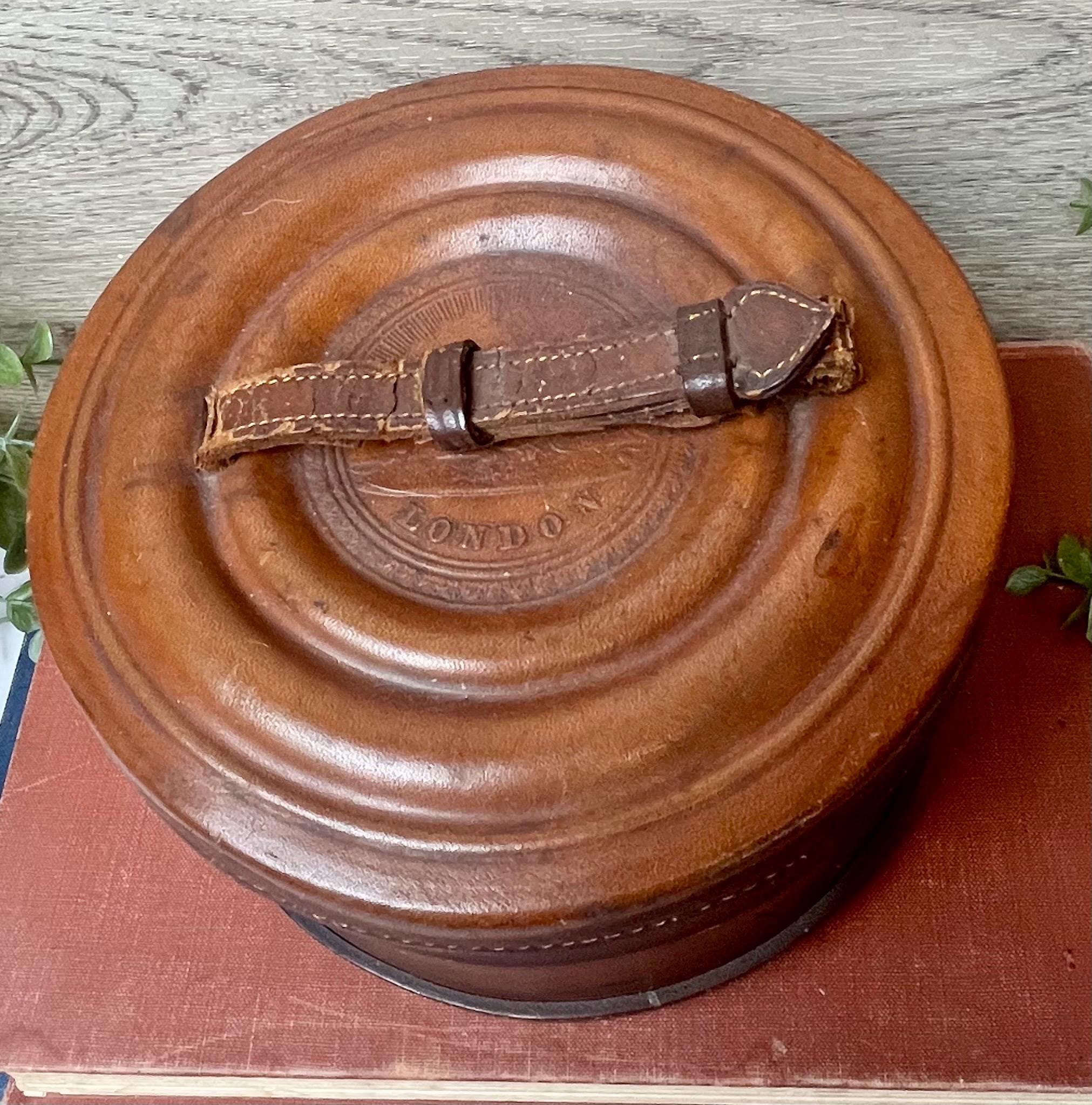 This authentic Victorian leather collar box, patented in 1888 and made in London, is a stunning example of 19th-century craftsmanship. Made from rich brown leather with embossed markings, this round box was originally used to store detachable collars during travel. A timeless collectible with beautiful patina and character.
