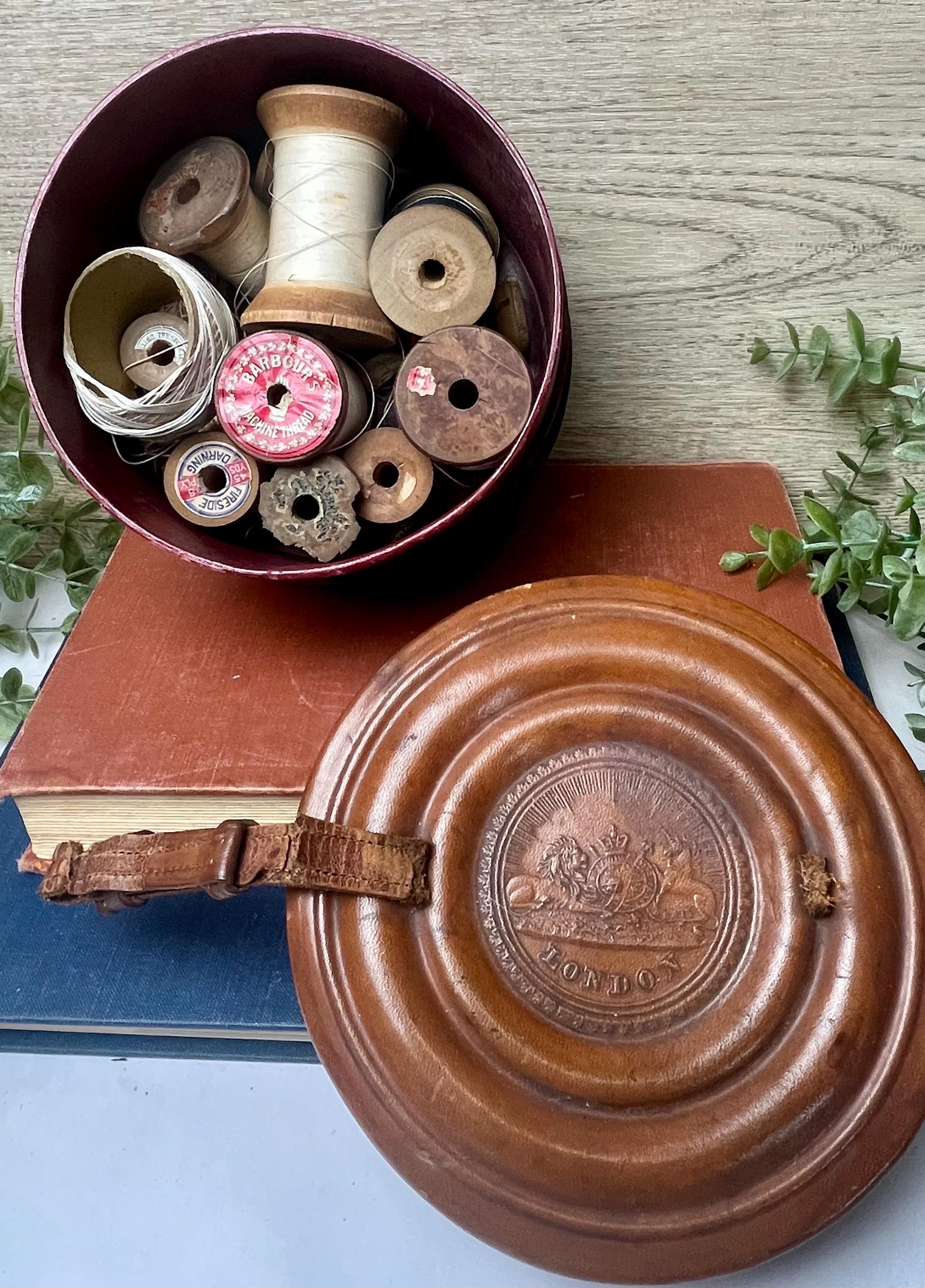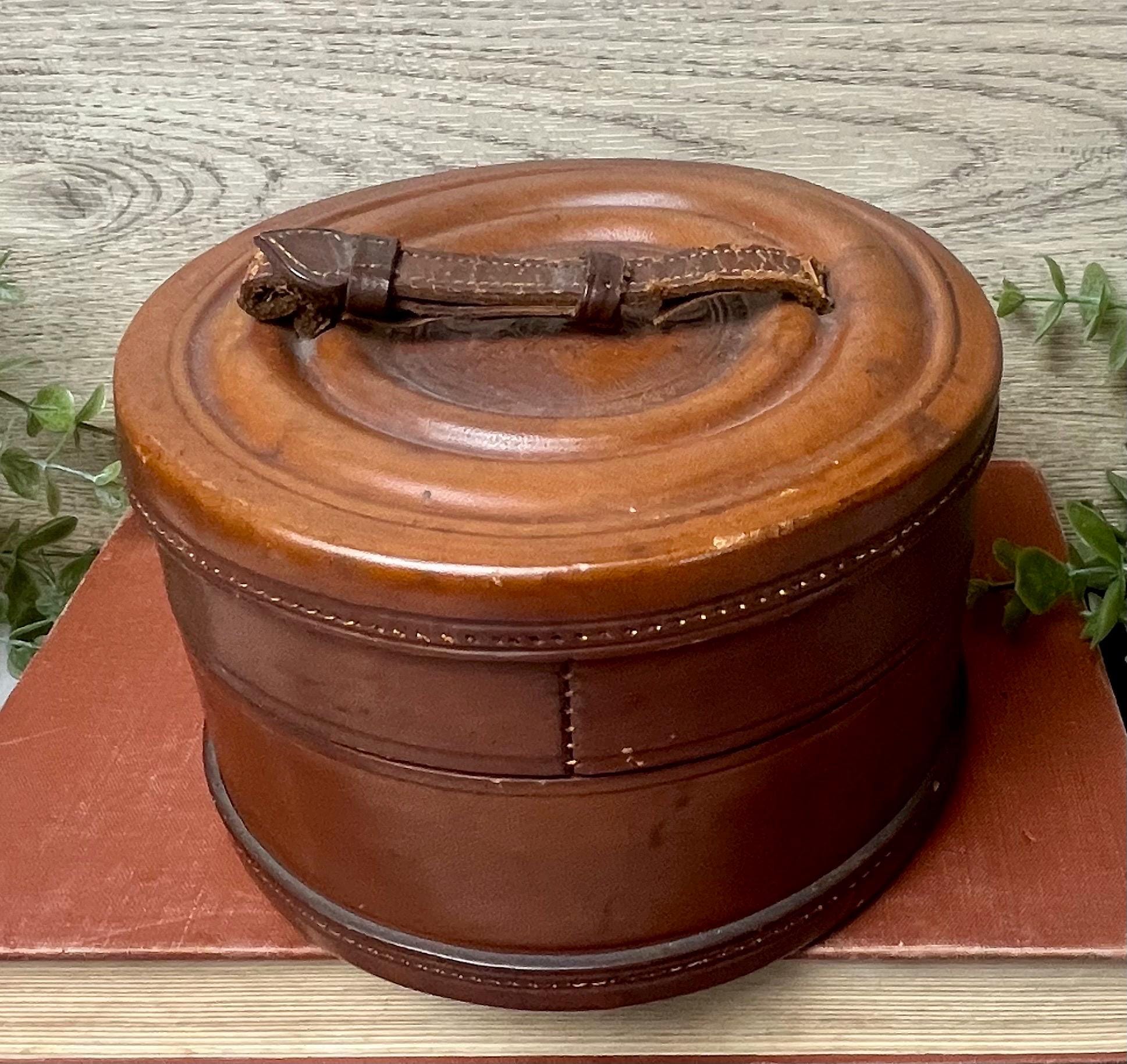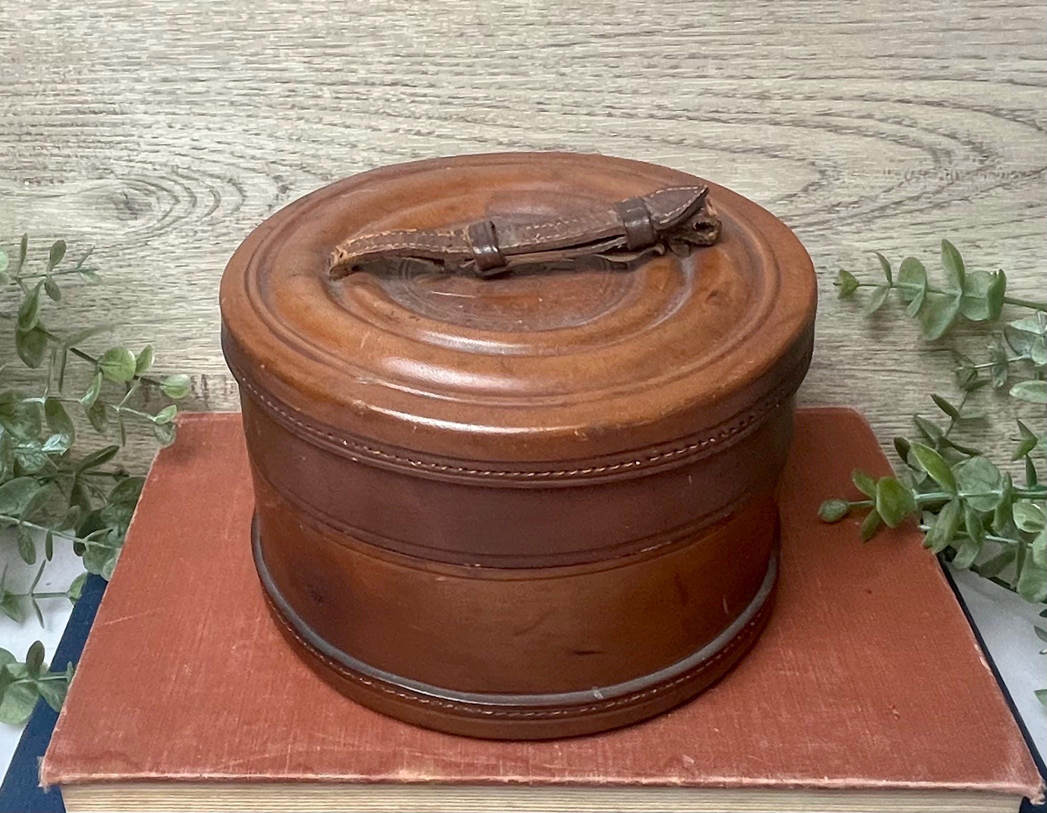 This authentic Victorian leather collar box, patented in 1888 and made in London, is a stunning example of 19th-century craftsmanship. Made from rich brown leather with embossed markings, this round box was originally used to store detachable collars during travel. A timeless collectible with beautiful patina and character.