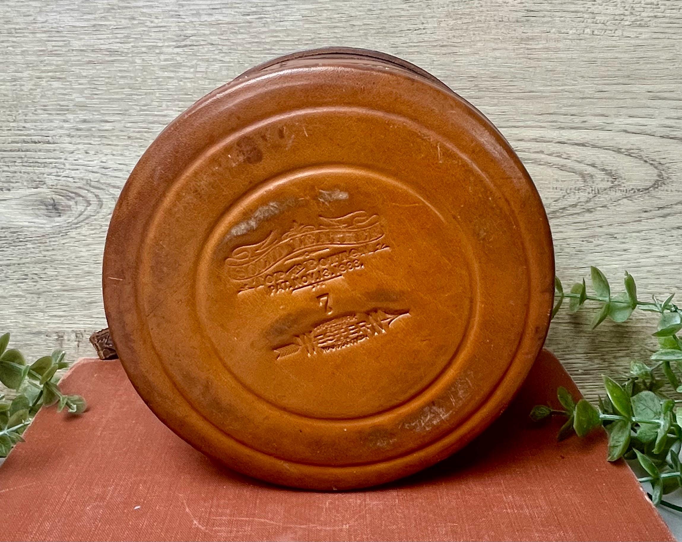 • Genuine leather, embossed patent 1888 • Made in London • Approx. 3.5” tall × 5.5” wide • Wear consistent with age; strap is broken on one side. • Ideal for collectors, display, or vintage decor