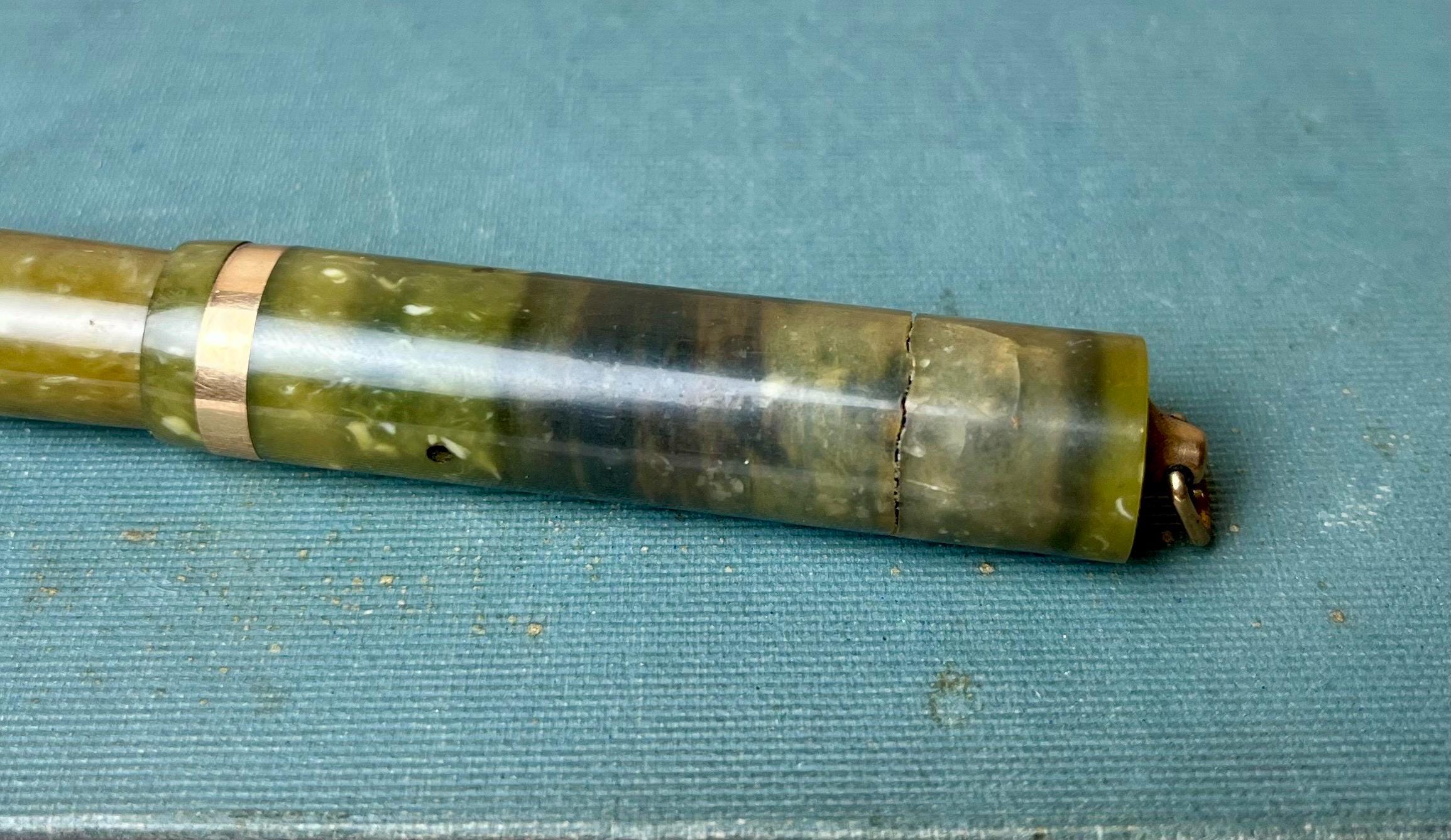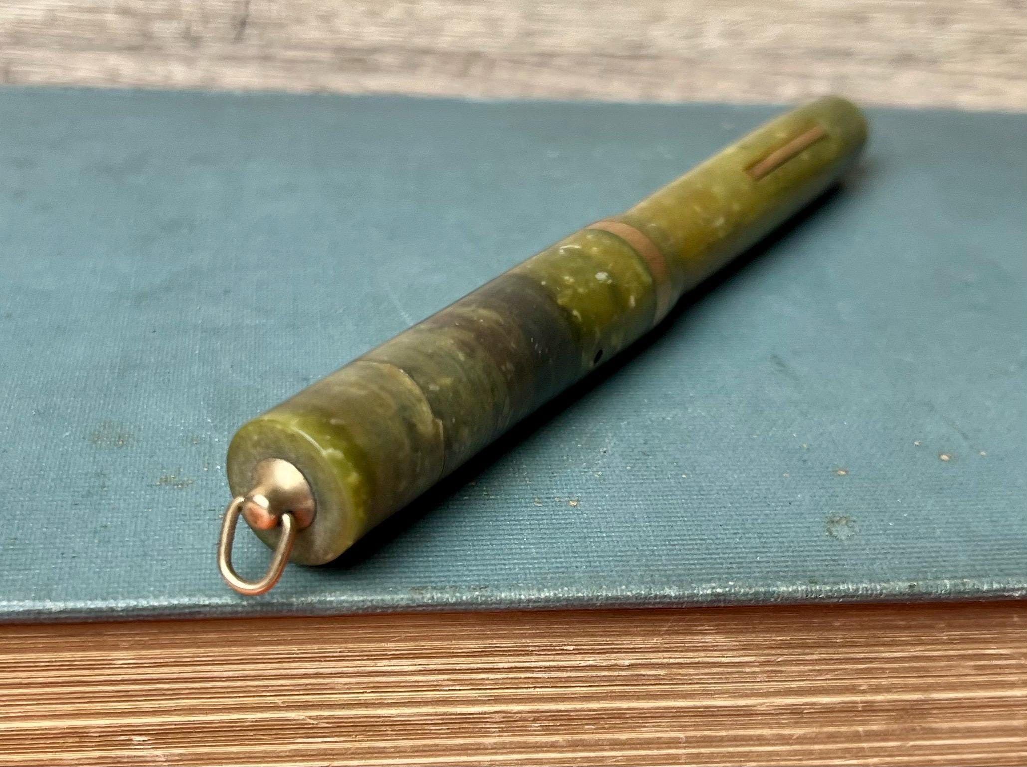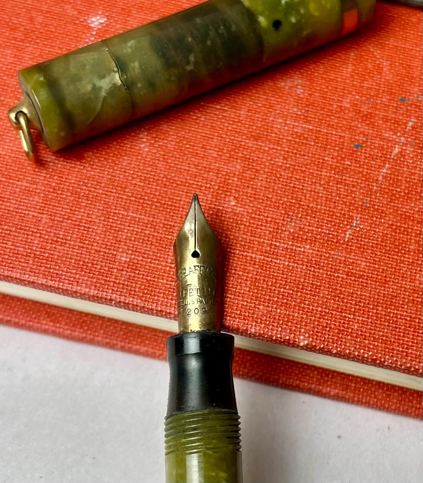 This Sheaffer Flat Top fountain pen is a classic example of fine American pen craftsmanship from the 1920s. Featuring the elegant jade green marbled celluloid body with a gold-tone band and lever, this piece reflects the height of Art Deco design in writing instruments.