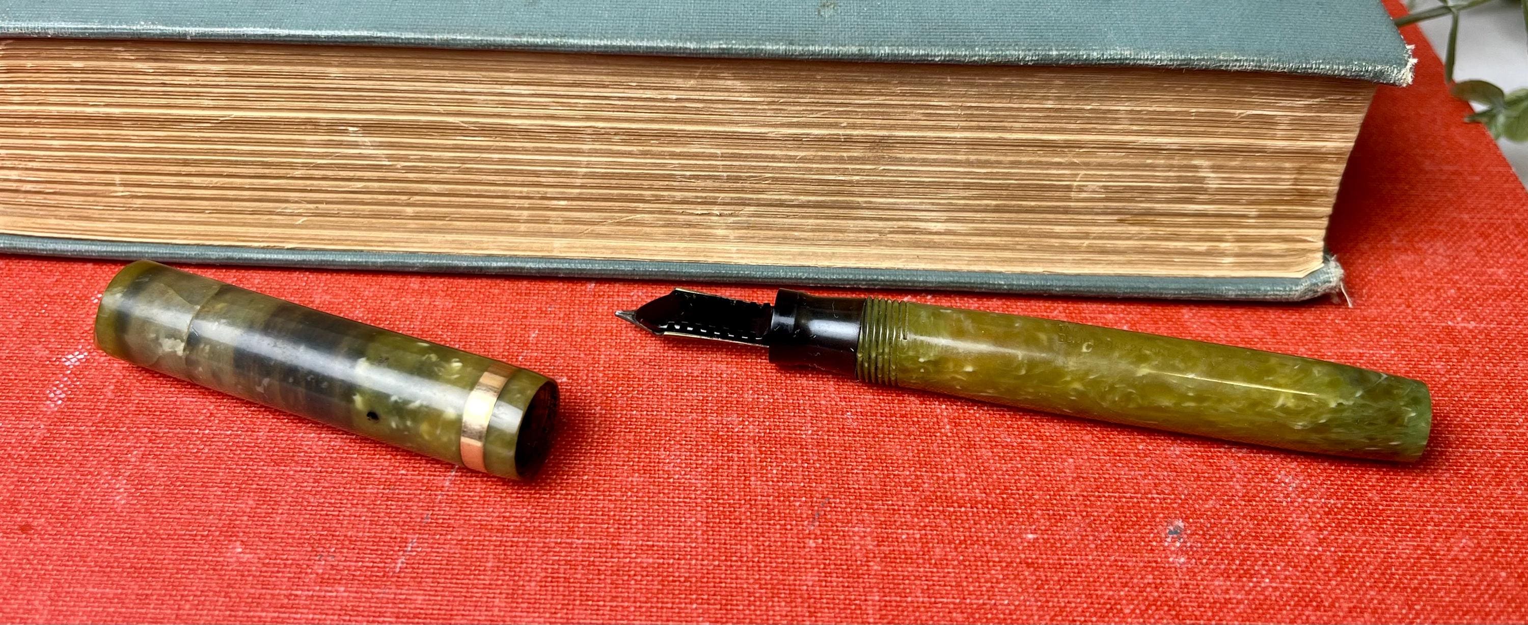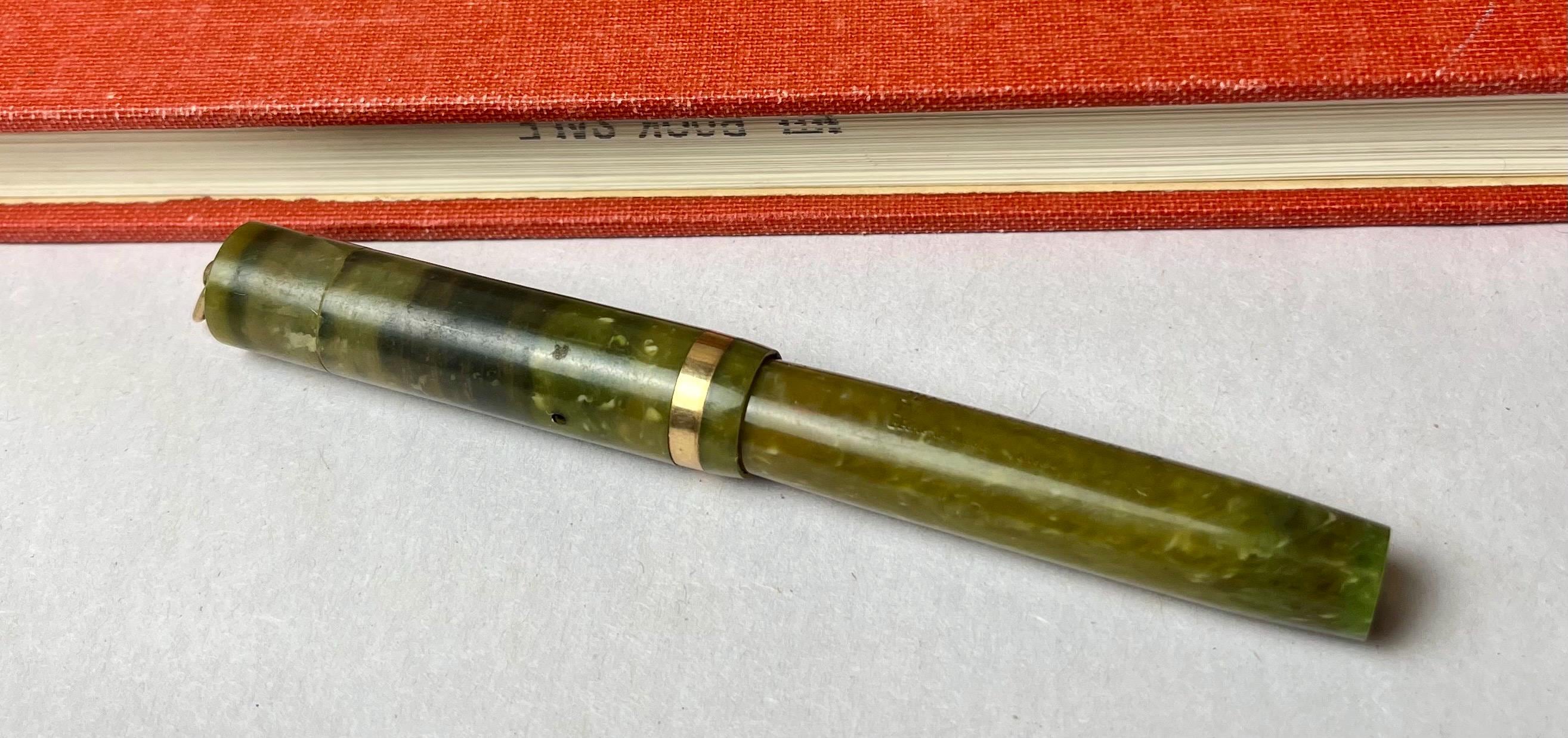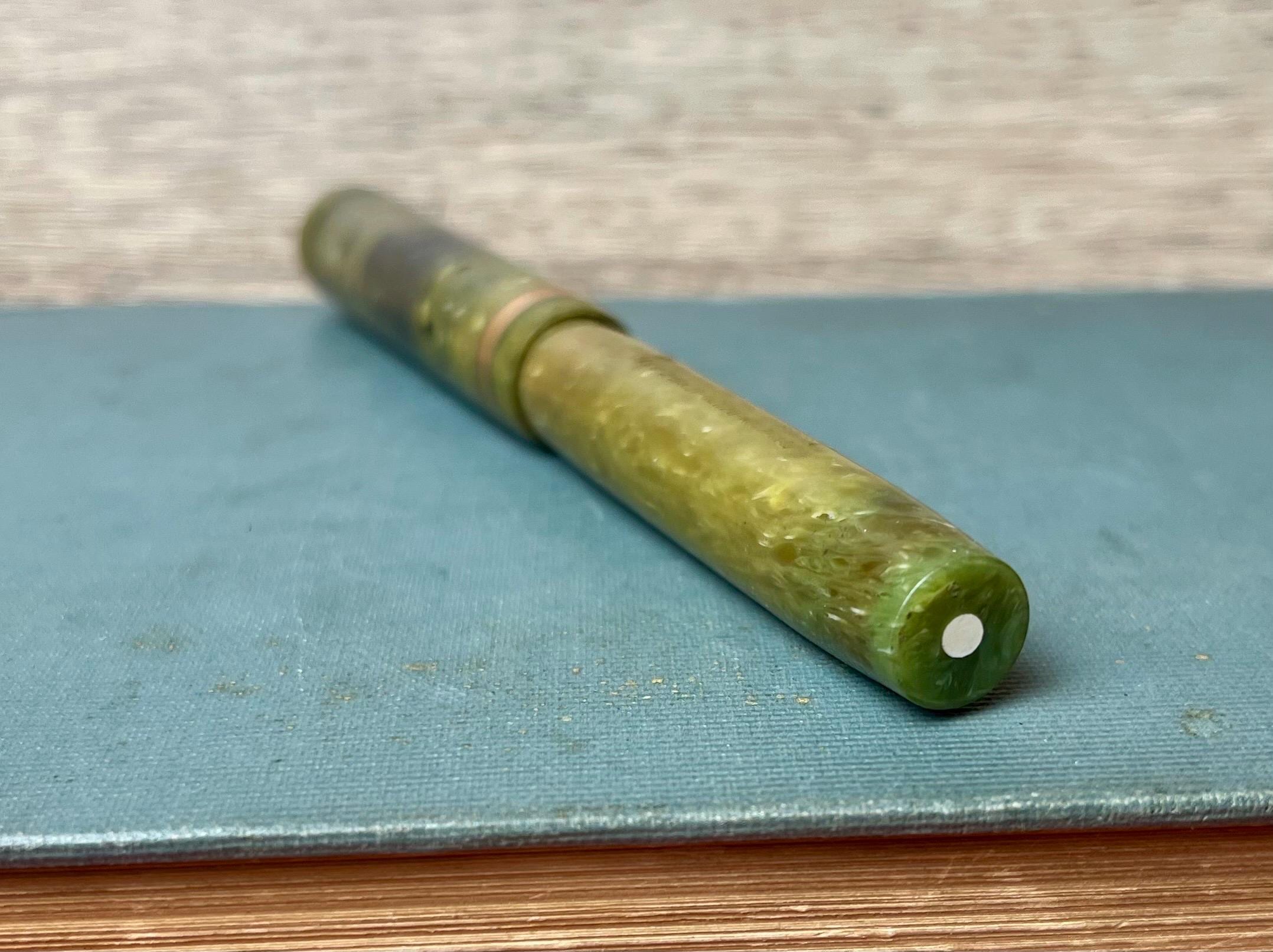 This Sheaffer Flat Top fountain pen is a classic example of fine American pen craftsmanship from the 1920s. Featuring the elegant jade green marbled celluloid body with a gold-tone band and lever, this piece reflects the height of Art Deco design in writing instruments.