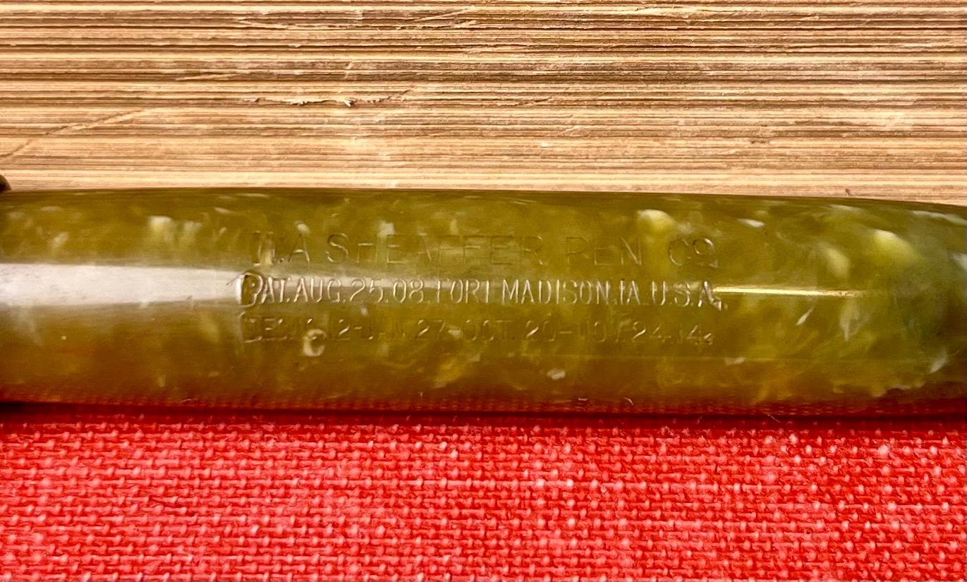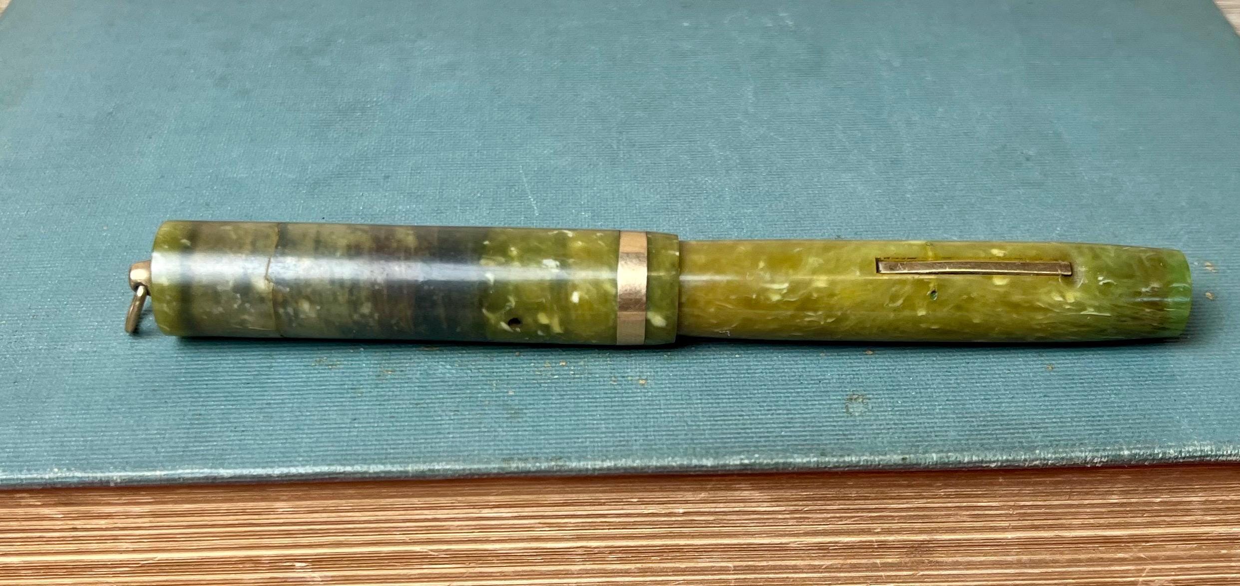 ✨ Item Details: • Brand: Sheaffer • Model: Flat Top • Era: 1920s • Material: Jade green marbled celluloid with gold-tone trim • Filling System: Lever fill (classic Sheaffer mechanism) • Length: Approx. 4.5 in (capped) • Condition: Good vintage condition with expected age wear and discoloration typical for jade celluloid of this era. Lever is intact. Not ink tested.