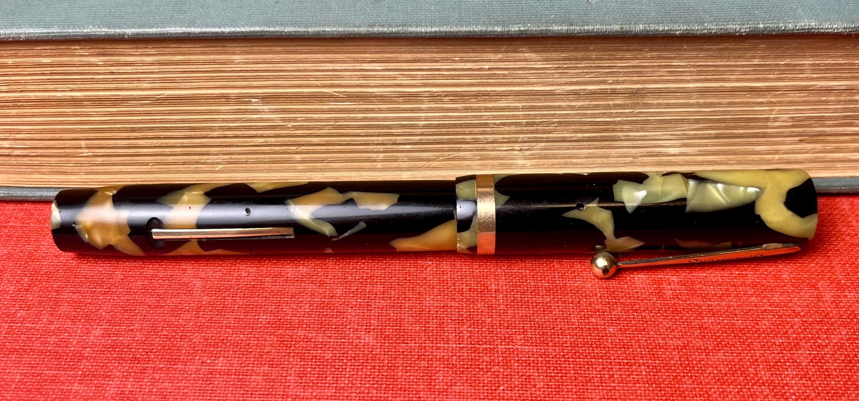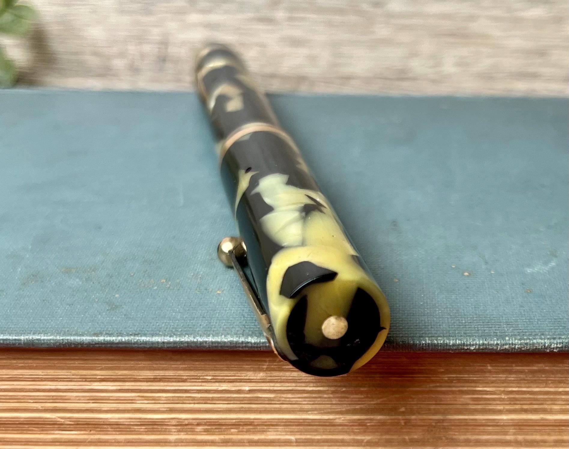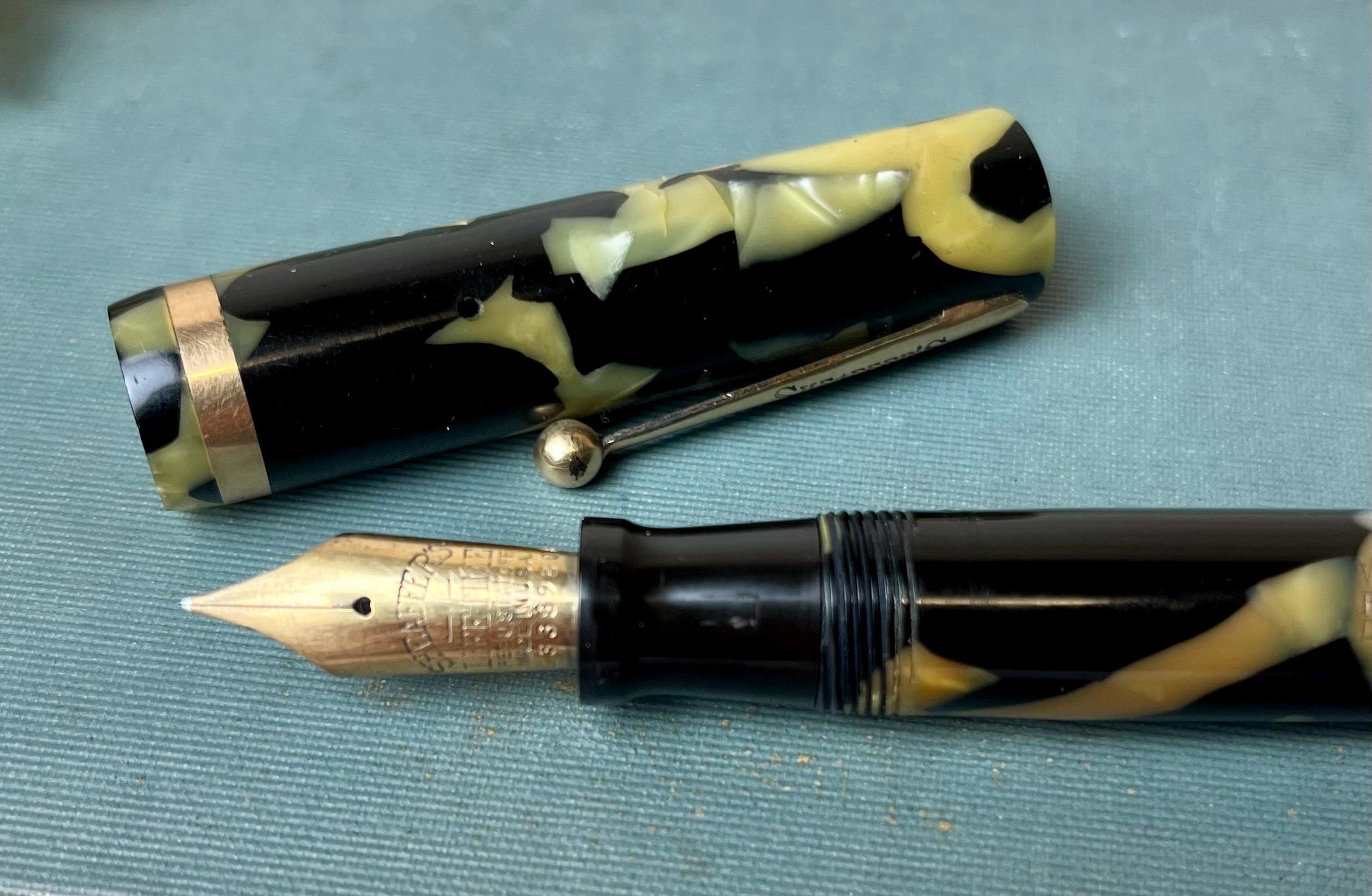 This exquisite Sheaffer Flat Top Lifetime Fountain Pen from the 1920s embodies the elegance of the golden age of fine writing instruments. Crafted with a stunning black and pearl marbled body and accented with gold trim, this pen is a highly desirable collector’s piece.