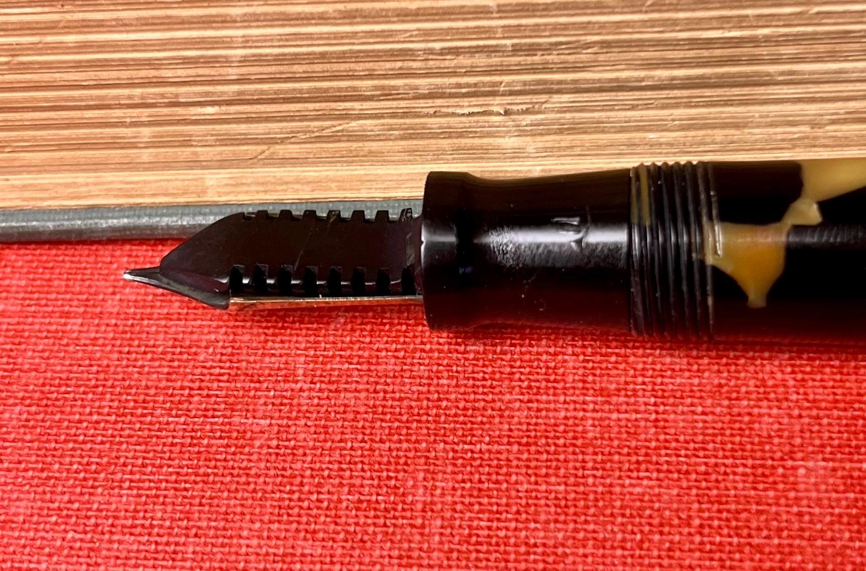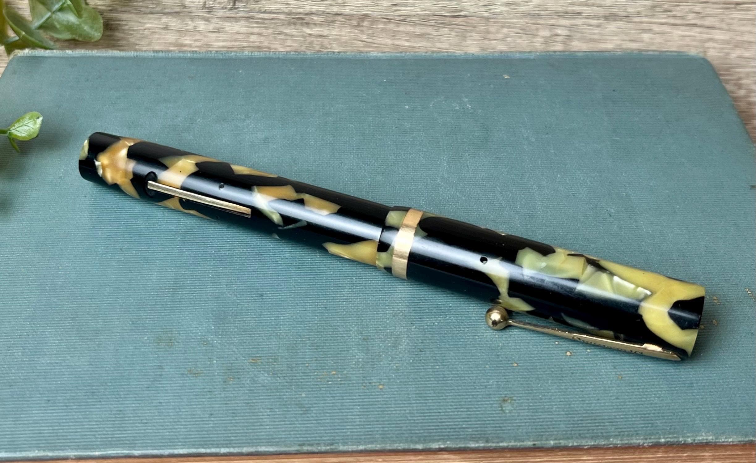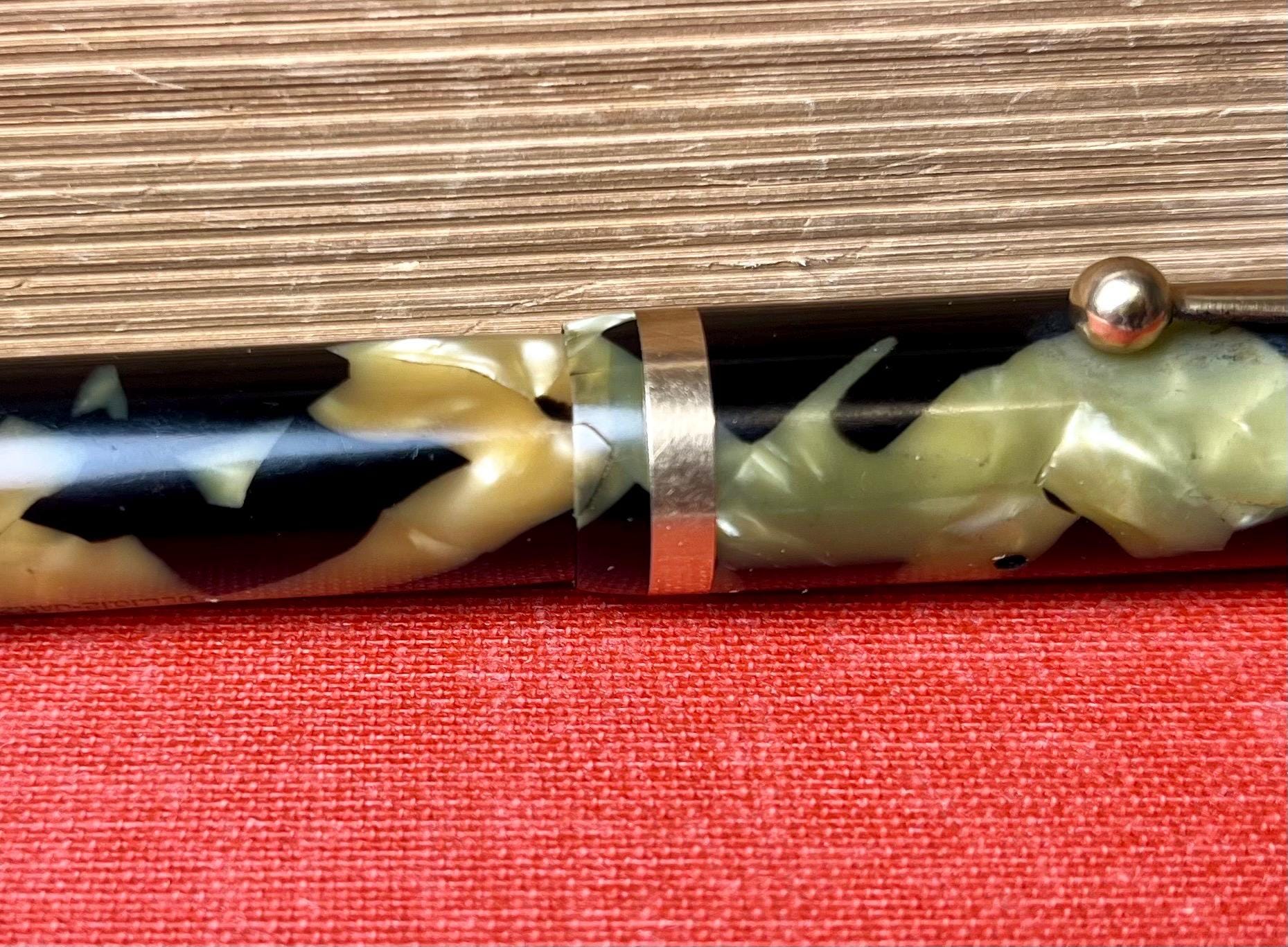 This exquisite Sheaffer Flat Top Lifetime Fountain Pen from the 1920s embodies the elegance of the golden age of fine writing instruments. Crafted with a stunning black and pearl marbled body and accented with gold trim, this pen is a highly desirable collector’s piece.