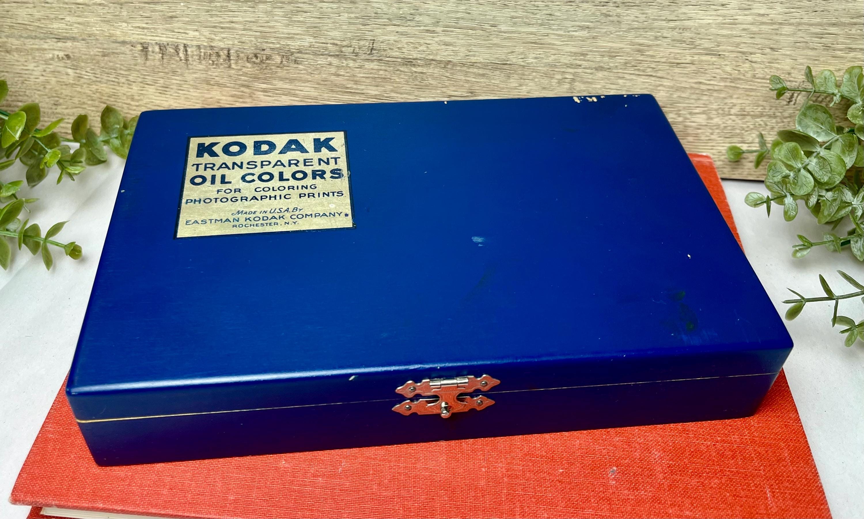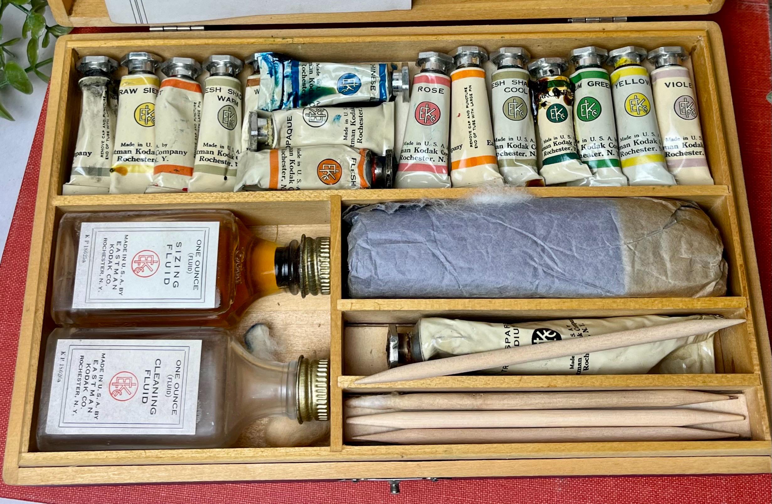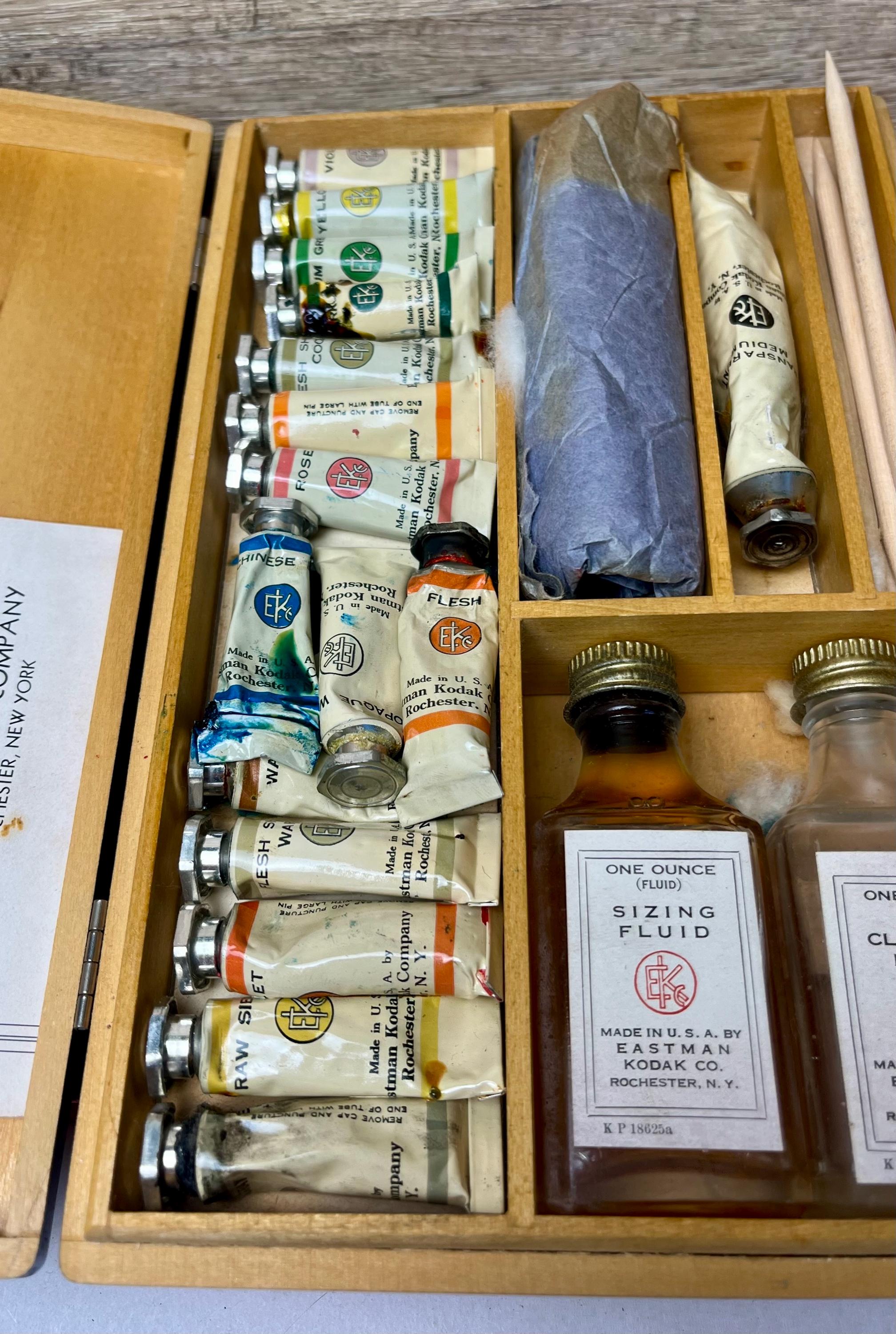 This is a beautiful and rare complete set of Kodak Transparent Oil Colors, originally made in Rochester, New York. This mid-century artist’s kit was designed for hand-coloring photographic prints, a popular technique before the advent of color photography. The set includes its original blue wooden box, labeled on the lid, with the full instruction booklet and an array of supplies in remarkably preserved condition.