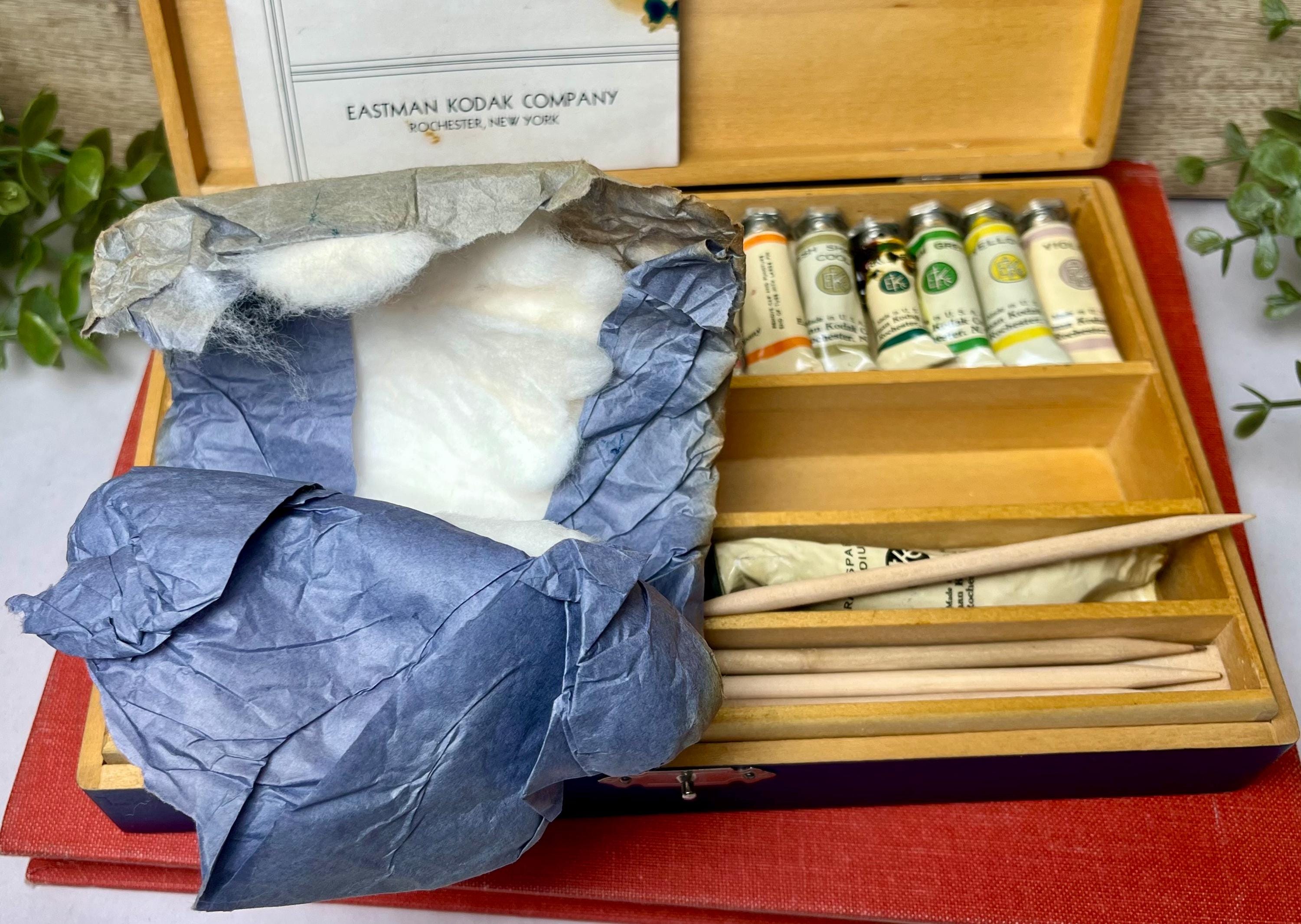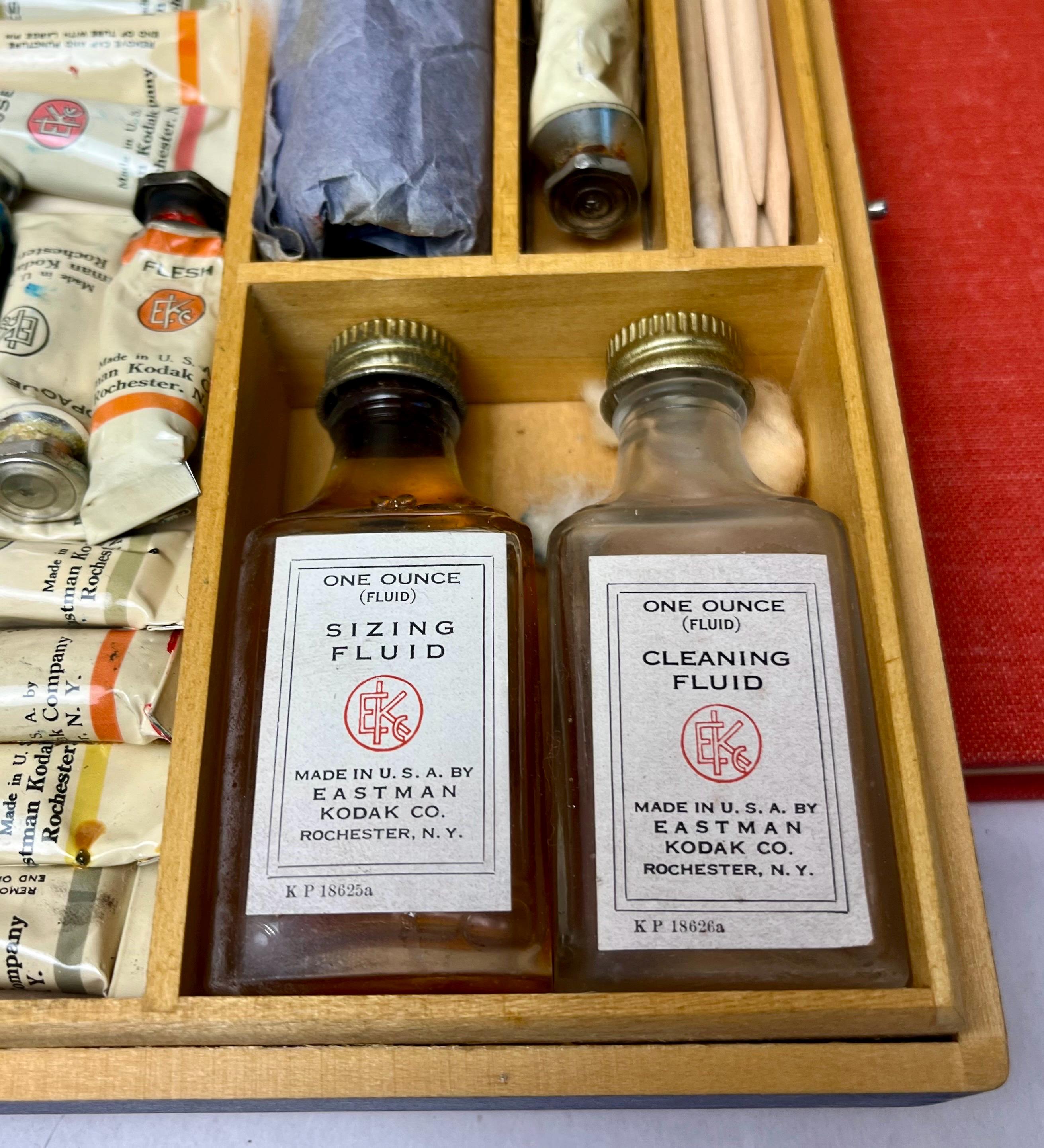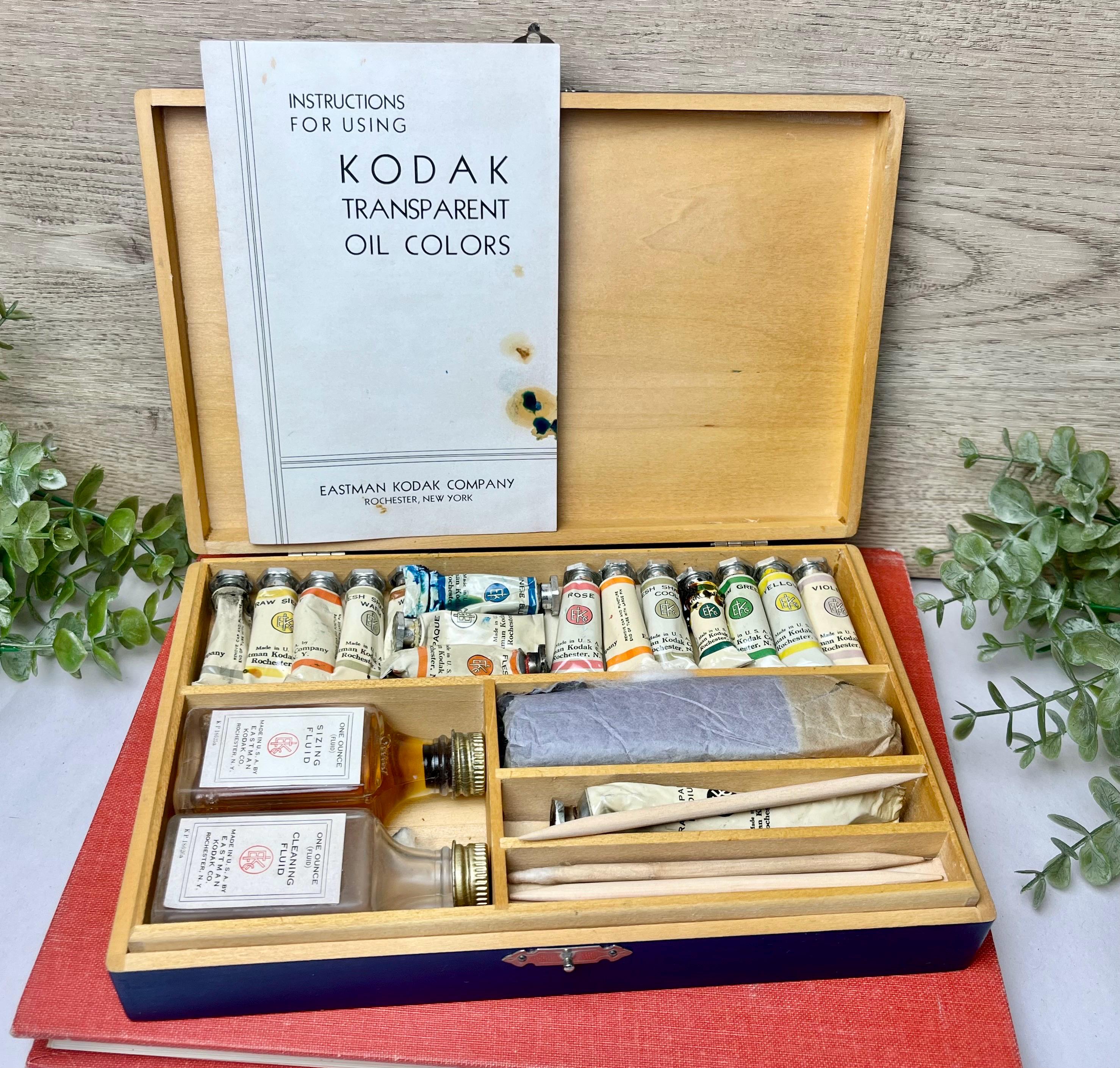 This is a beautiful and rare complete set of Kodak Transparent Oil Colors, originally made in Rochester, New York. This mid-century artist’s kit was designed for hand-coloring photographic prints, a popular technique before the advent of color photography. The set includes its original blue wooden box, labeled on the lid, with the full instruction booklet and an array of supplies in remarkably preserved condition.