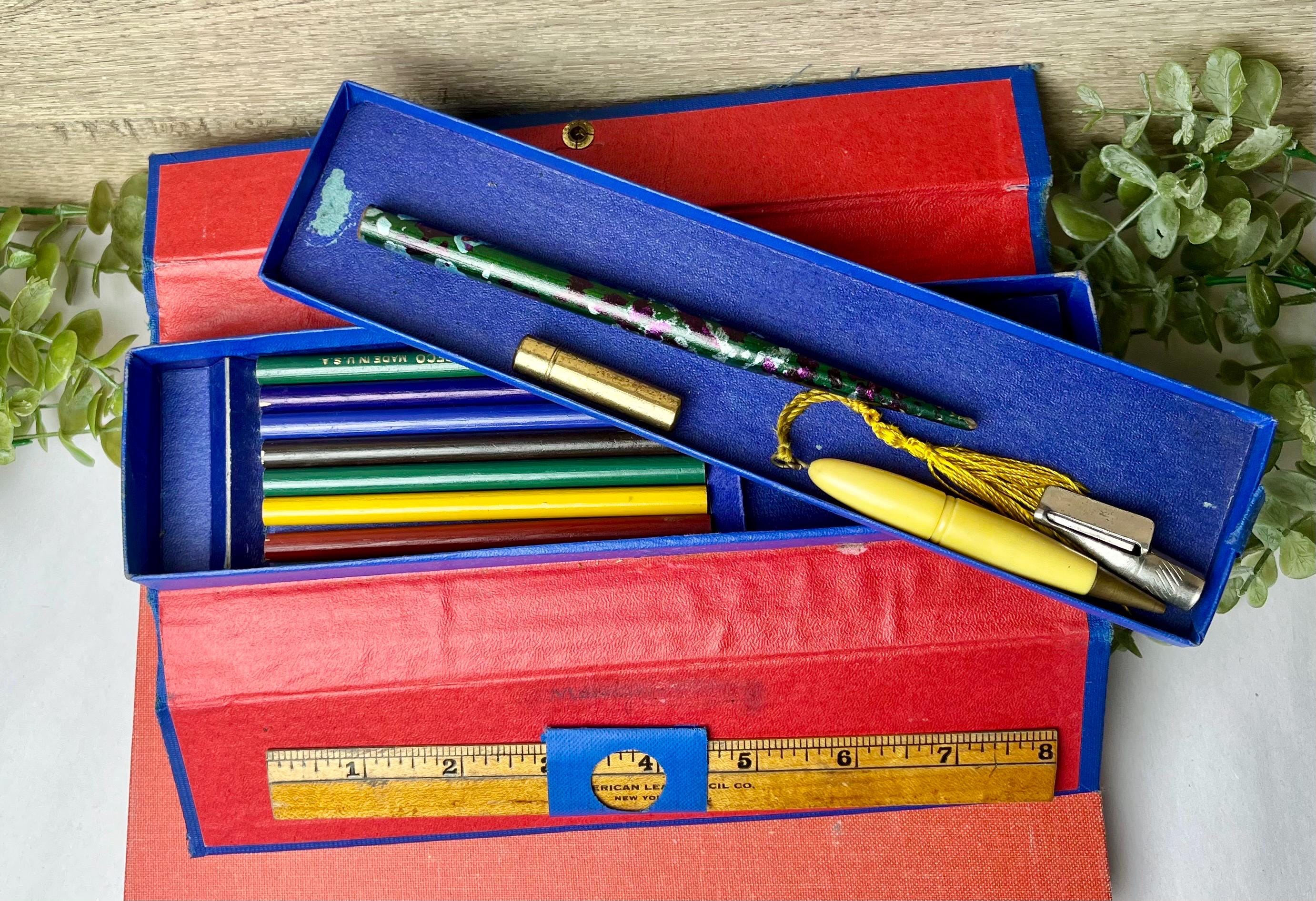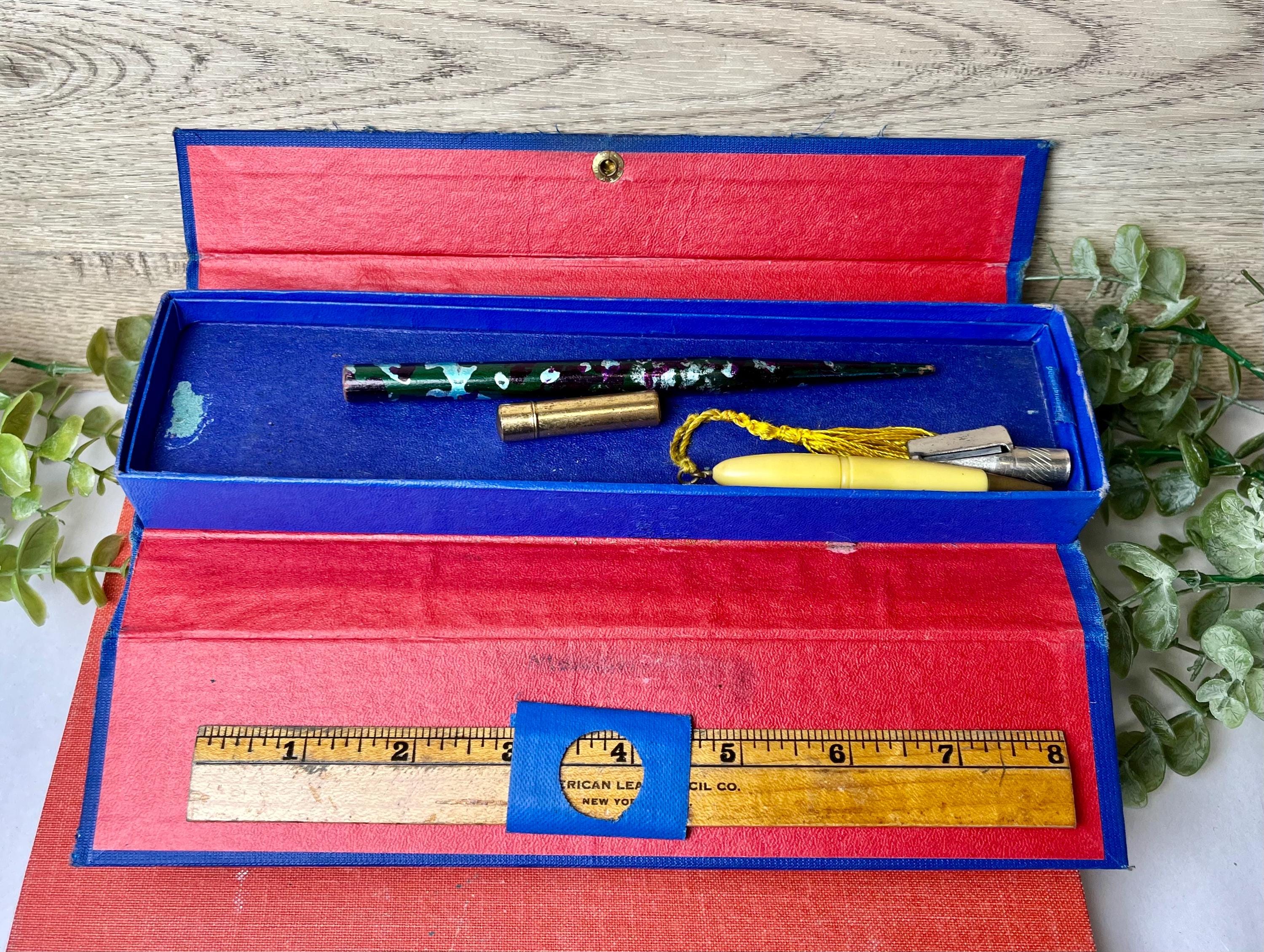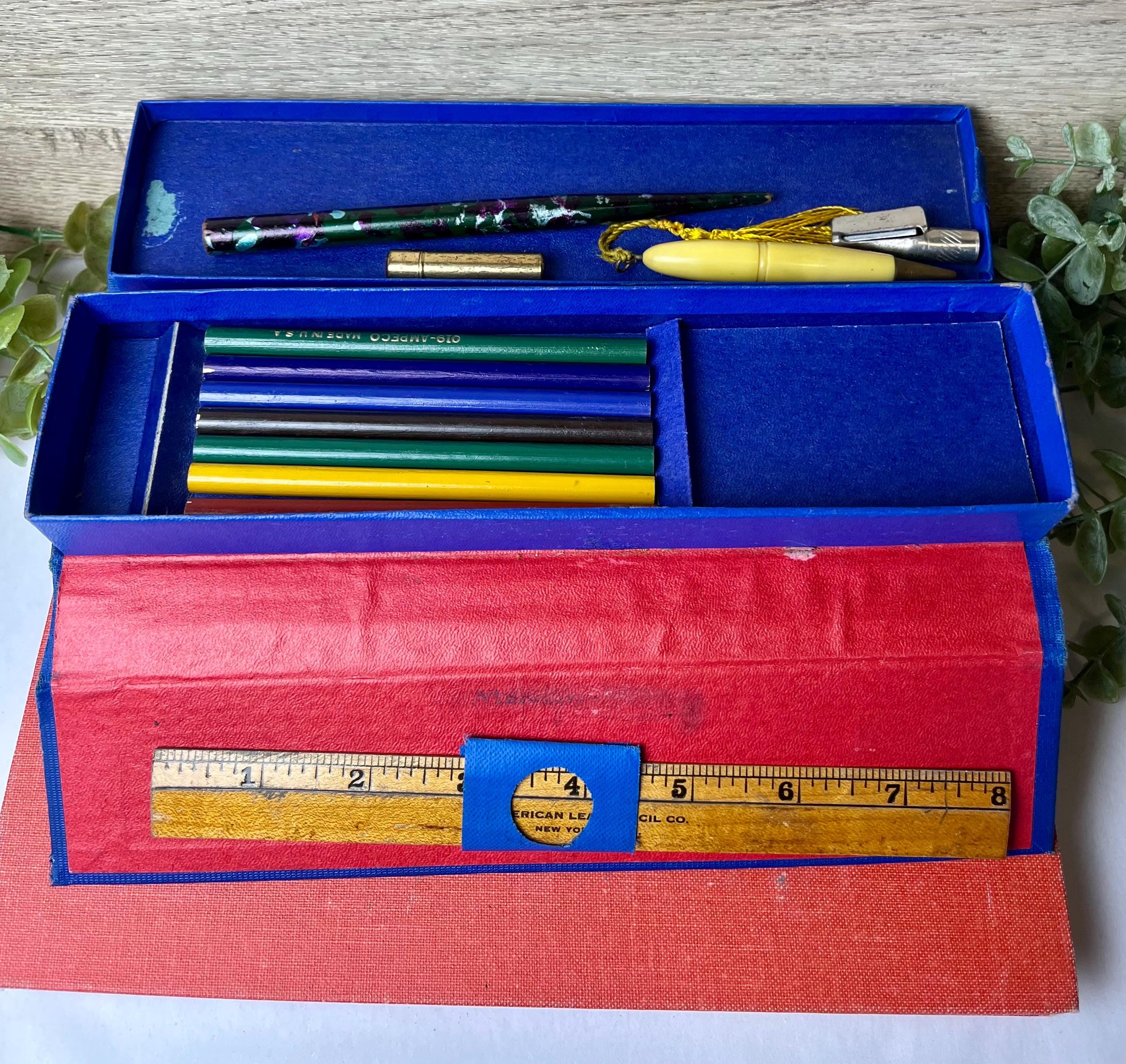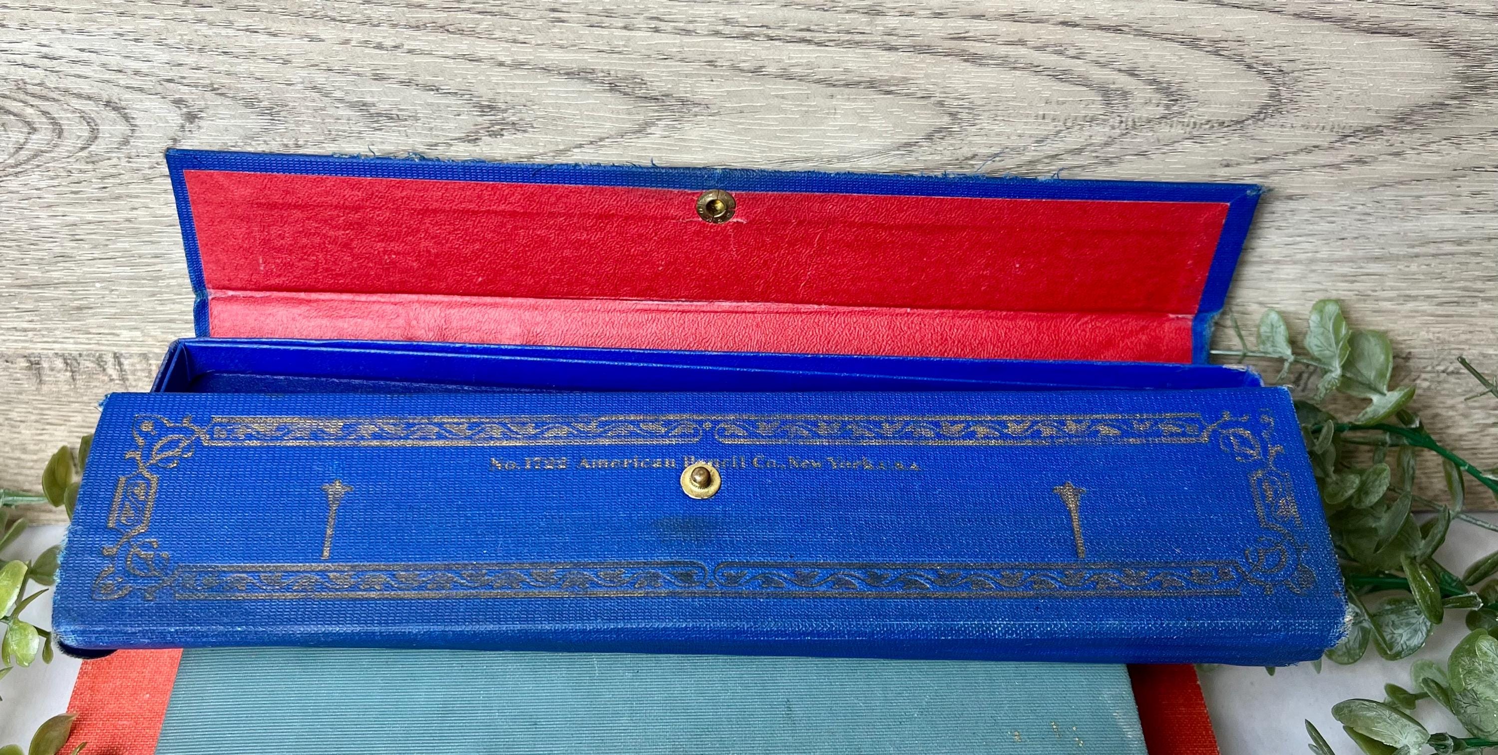 Details: • Blue exterior with red interior • Brass snap closure • Two-tier design for pencils and accessories • Maker’s mark inside flap: No. 1723 American Lead Pencil Co., New York, U.S.A. • Approx. 8” × 2.25” × 1.5”
