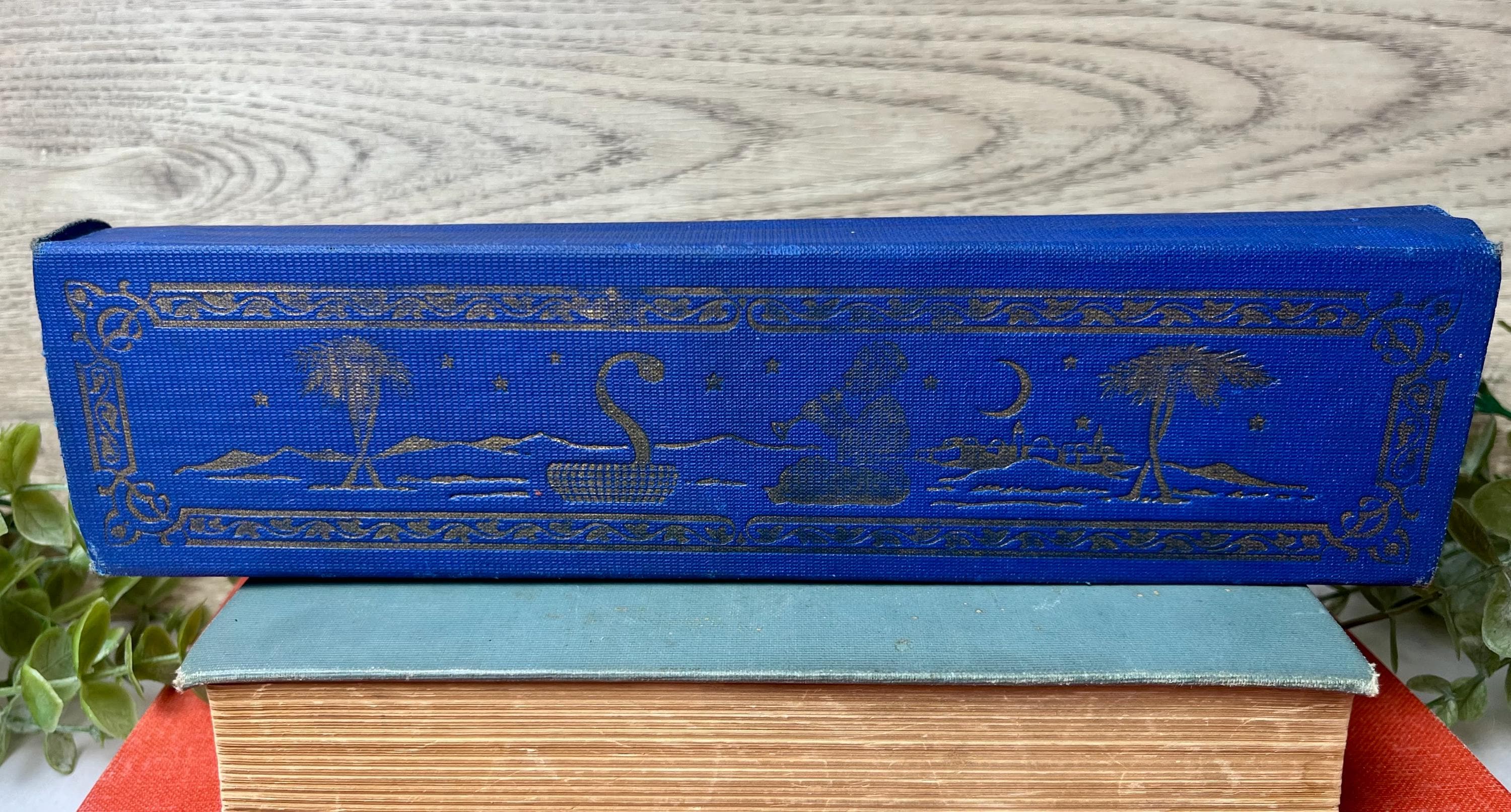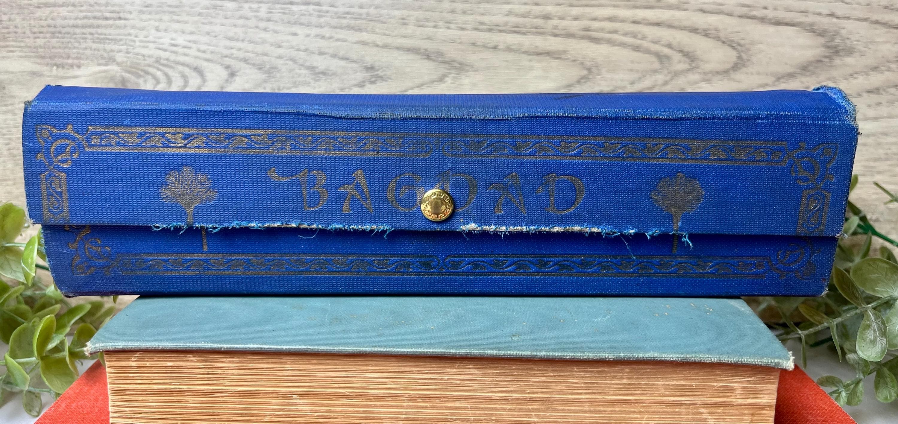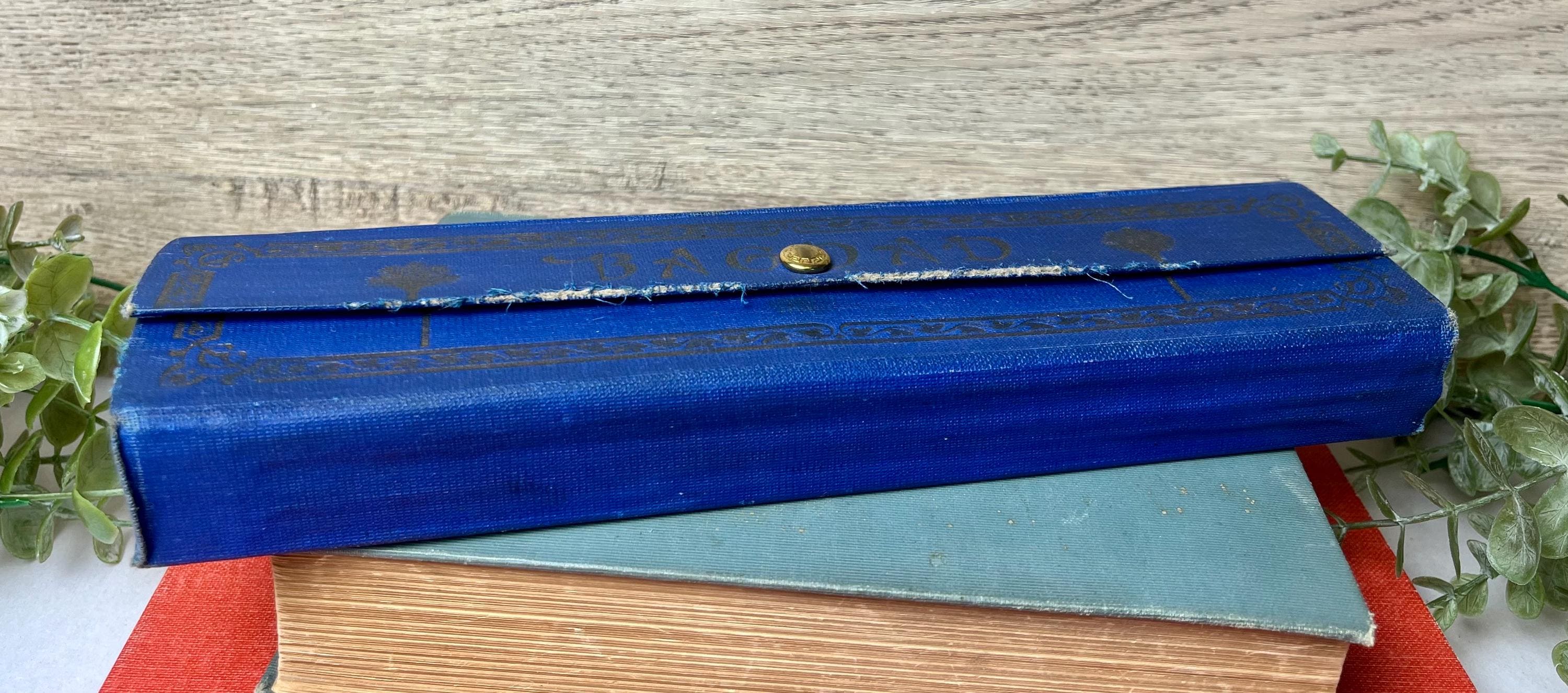 Add a touch of vintage charm to your desk with this beautiful cobalt blue pencil box from the 1930s. Made by American Lead Pencil Company, this collectible piece features gold “Bagdad” artwork with palm trees, stars, a snake charmer, and elegant Art Deco borders.