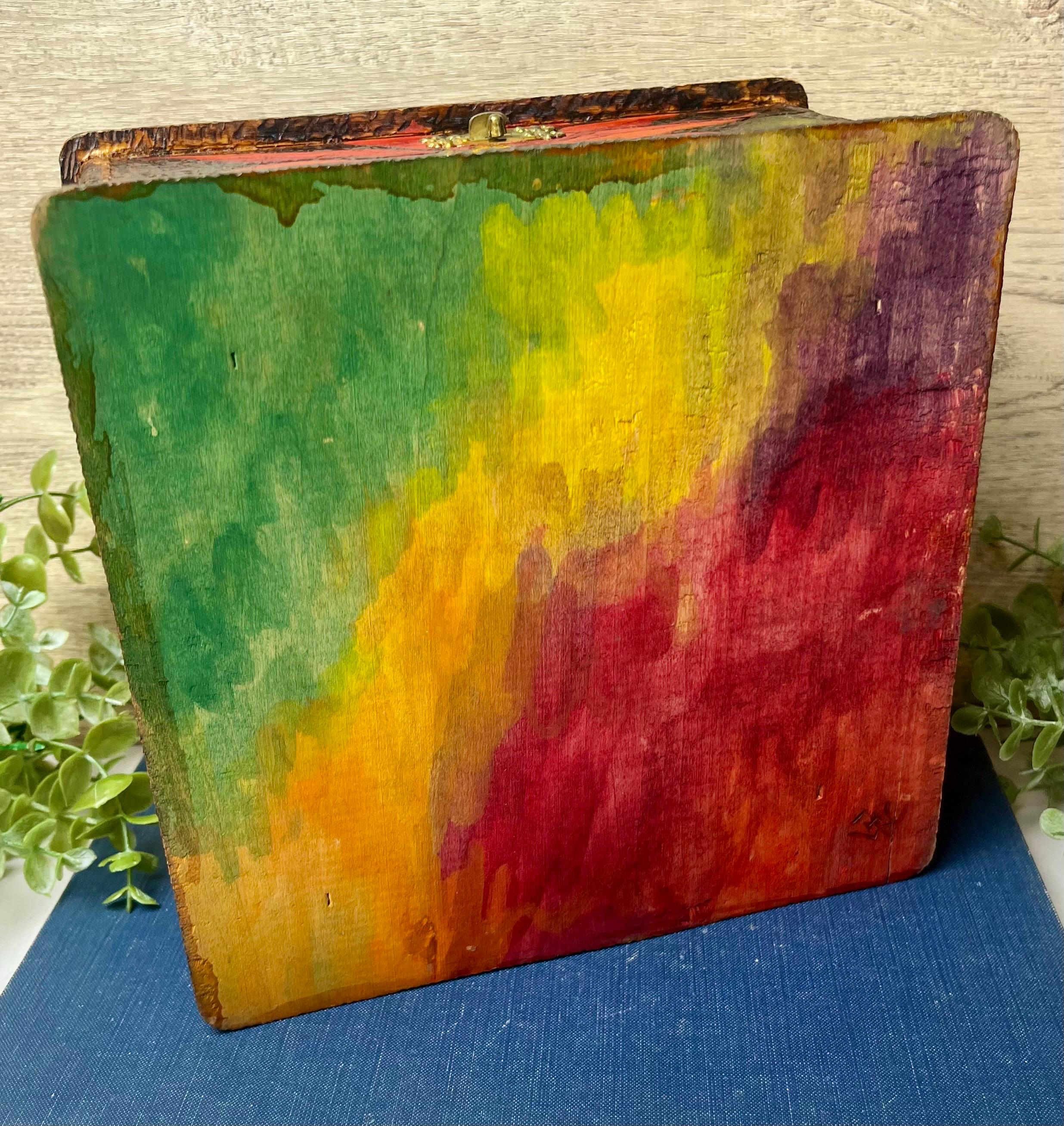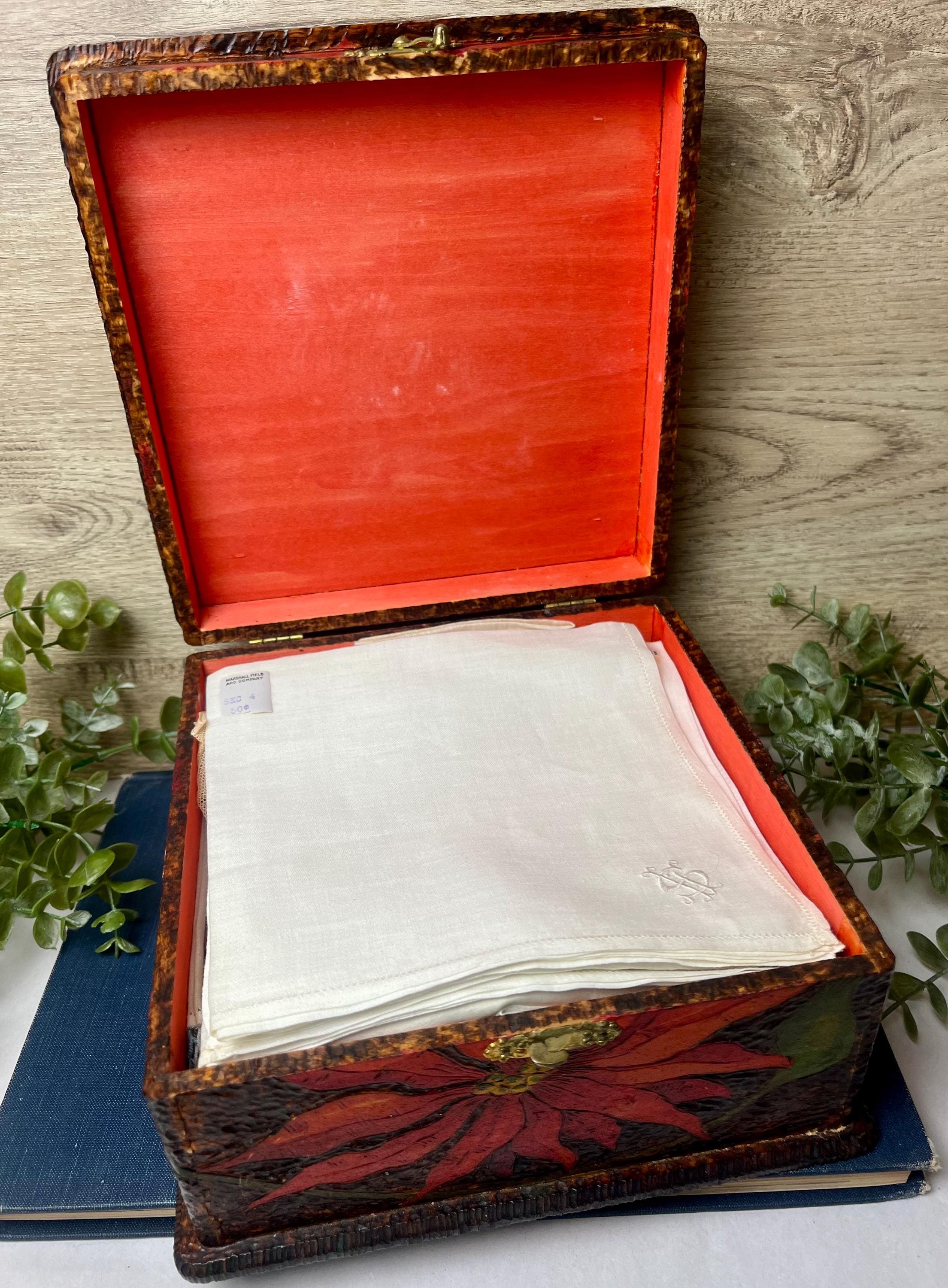 Details: • Era: 1930s–1940s • Material: Wood with pyrography and hand-painted finish • Design: Red poinsettias and green leaves on textured wood • Interior: Painted red • Hardware: Brass clasp closure • Dimensions: Approx. 7.” W x 7” D x 4” H • Condition: Excellent vintage condition with light age wear; finish and paint are well-preserved