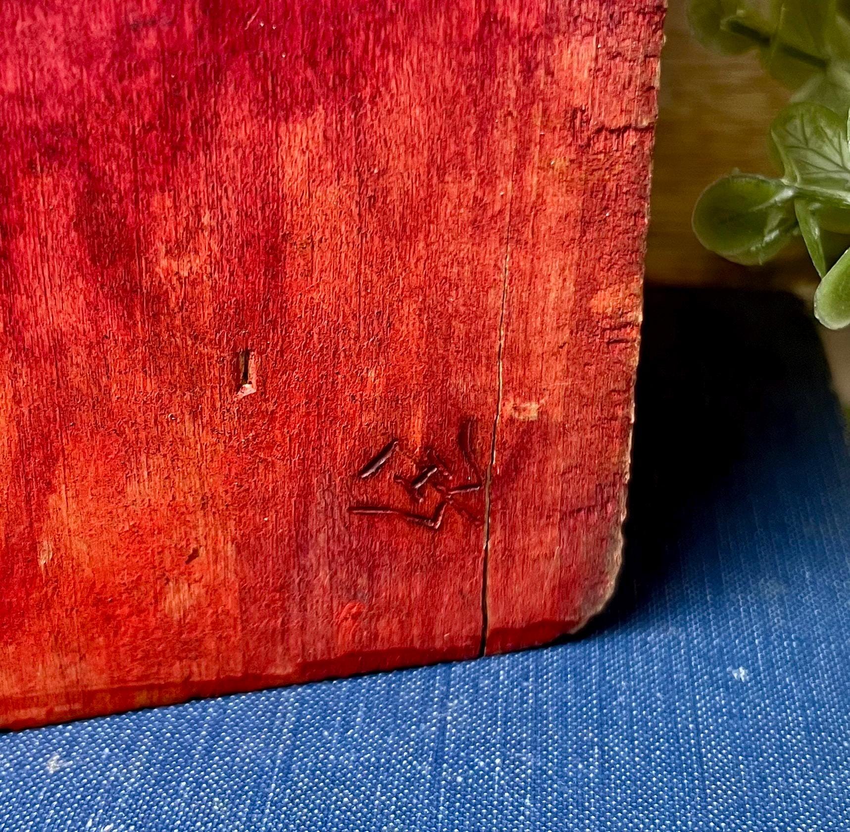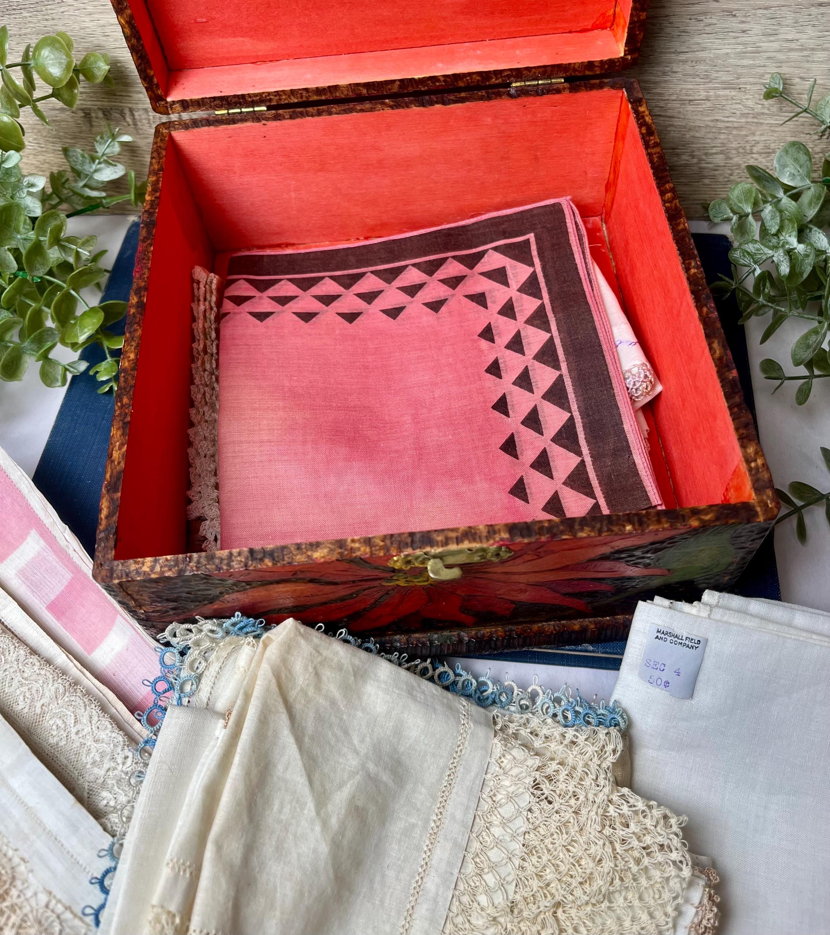 The interior is a vivid coral-red finish, adding a striking contrast to the rustic exterior. Comlete with a large collection of vintage handkerchiefs that were stored in the box for almost a century! The box itself is perfect for storing jewelry, keepsakes, letters, or linens — this box makes a charming addition to any vintage home decor, holiday display, or folk art collection.