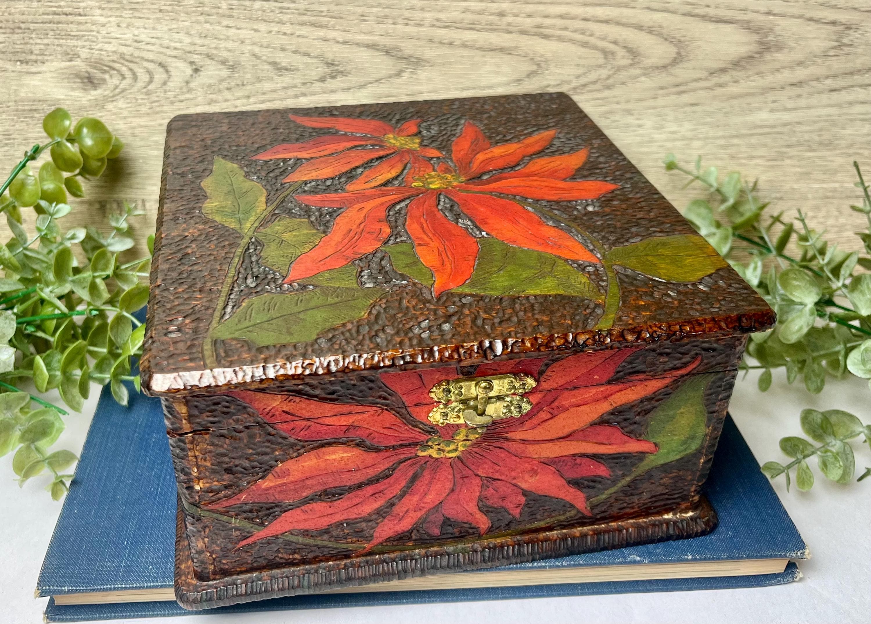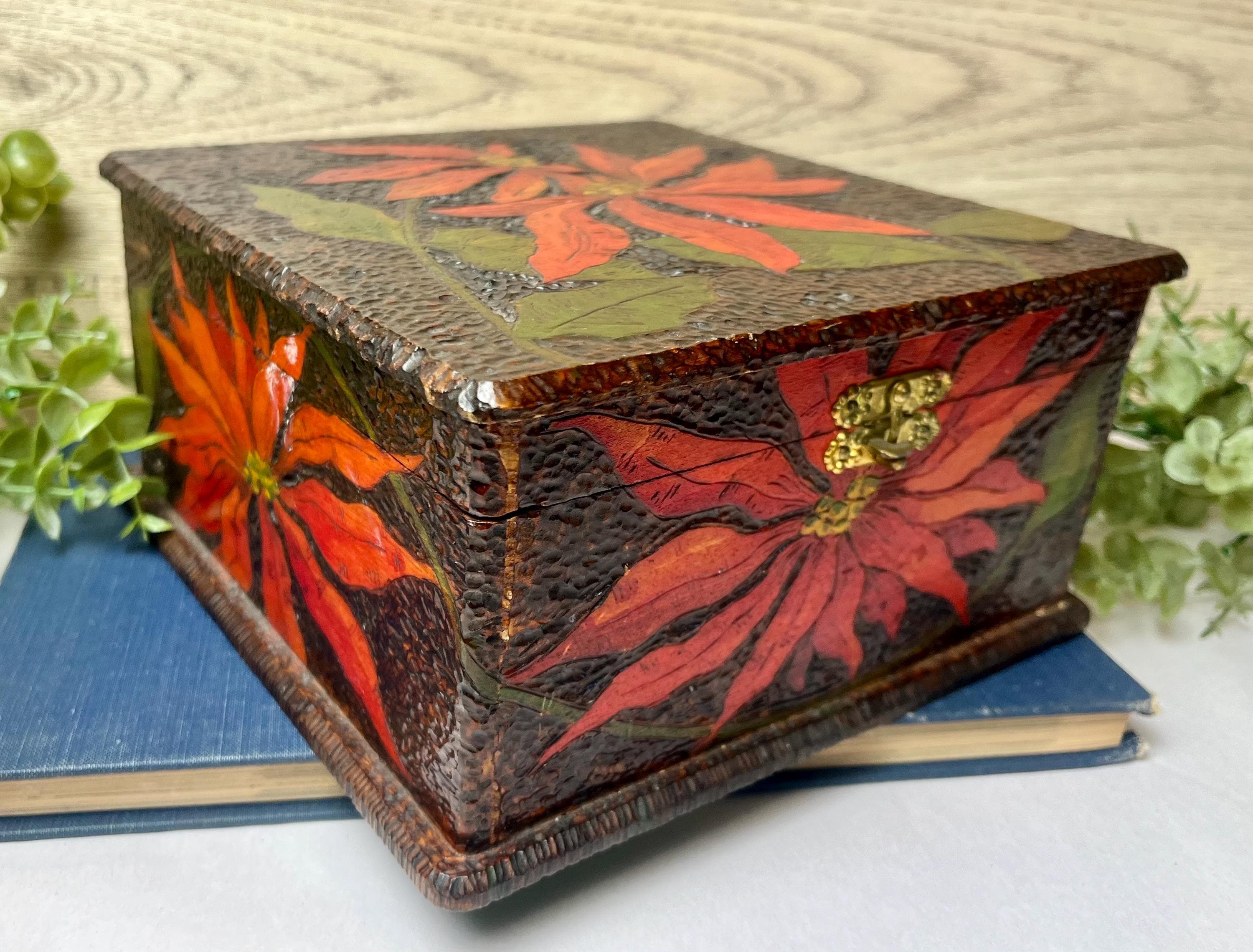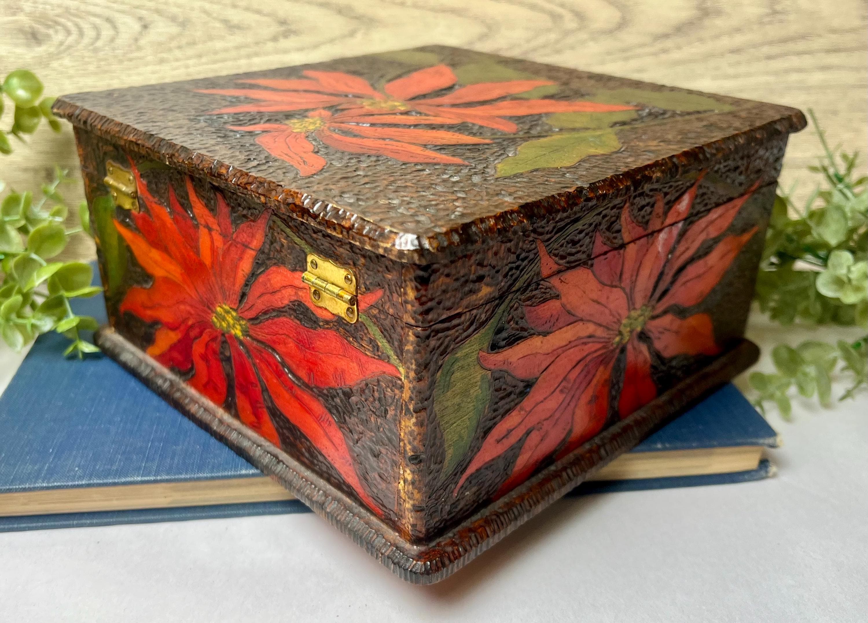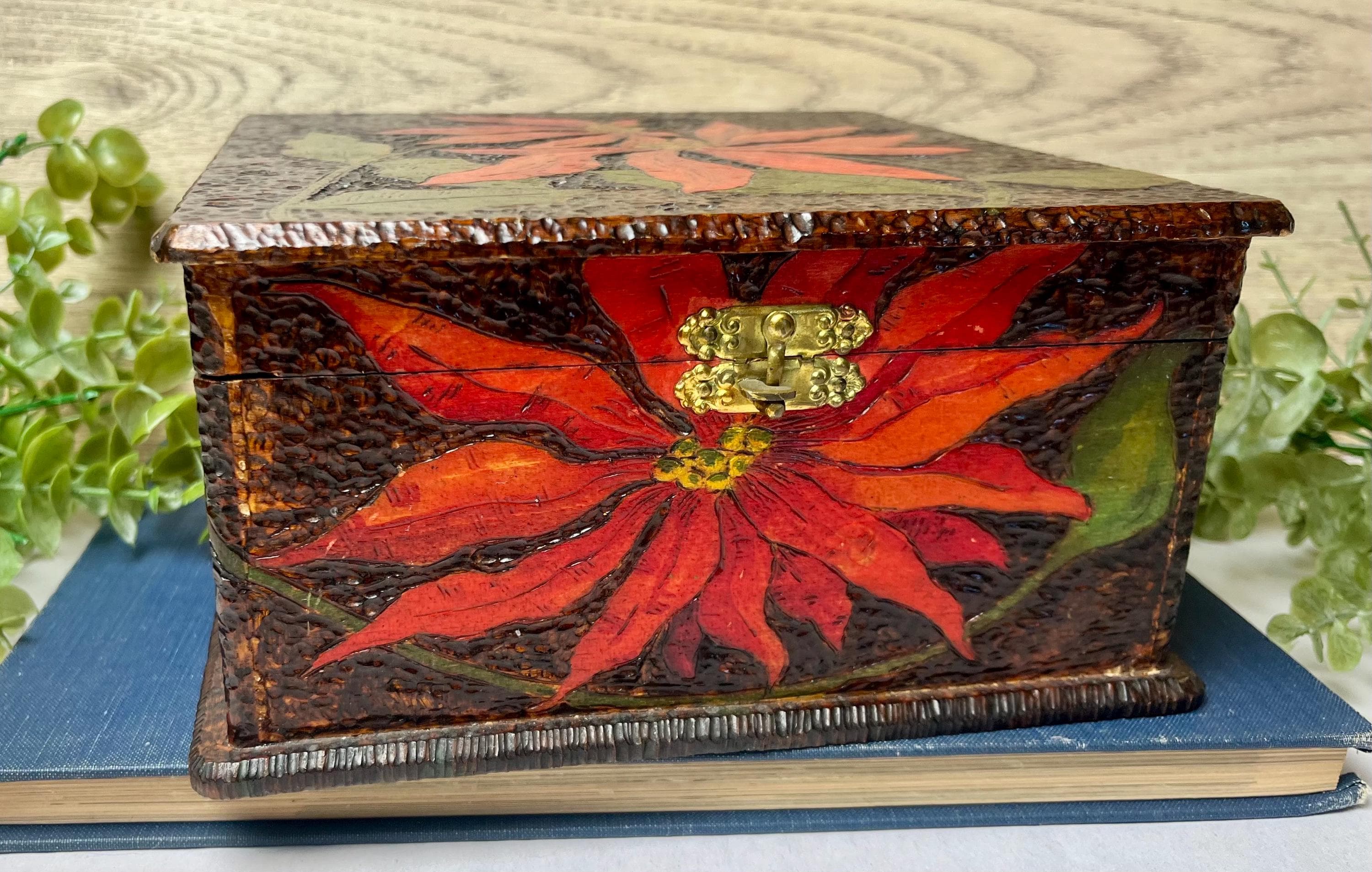 This beautiful vintage pyrography box from the 1930s–1940s showcases the timeless artistry of early 20th-century wood burning and hand-painting. The box features bold, hand-colored red poinsettia flowers and green leaves burned into the wood surface with rich texture and depth, finished in a warm varnish that highlights the craftsmanship.