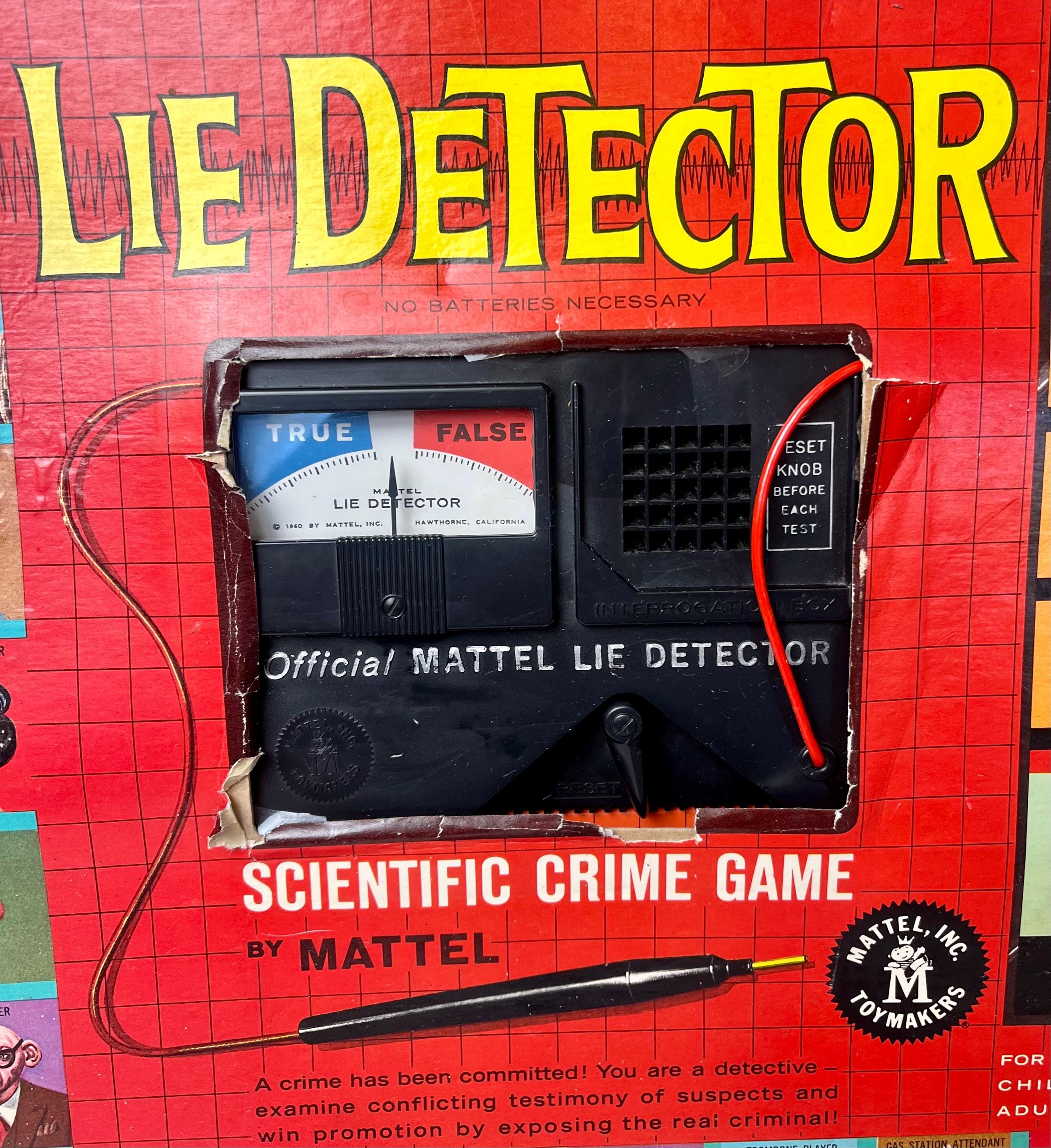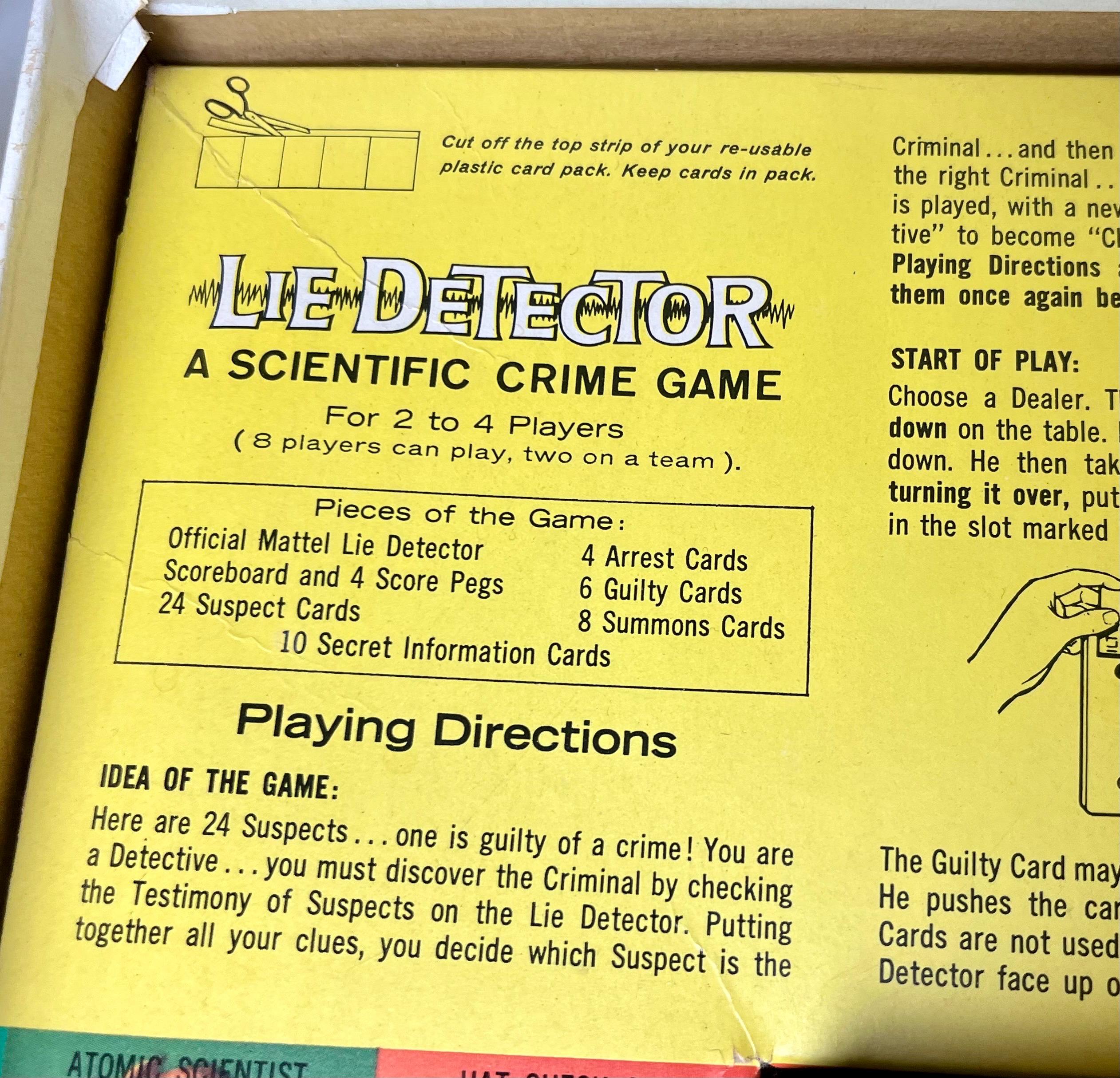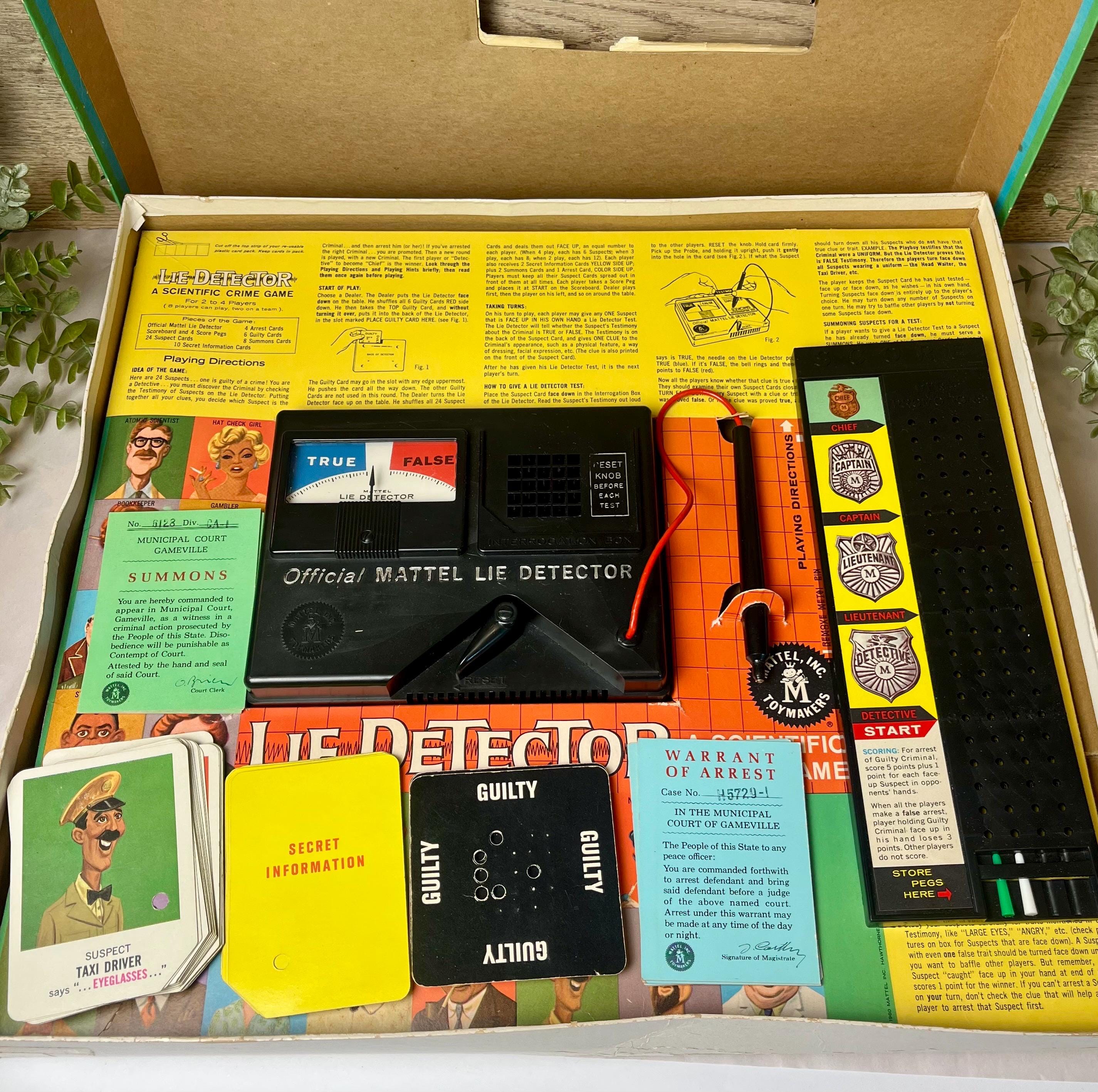 🧩 Details • Brand: Mattel, Inc. • Model: Lie Detector – “A Scientific Crime Game” • Year: 1960 • Made in: Hawthorne, California, USA • Game Type: Detective / Crime-solving game • Players: 2–4 (up to 8 with teams) • Includes: • Official Mattel Lie Detector device • Scoreboard and 2 score pegs • 24 Suspect cards • 10 Secret Information cards • 4 Arrest cards • 6 Guilty cards • 7 Summons cards • Original box and instructions printed inside lid
