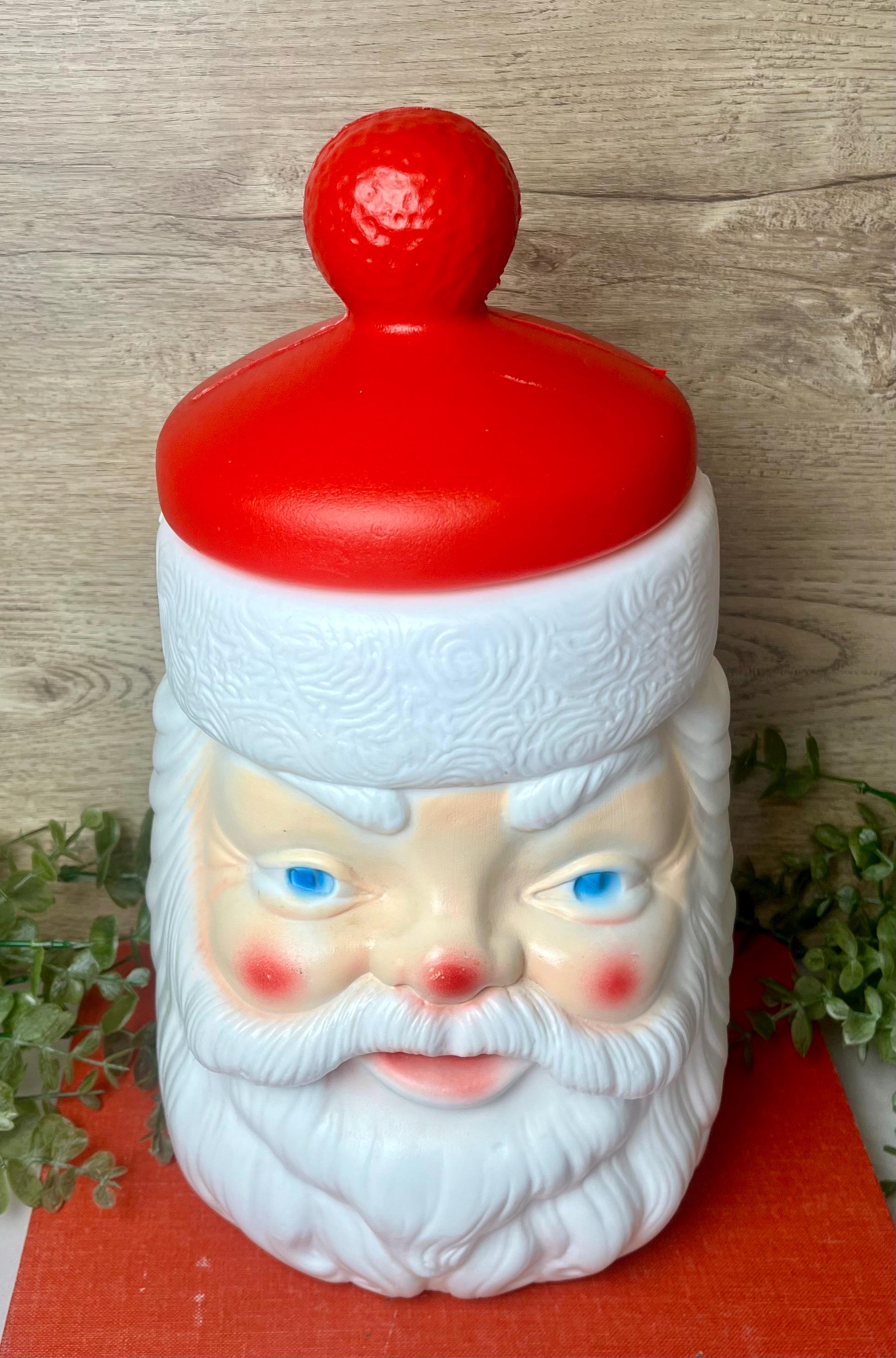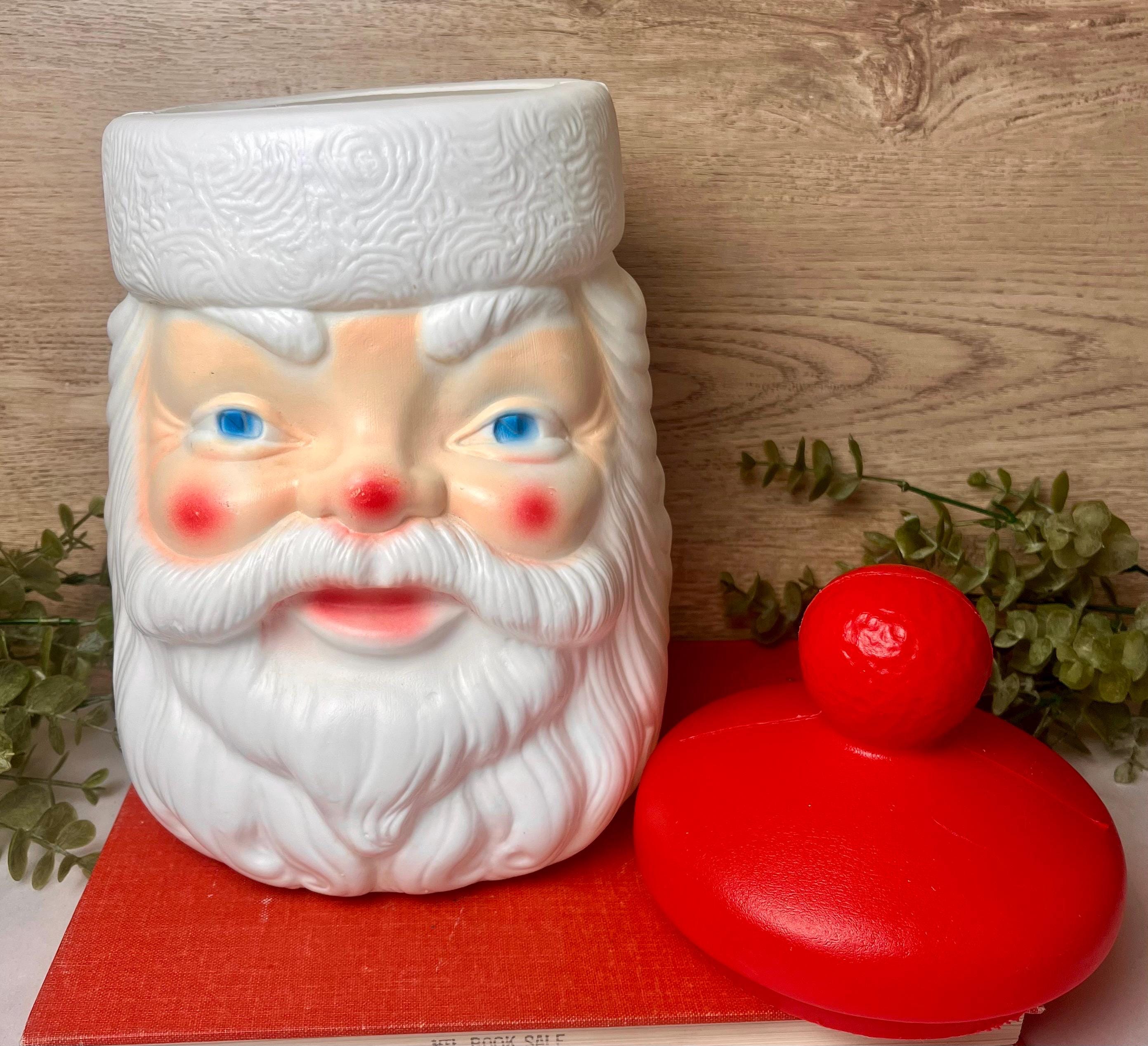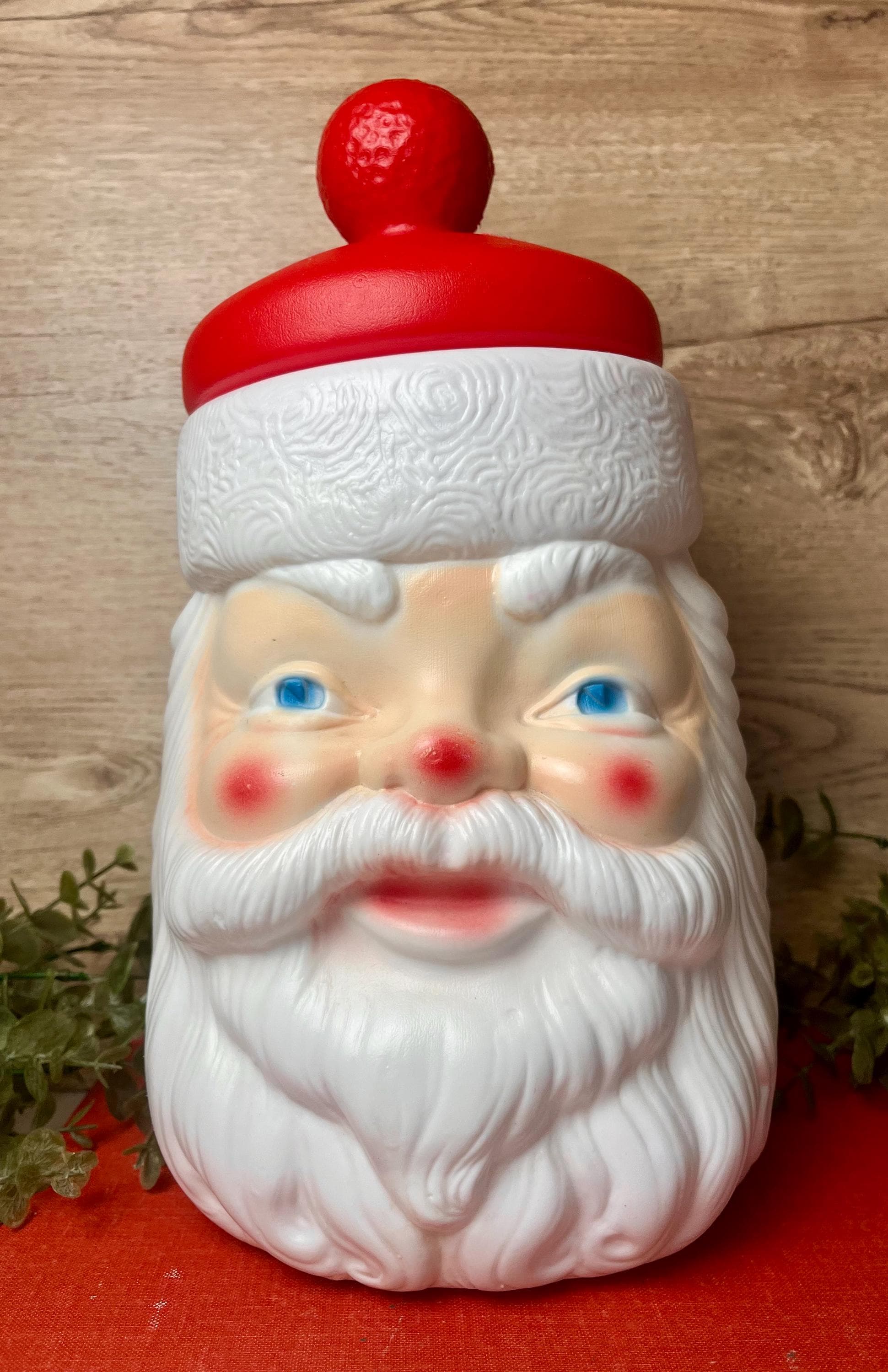 🎄 Features • Vintage 1973 original (not a reproduction) • Made by Carolina Enterprises, Inc. • Molded plastic Santa head with red removable lid • Bright blue eyes, rosy cheeks, and textured beard detailing • Lightweight yet sturdy • Perfect for cookies, candy, or decorative display