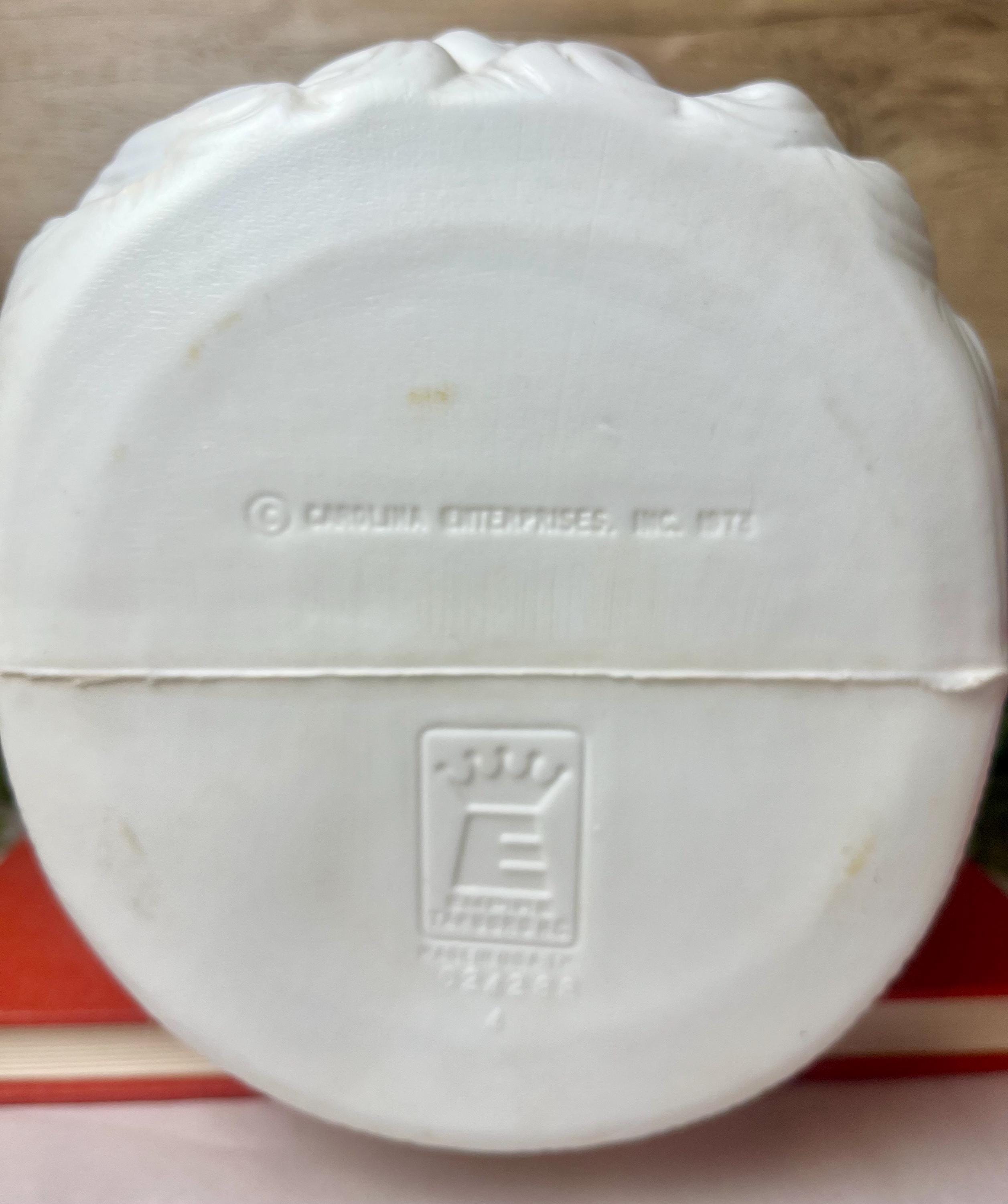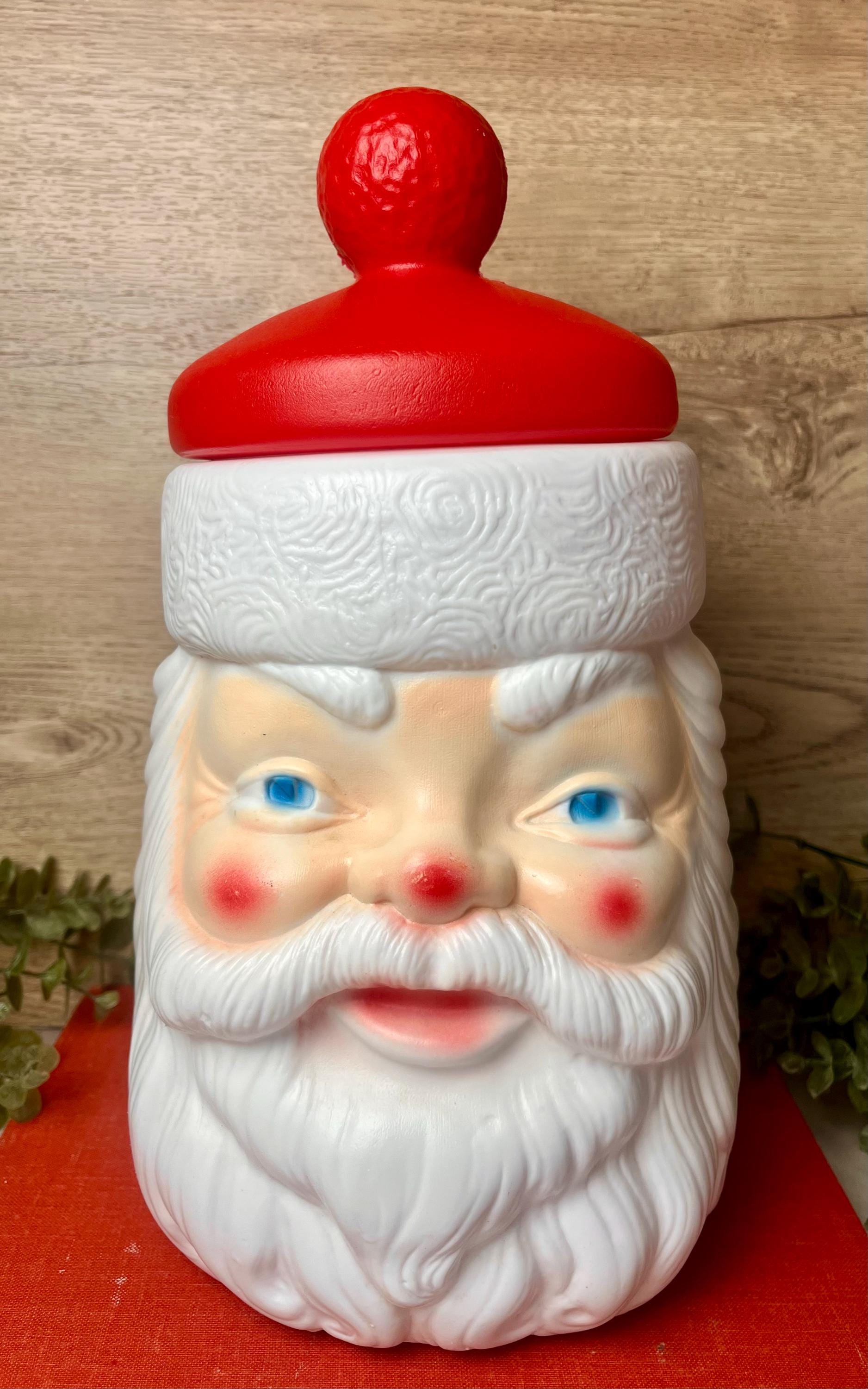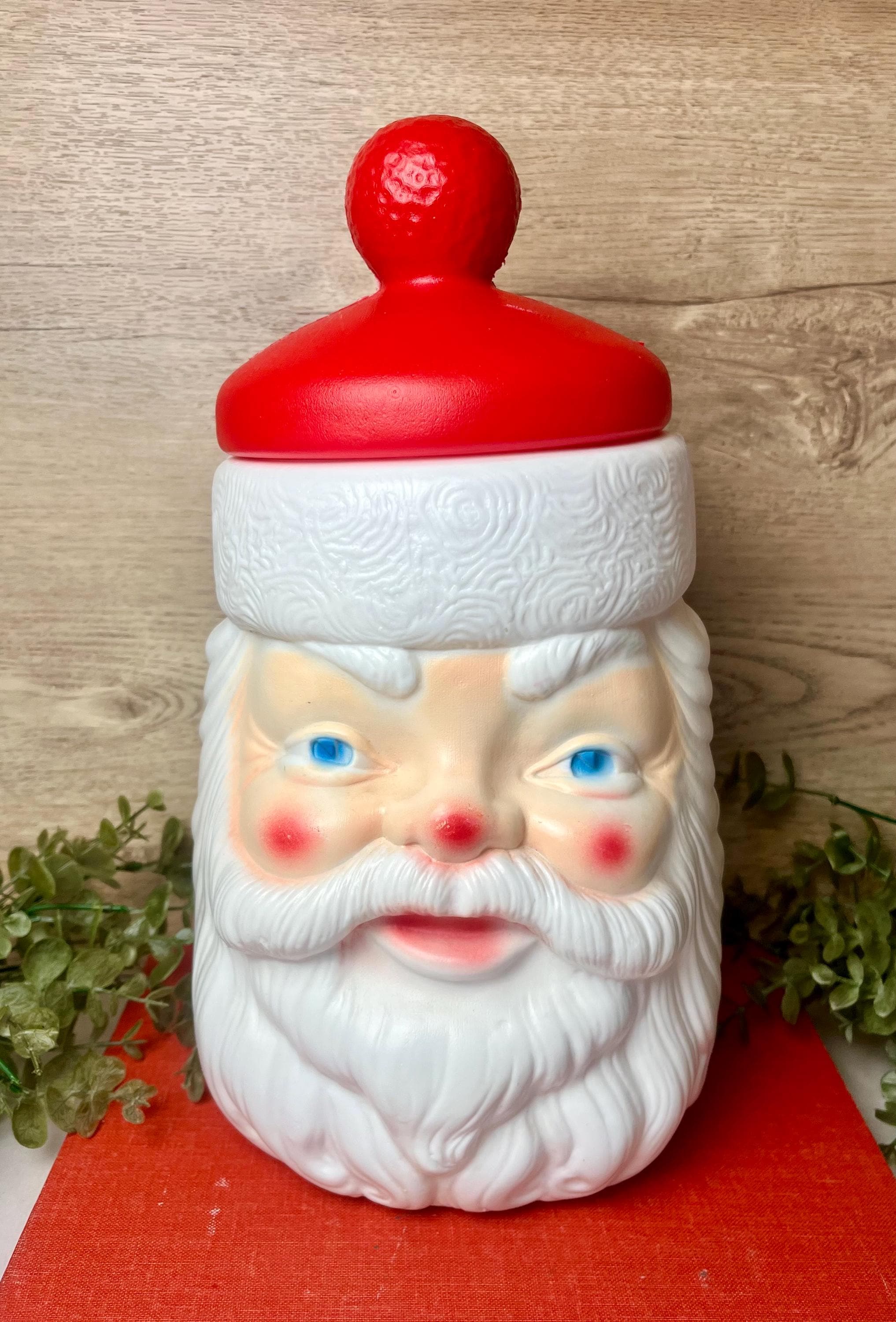 🎄 Features • Vintage 1973 original (not a reproduction) • Made by Carolina Enterprises, Inc. • Molded plastic Santa head with red removable lid • Bright blue eyes, rosy cheeks, and textured beard detailing • Lightweight yet sturdy • Perfect for cookies, candy, or decorative display