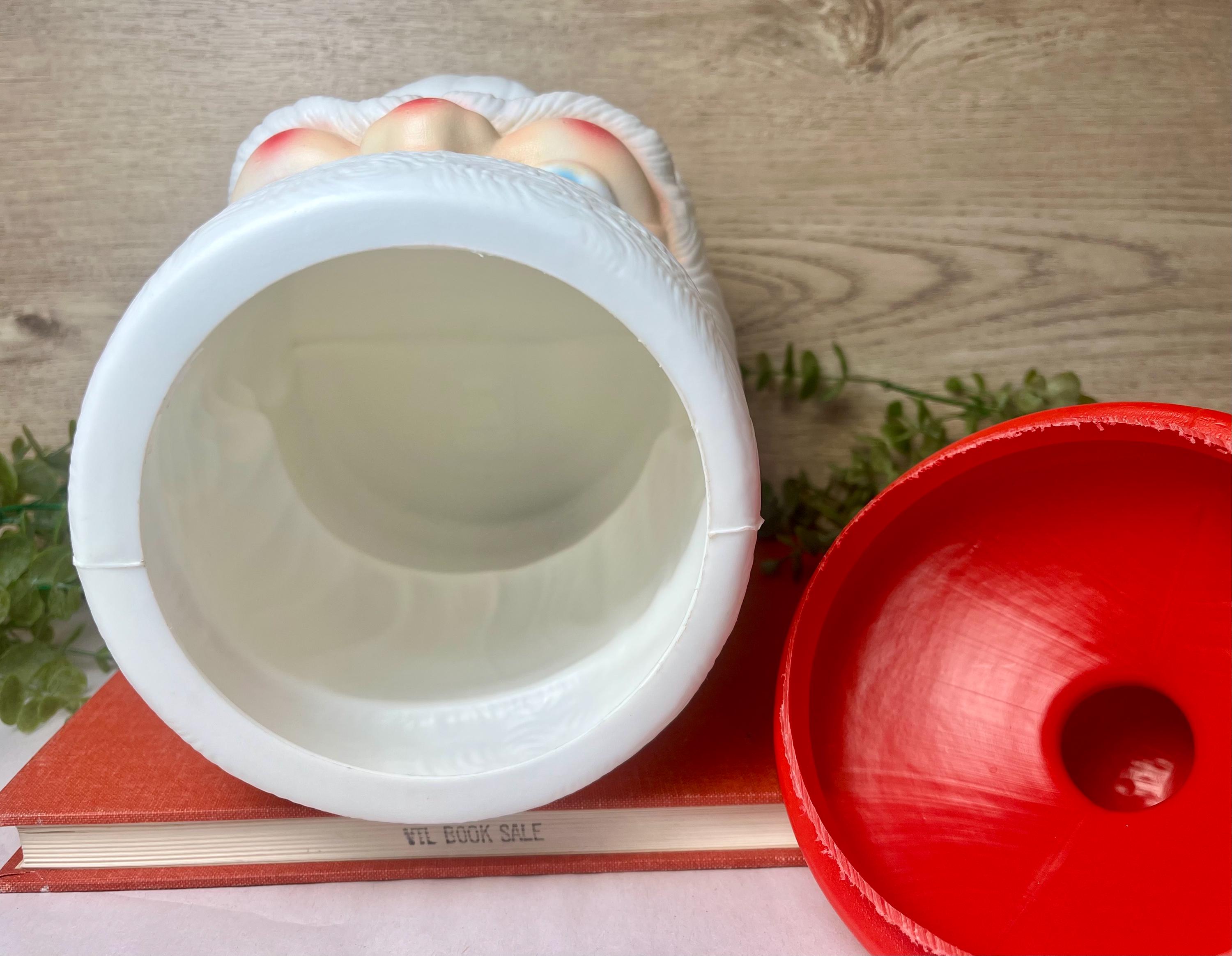 Add instant retro charm to your holiday kitchen with this vintage 1973 Santa Claus cookie jar made by Carolina Enterprises. This delightful large Santa head jar features bright blue eyes, rosy cheeks, and a cheerful red lid topped with a textured berry-style knob.