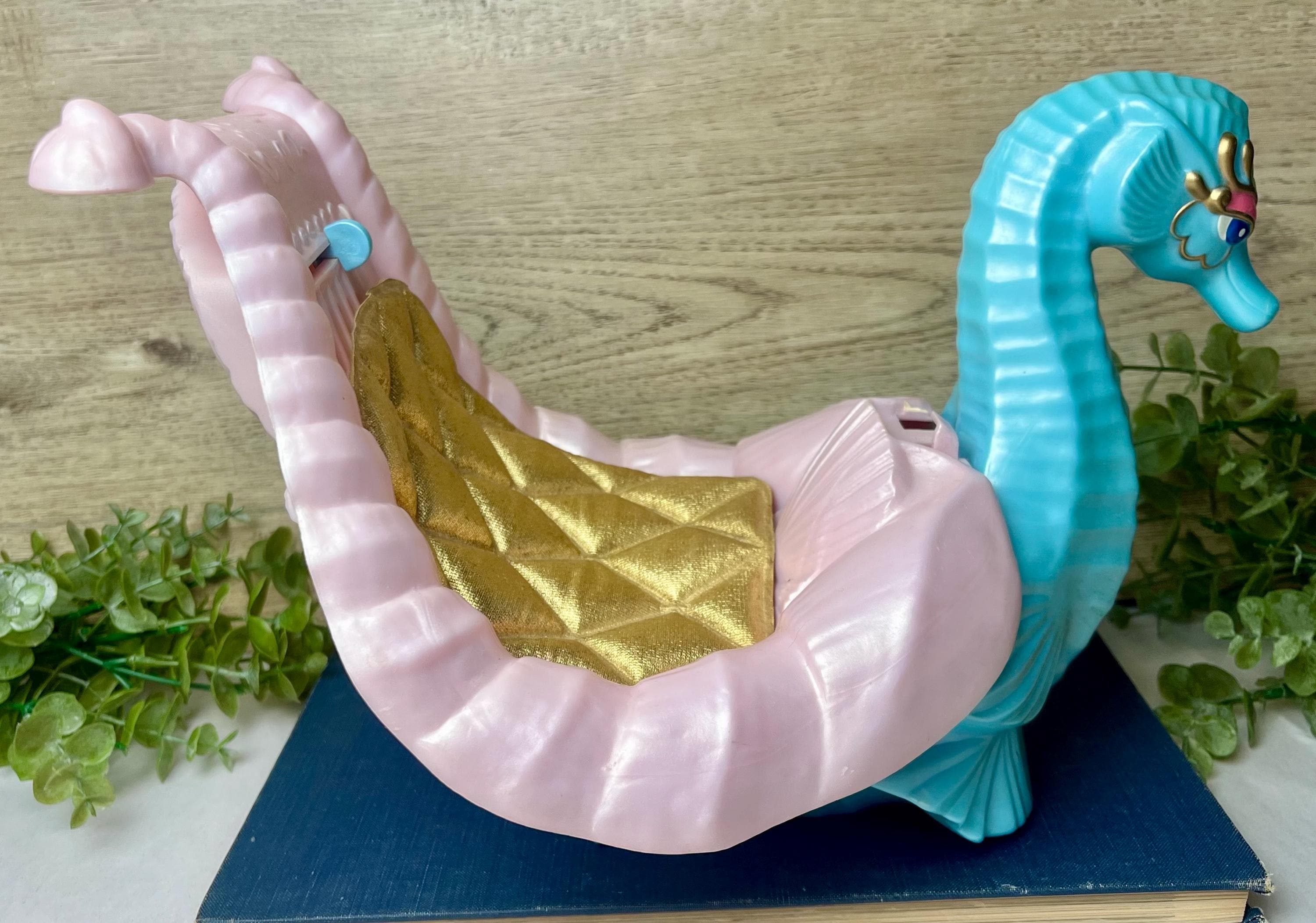 Features • Molded seahorse figure with detailed fins and face • Pearlized pink saddle with gold seat insert • designed to fit She-Ra / Princess of Power figures • “Musical” slider feature