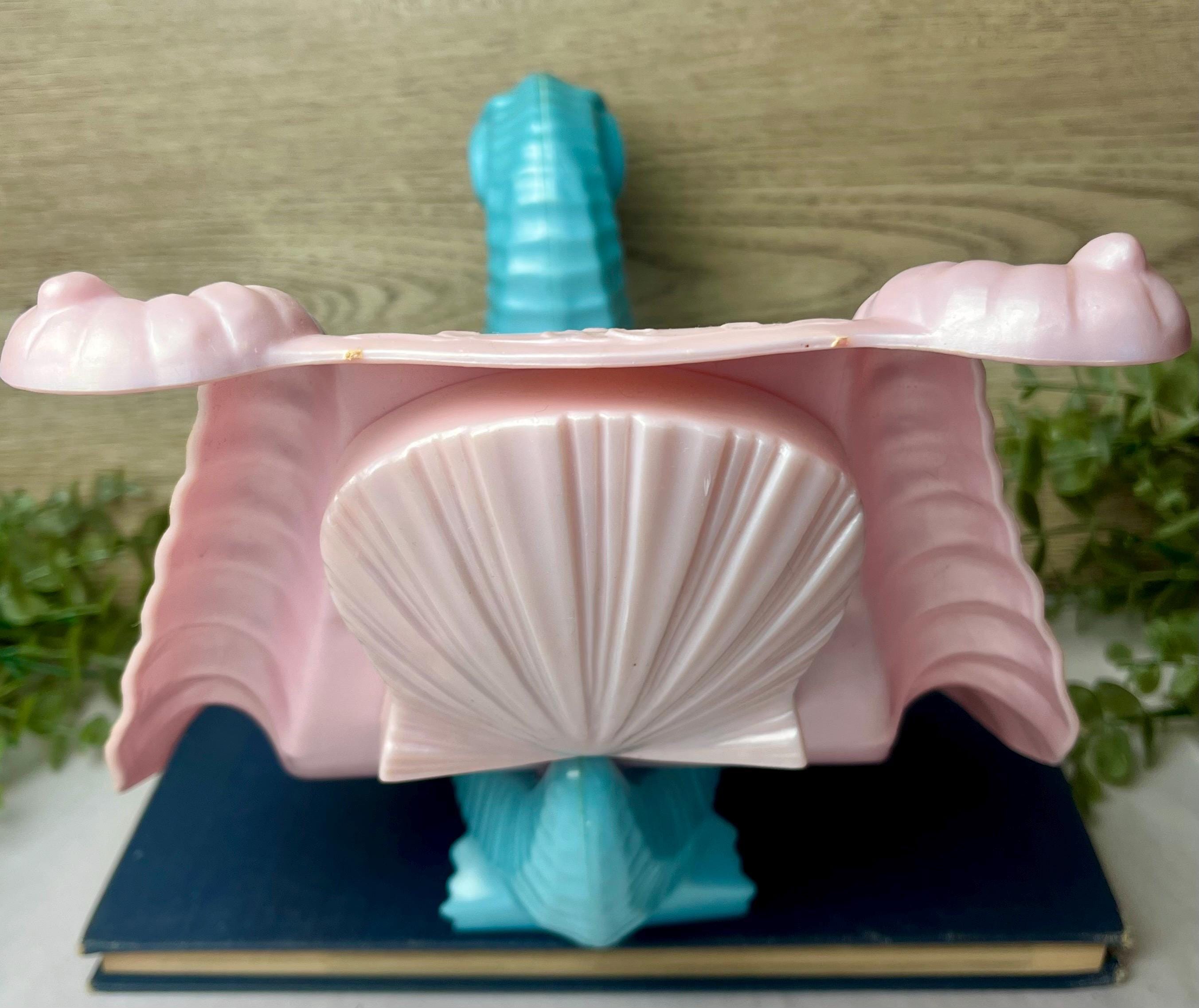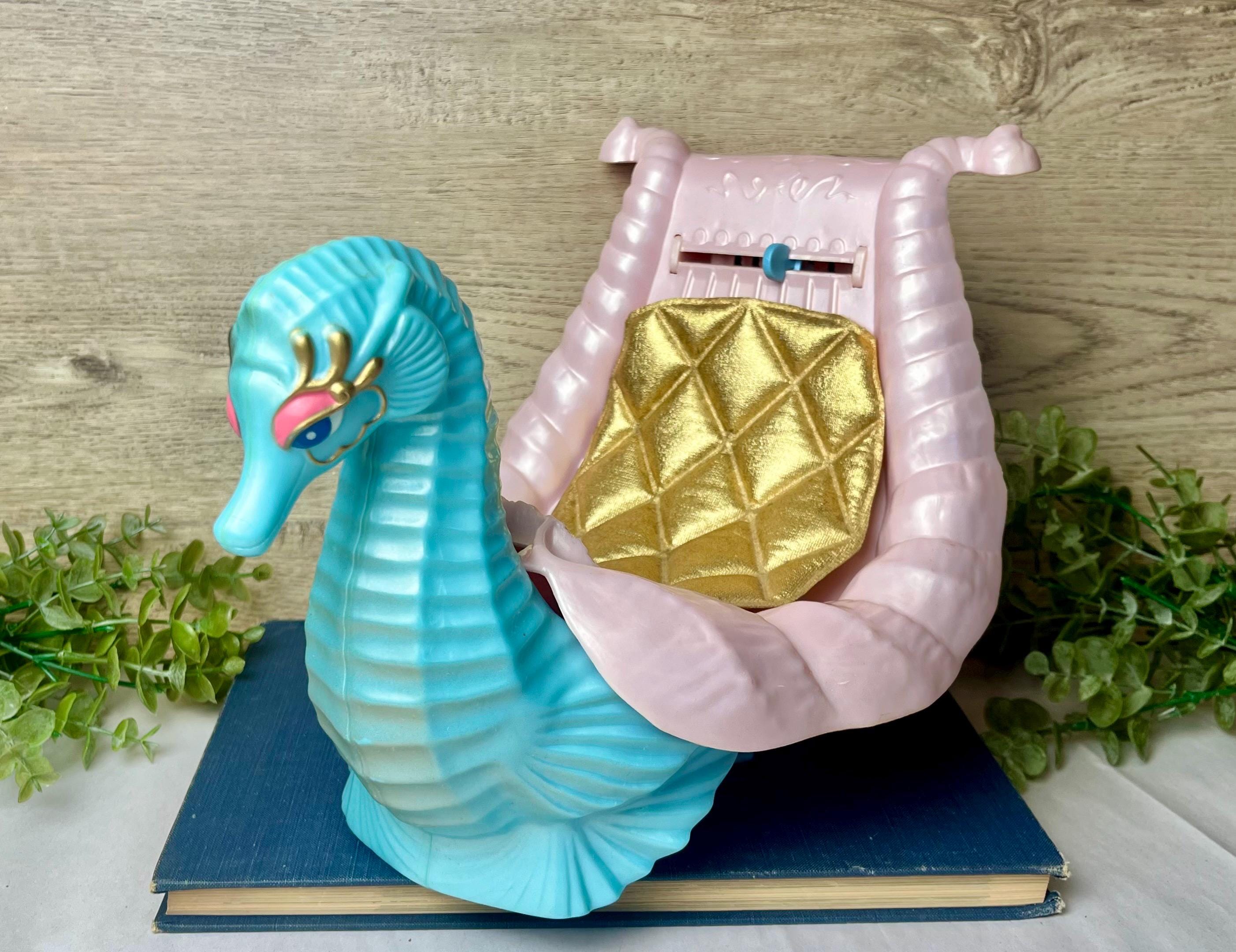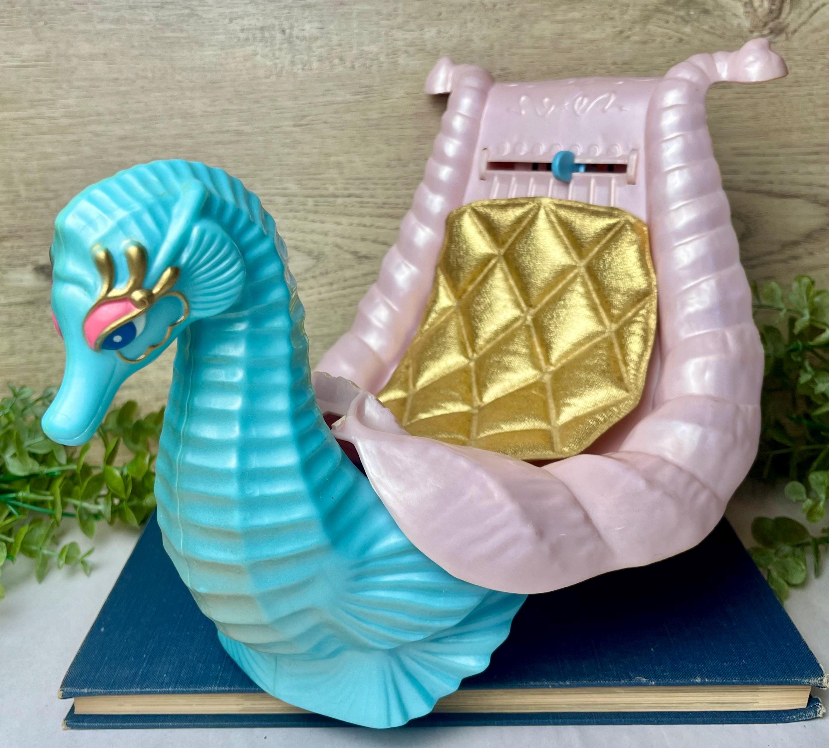 Original vintage She-Ra: Princess of Power Sea Harp vehicle / mount by Mattel, dating to the mid-1980s. This colorful fantasy creature features a sculpted turquoise seahorse body with a pearl-pink saddle seat and gold quilted detail, designed to hold a Princess of Power figure.