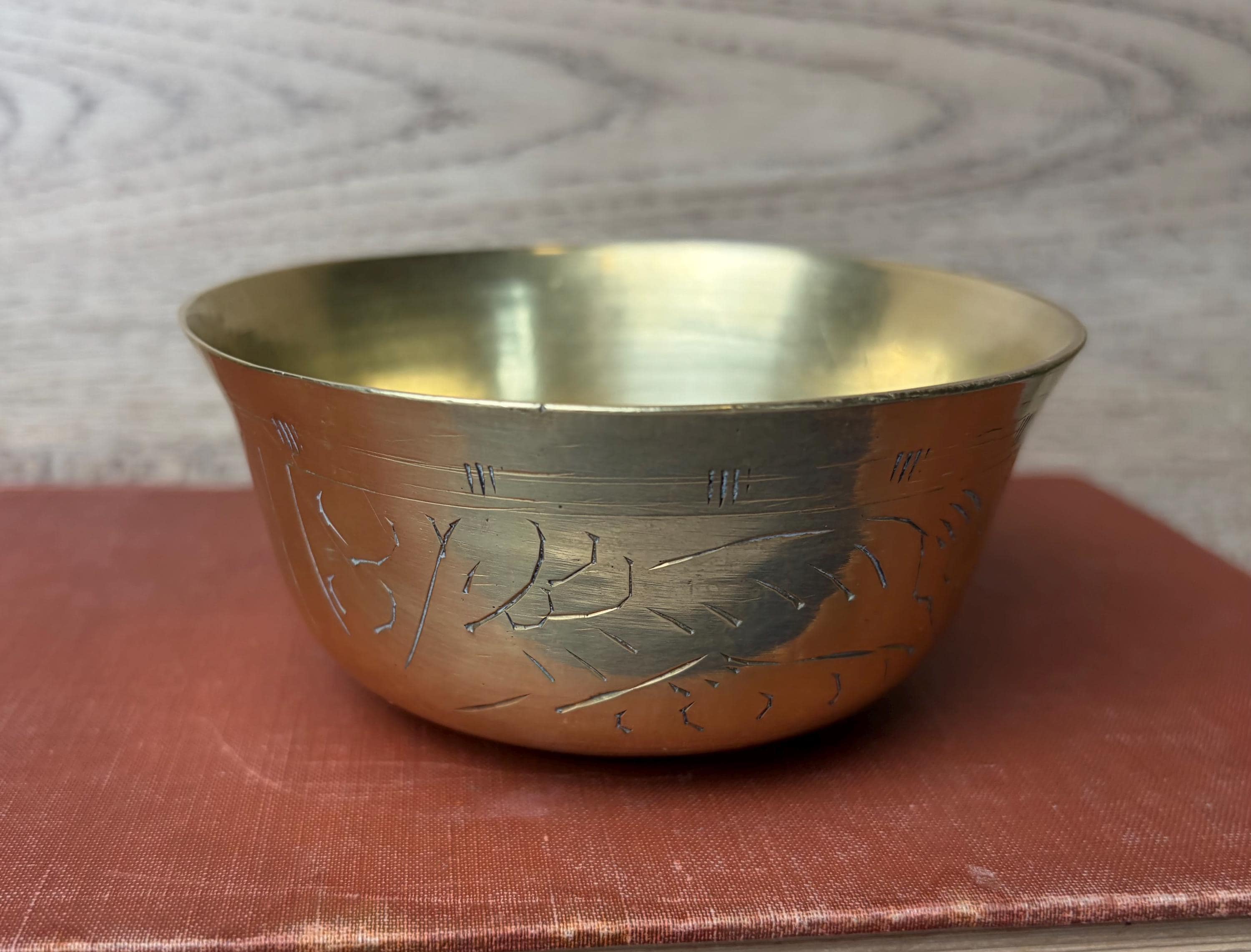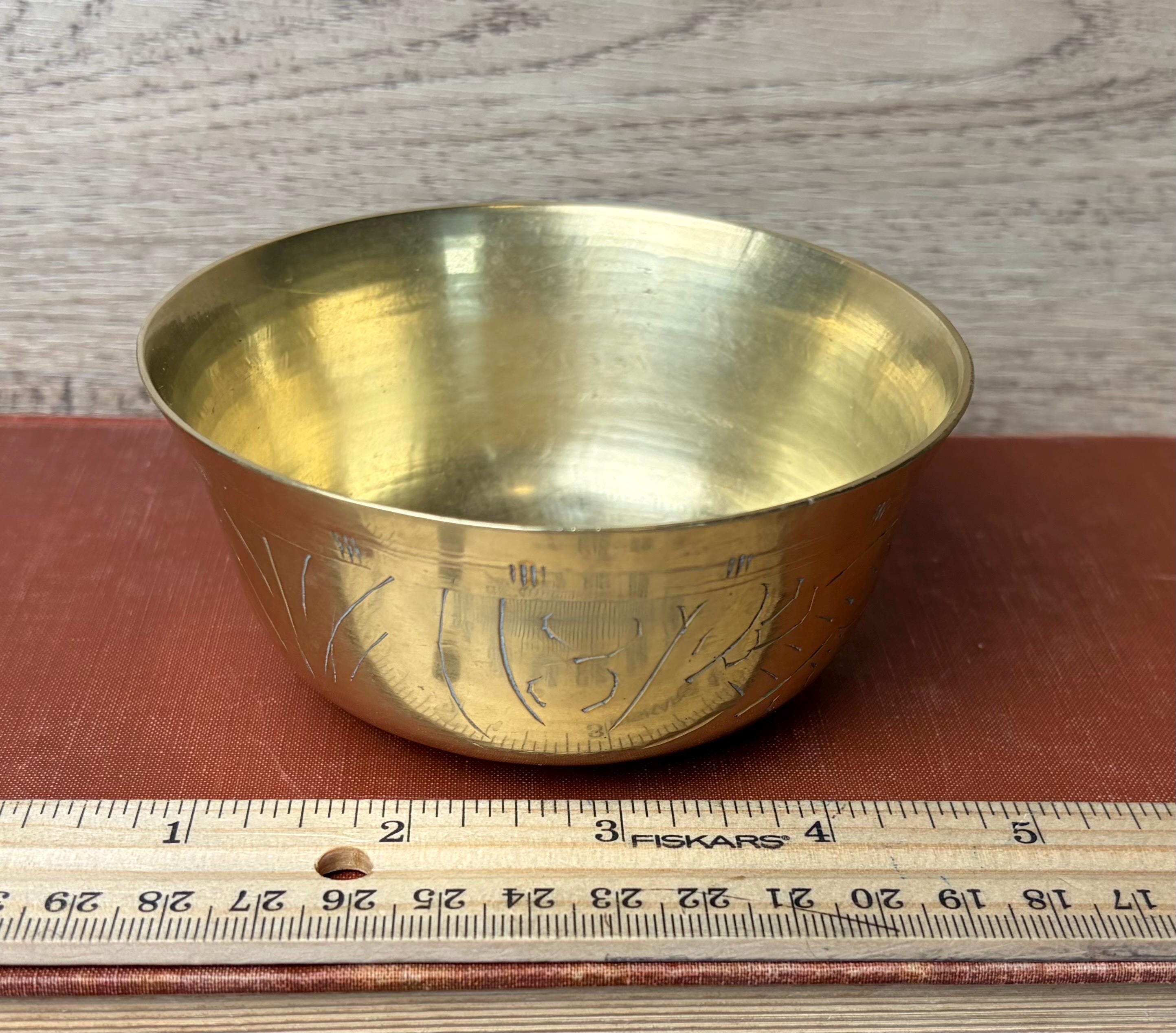 Details • Origin: China (stamped on base) • Material: Solid brass • Design: Hand-engraved floral & leaf motif • Style: Vintage / Boho / Global / Mid-Century • Approx. Diameter: ~5–6 inches (based on ruler photo) • Approx. Height: ~3–4 inches • Finish: Warm golden brass with natural patina • Condition: Good vintage condition with light scratches, interior spotting, and age-appropriate wear • Marking: “CHINA” stamp on underside