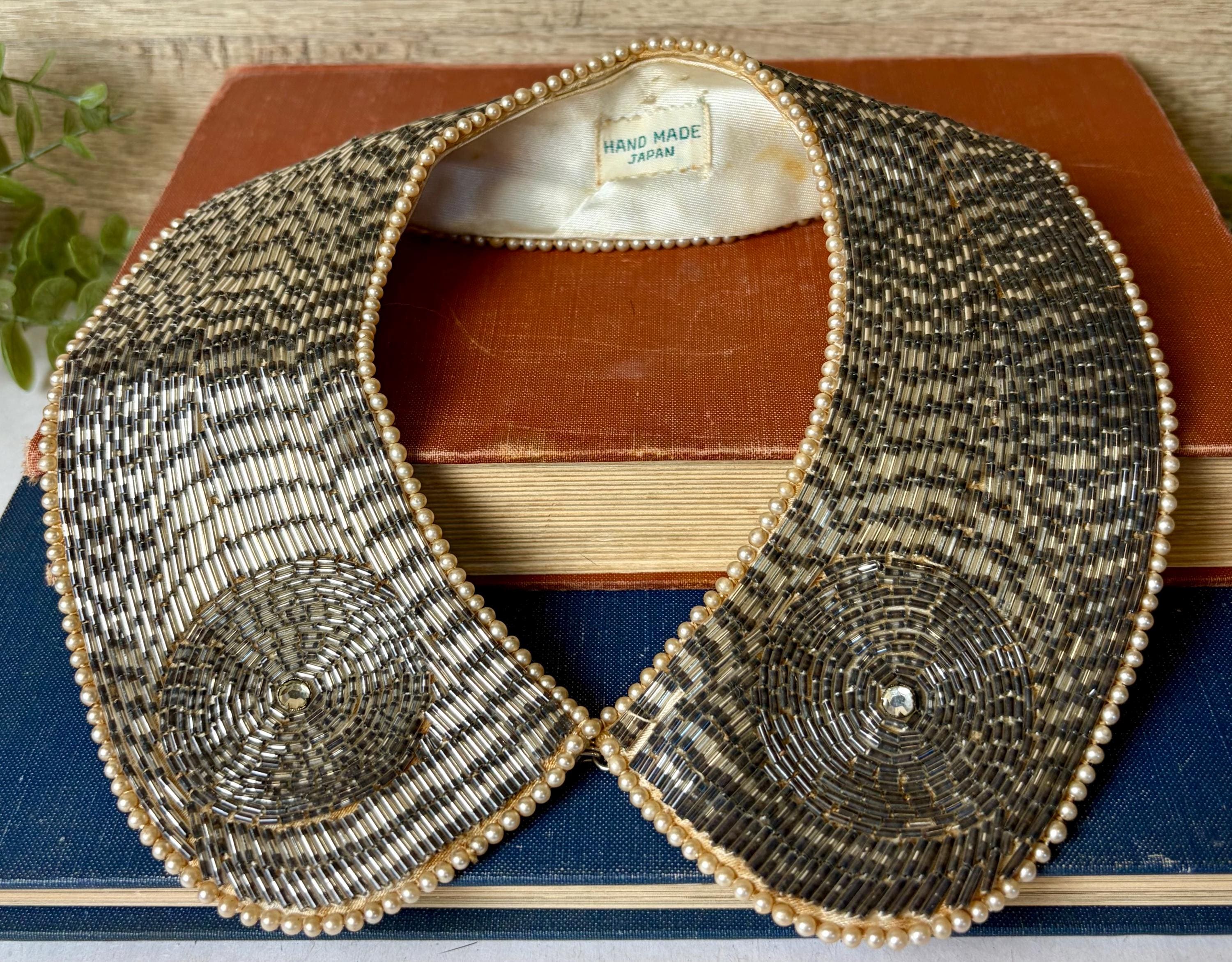 Beautiful vintage hand-beaded statement collar, labeled “Hand Made in Japan.” This striking piece features intricate tubular glass beadwork in a geometric pattern, finished with a delicate faux pearl trim and a classic collar-style clasp closure.