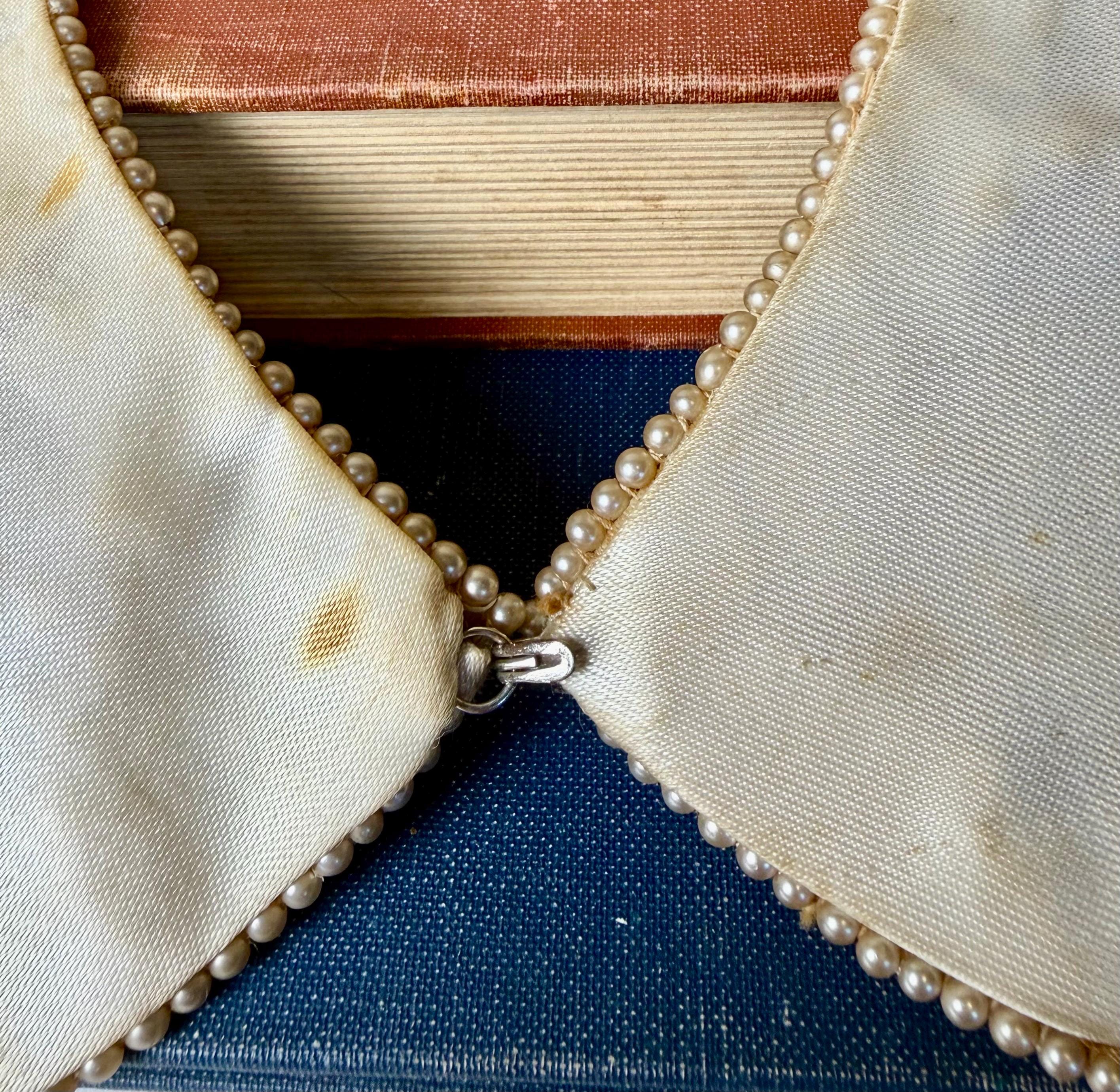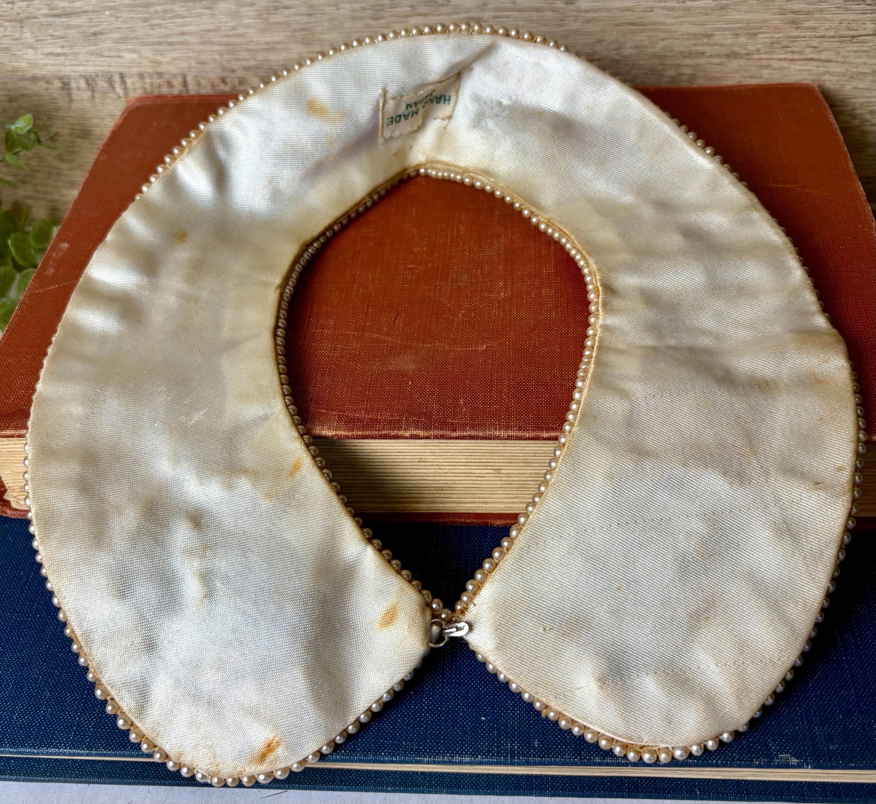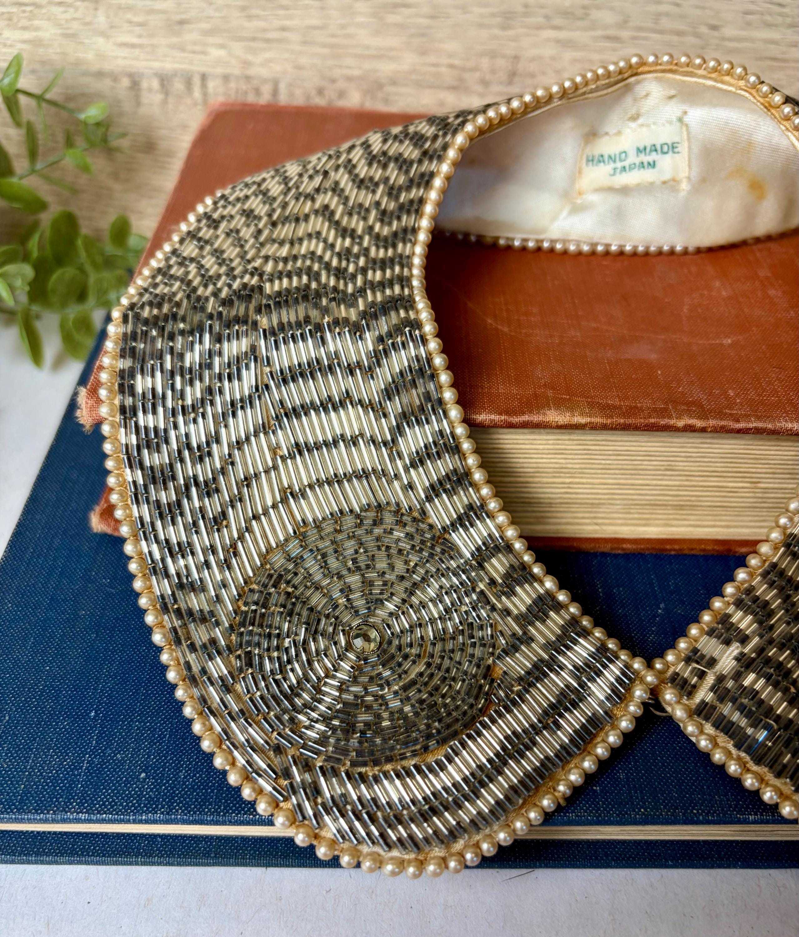 Era: Likely 1950s–1960s Origin: Japan Materials: Glass bugle beads, faux pearls, satin-backed fabric Closure: Hook clasp Label: Hand Made in Japan