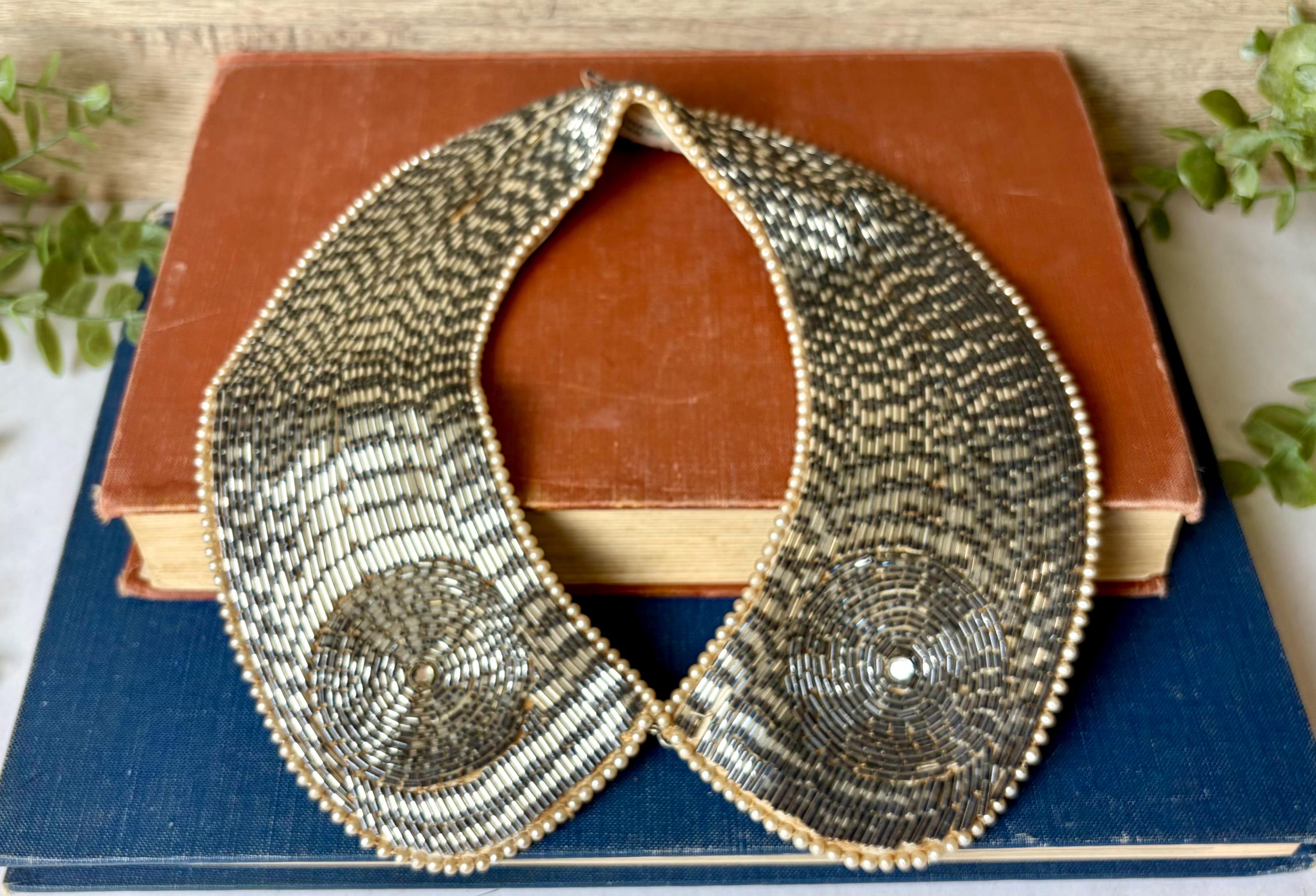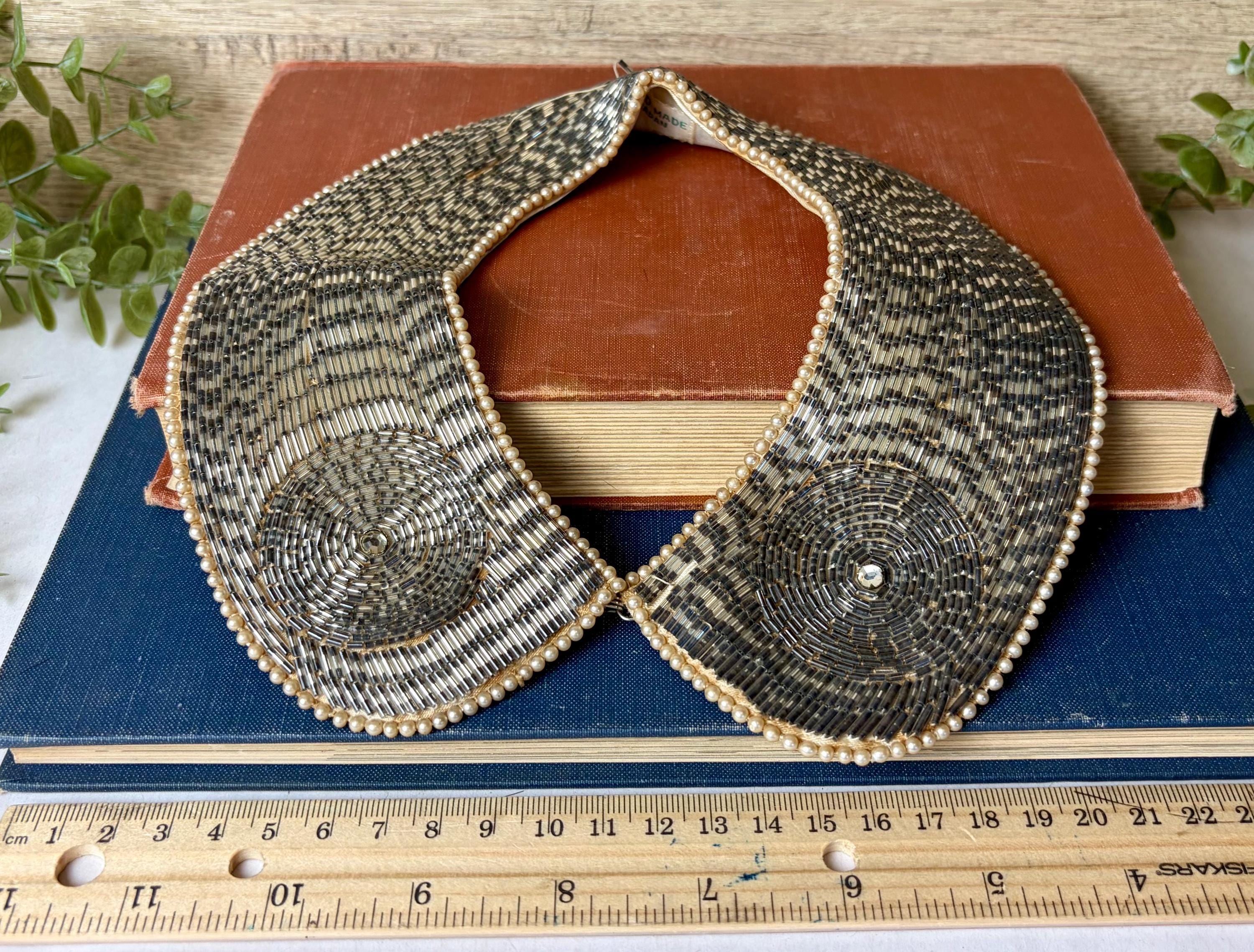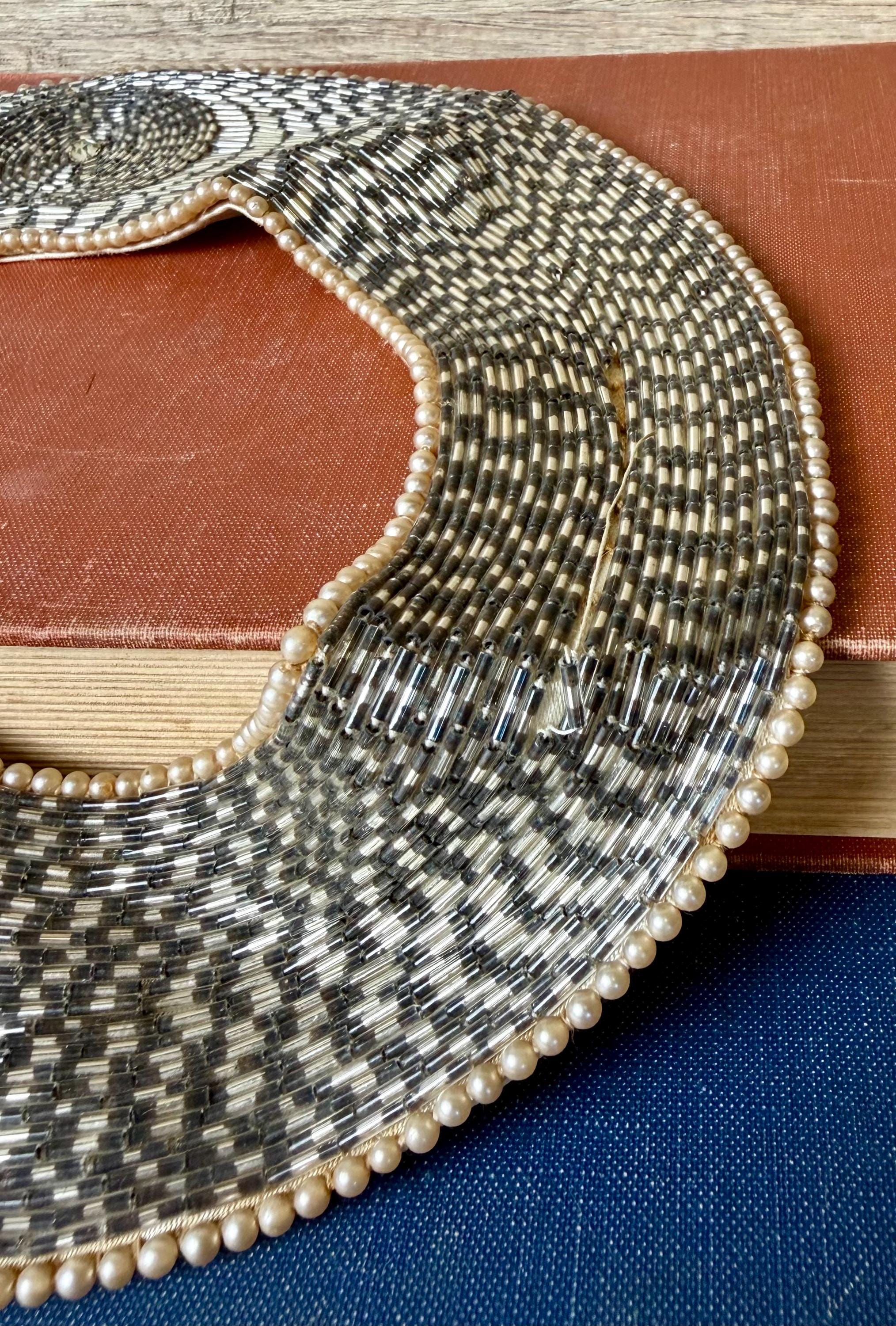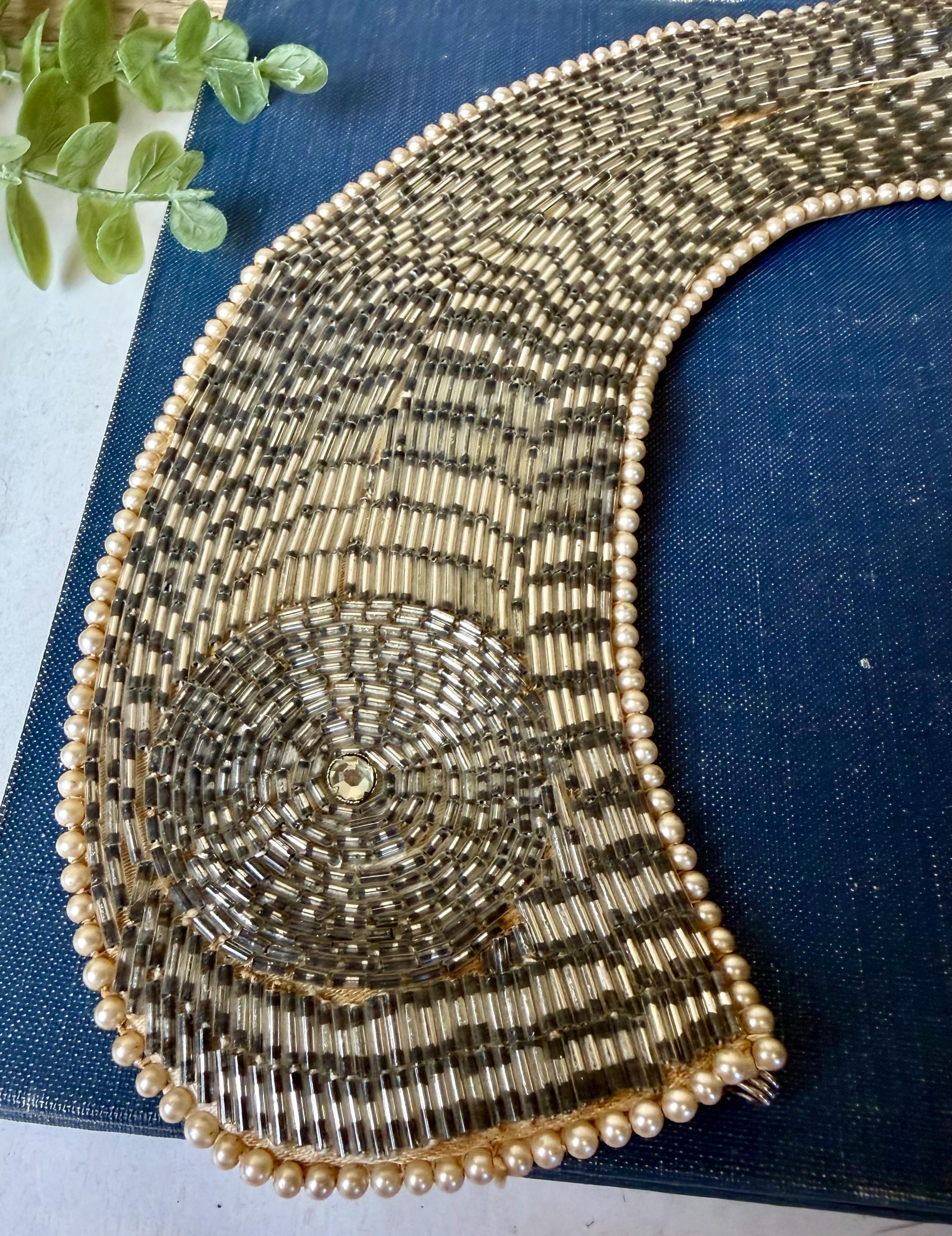 Vintage condition with visible age-related staining on the fabric backing (see photos). Beadwork remains intact and visually stunning from the front. Best suited for gentle wear, styling, photography, or collection.