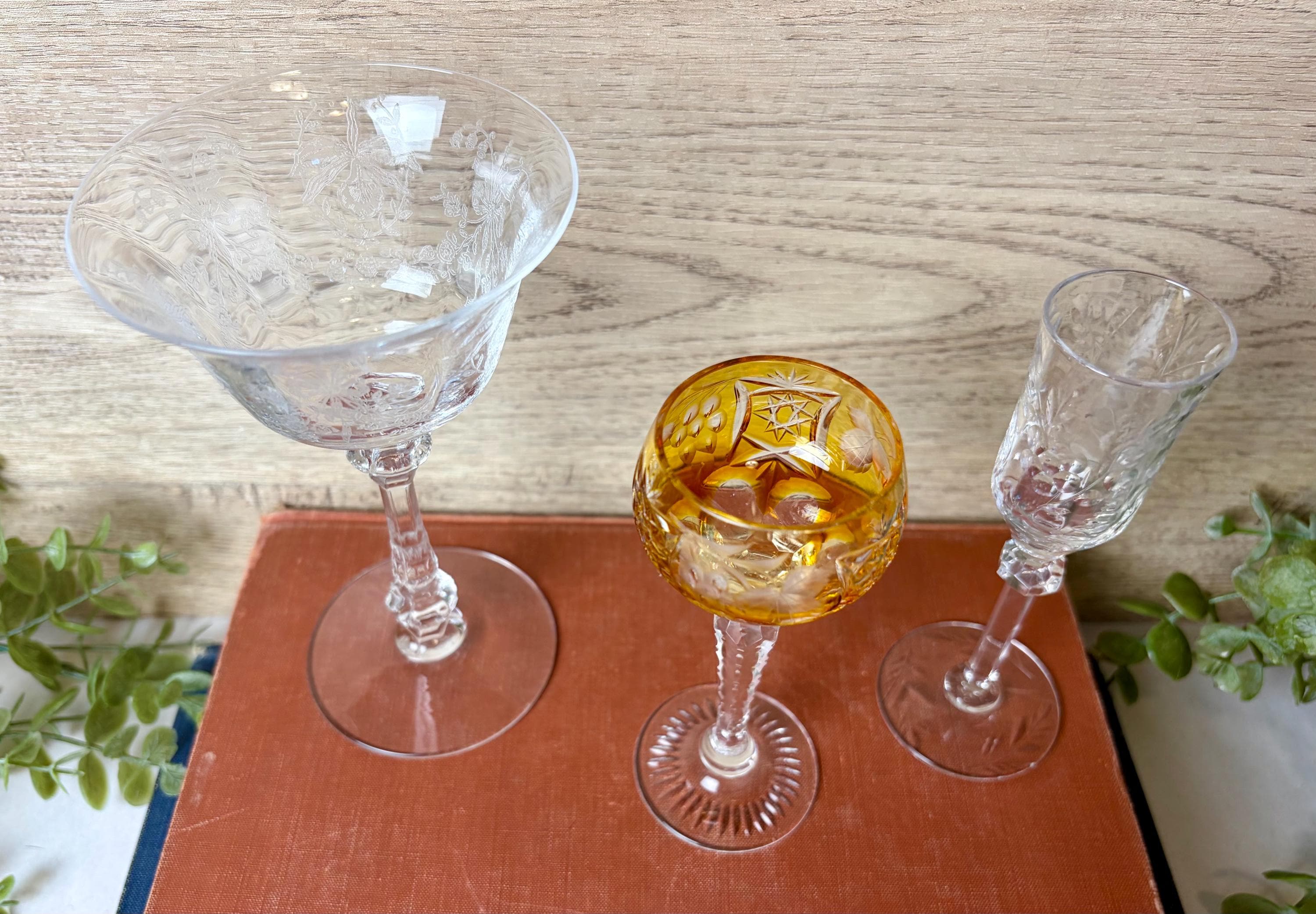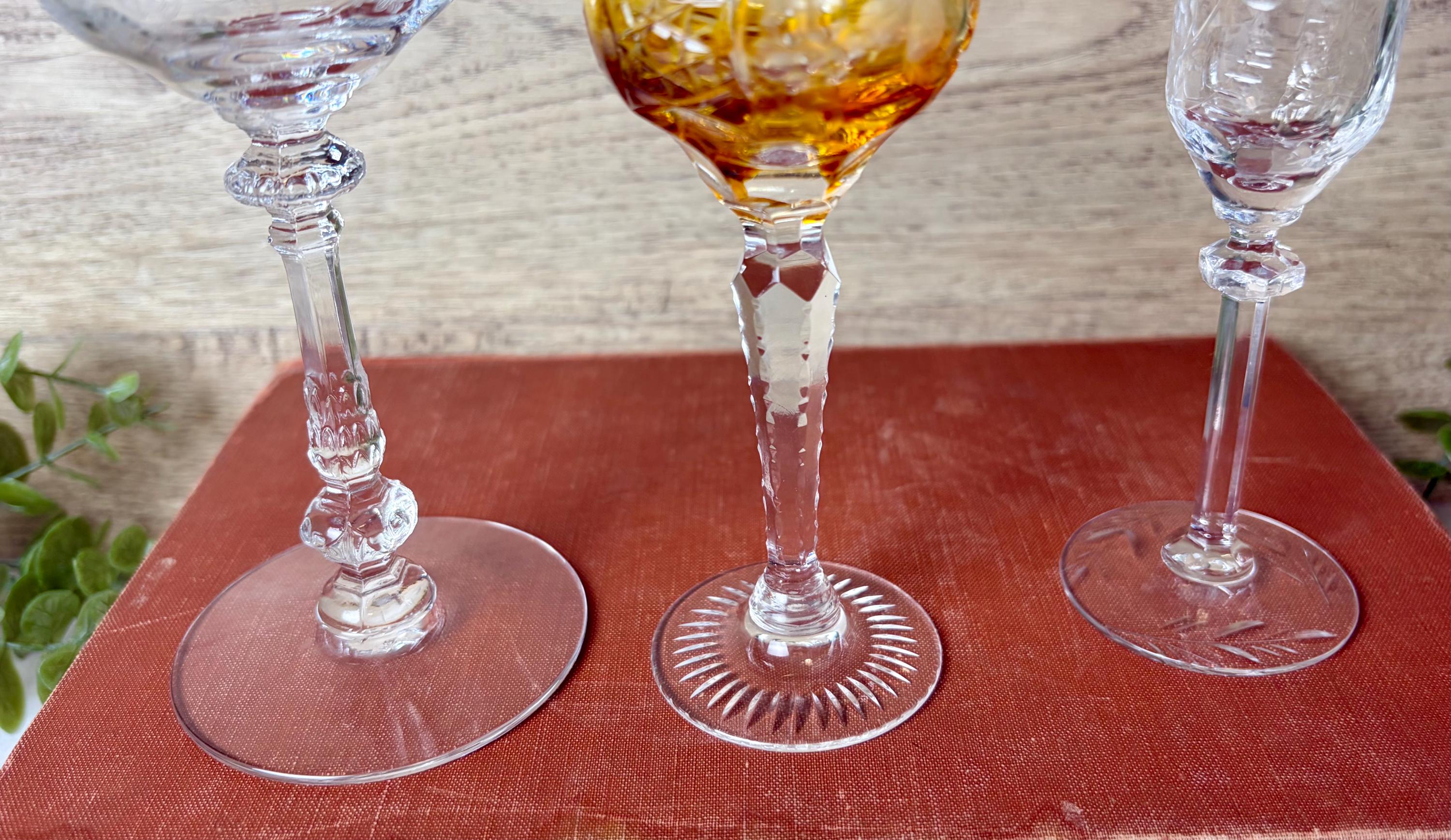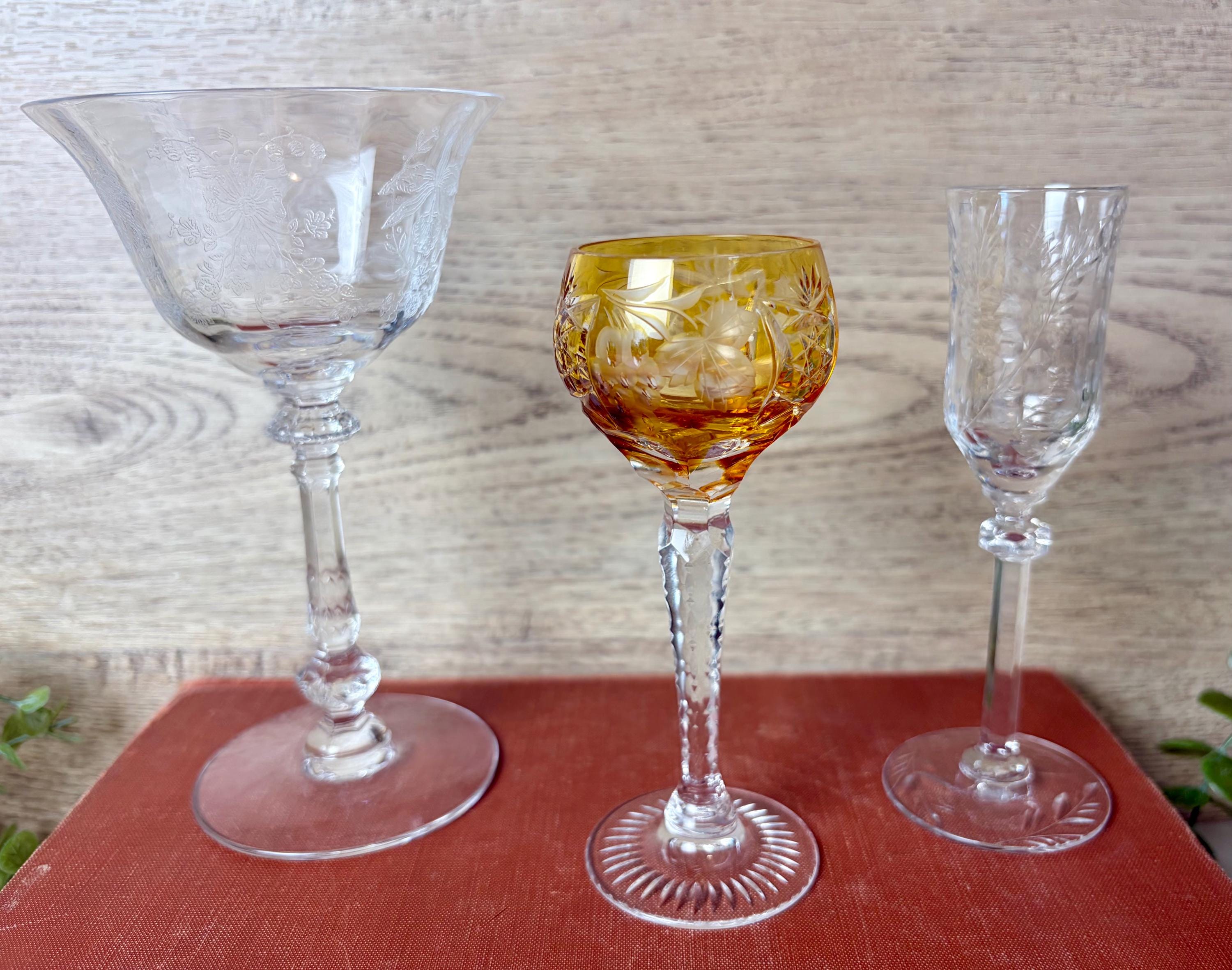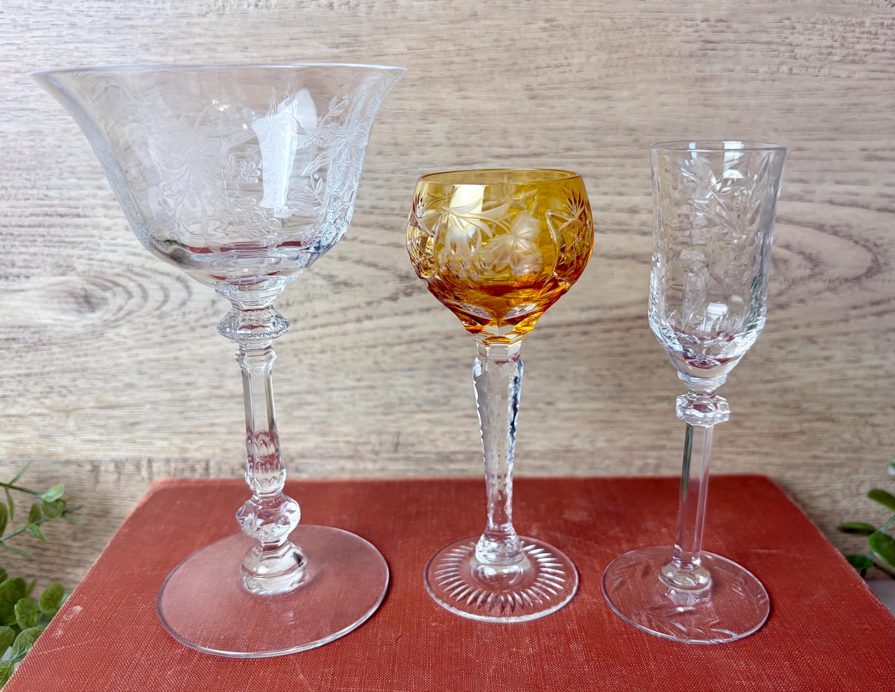 This curated trio includes: • 1 large etched crystal goblet with floral pattern • 1 amber cut crystal wine glass with faceted bowl • 1 slender etched champagne or cordial glass