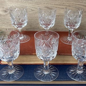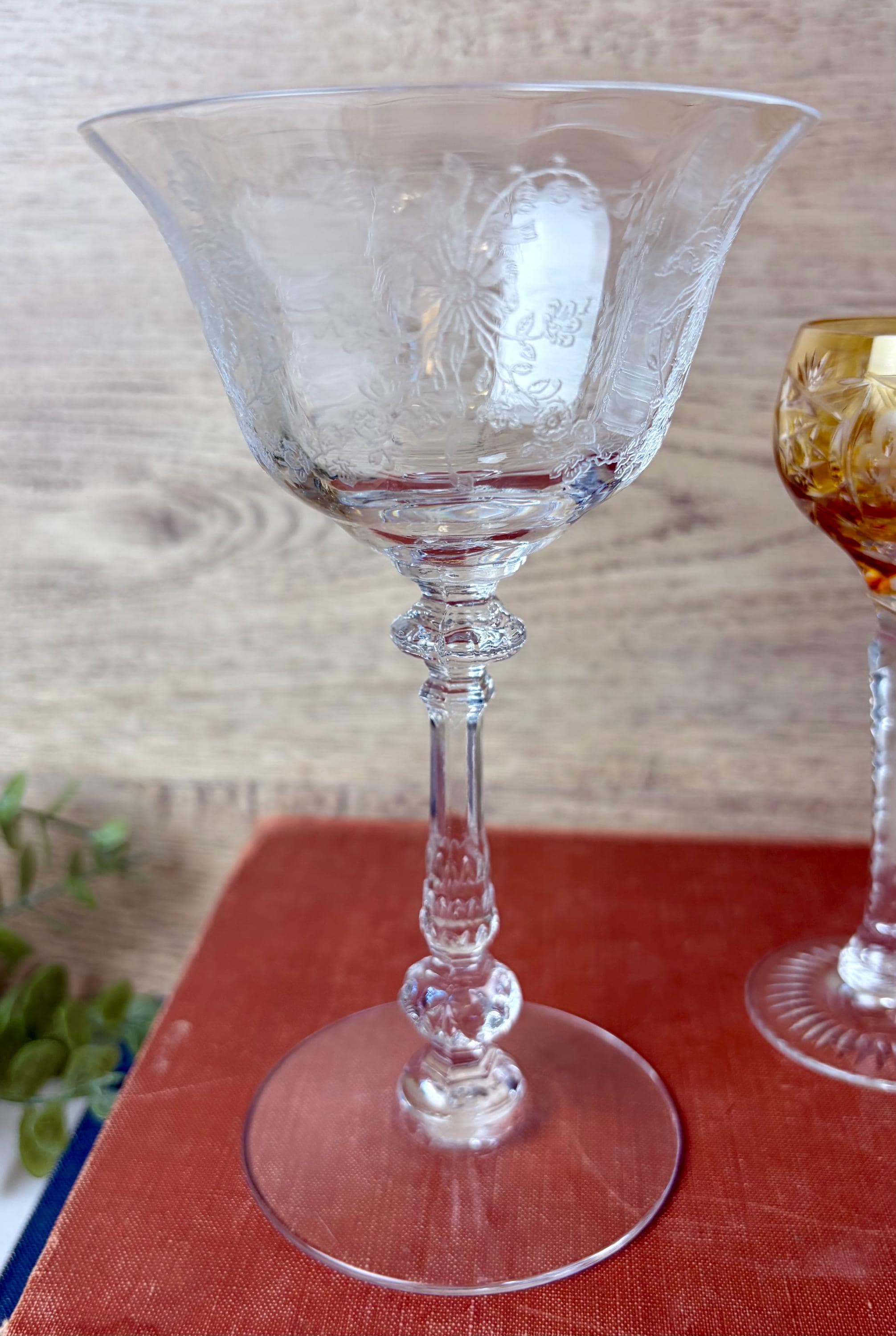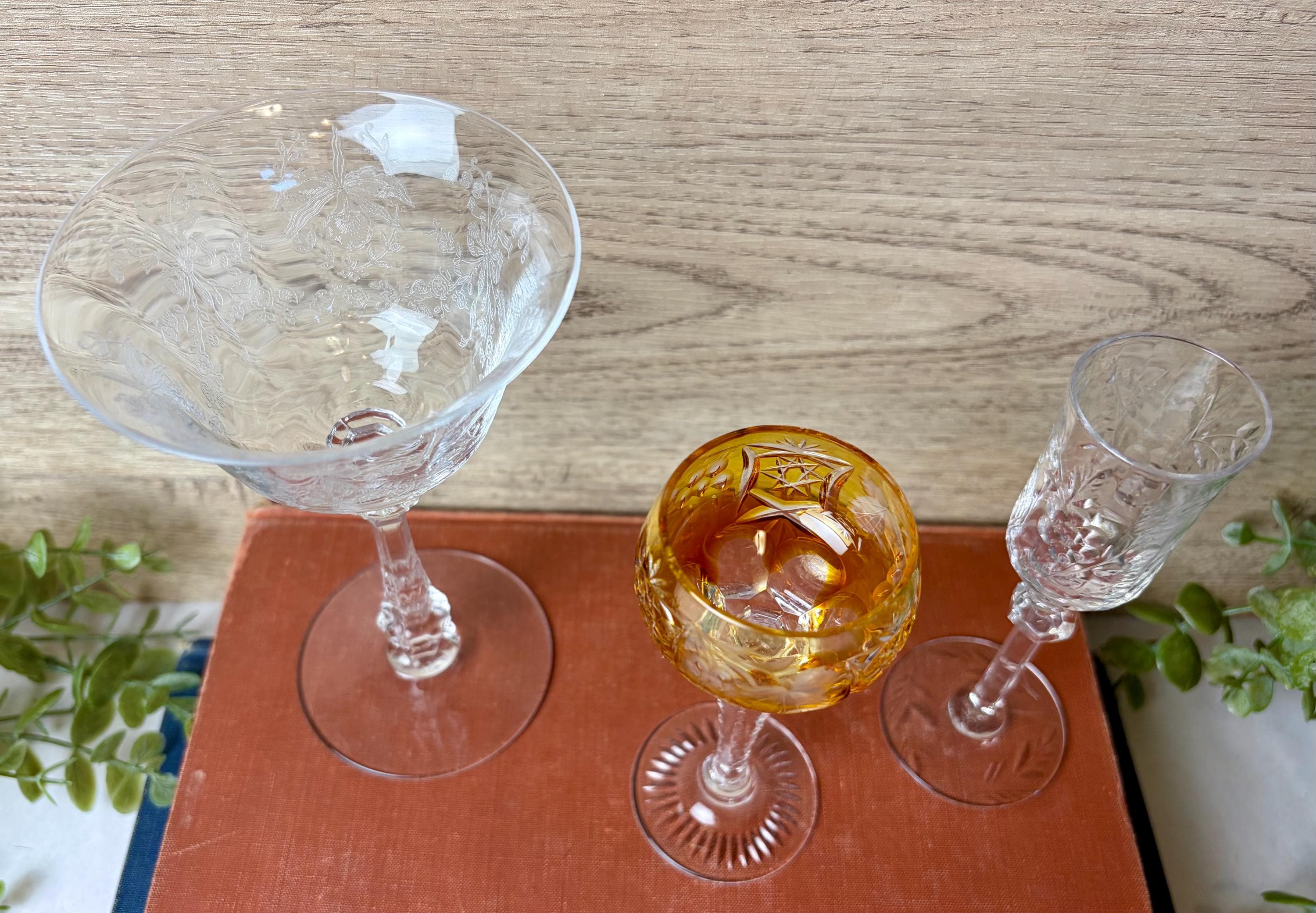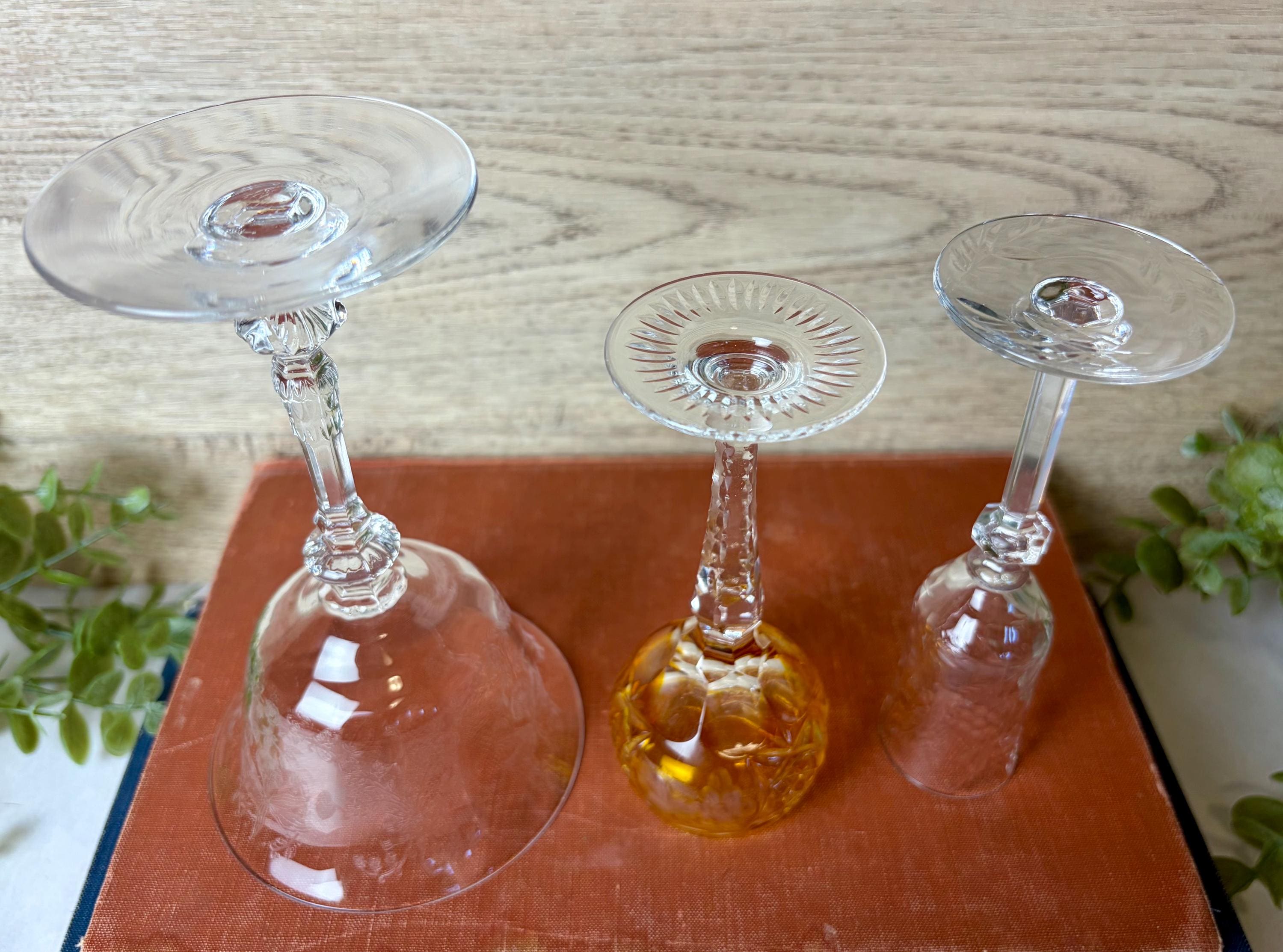 This curated trio includes: • 1 large etched crystal goblet with floral pattern • 1 amber cut crystal wine glass with faceted bowl • 1 slender etched champagne or cordial glass