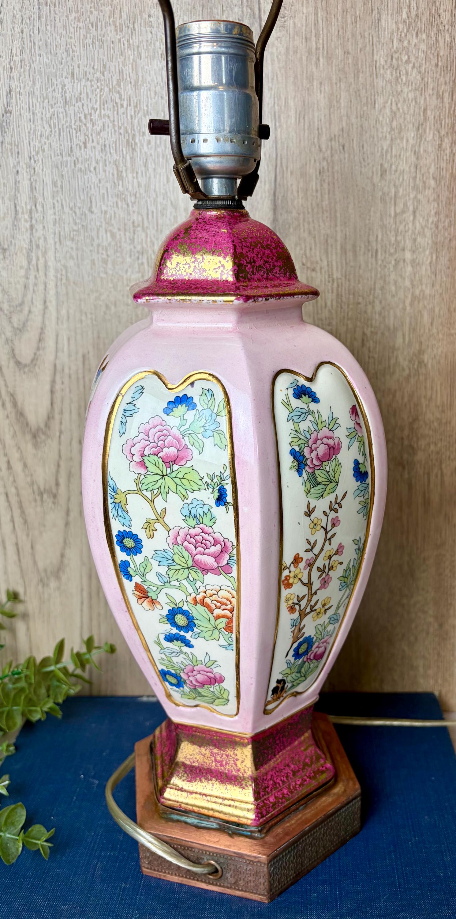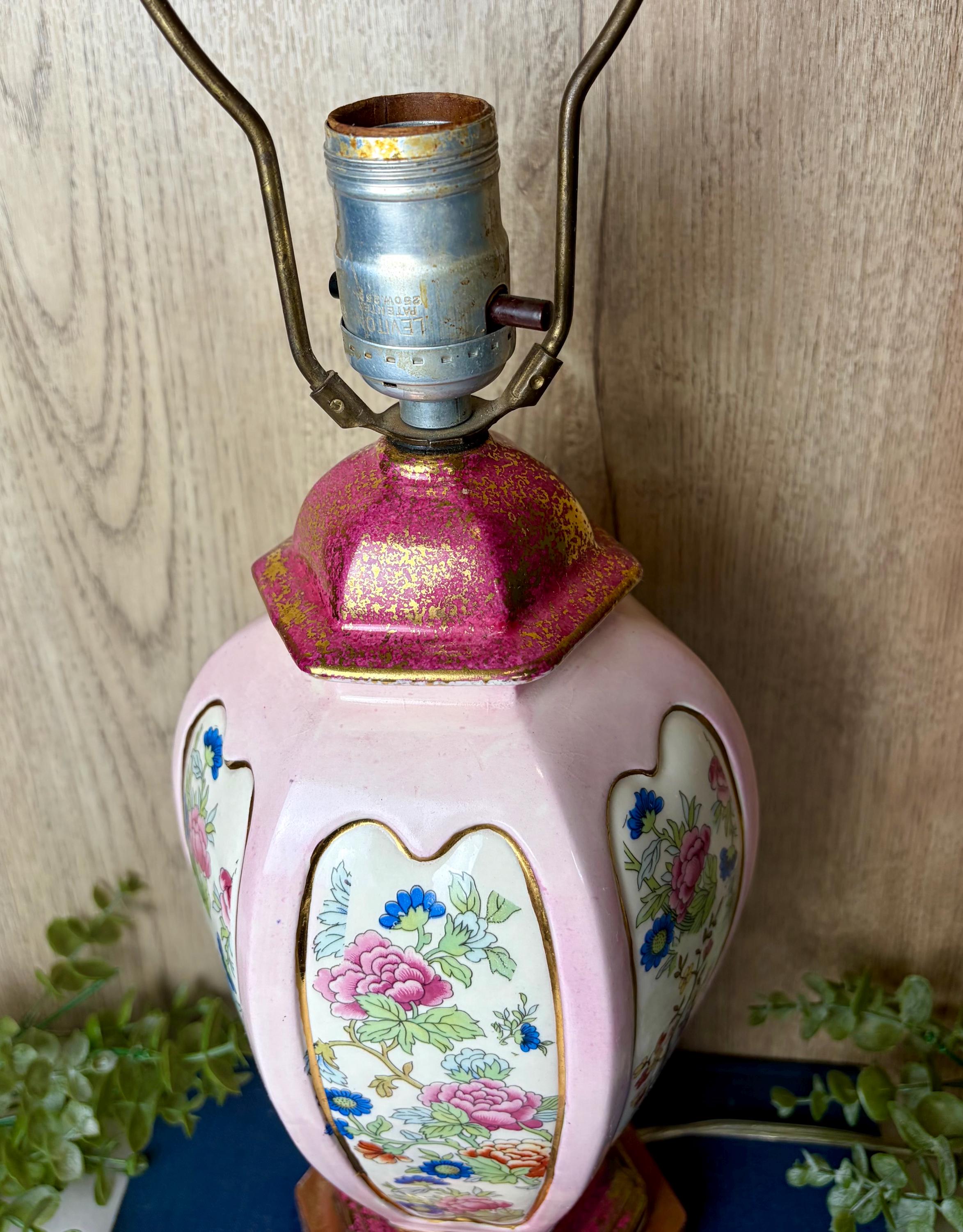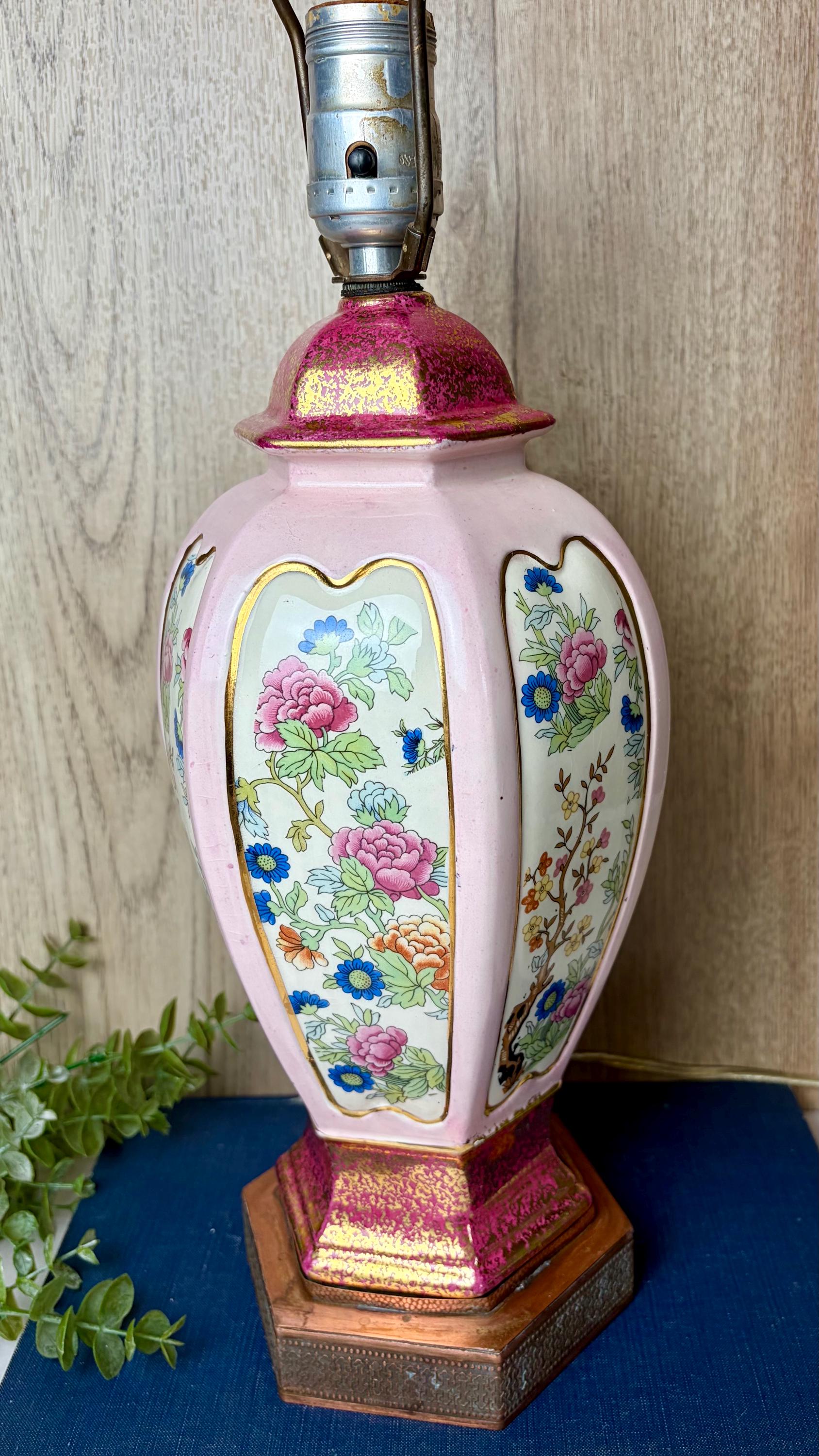 Details • Vintage porcelain table lamp • Soft pink body with floral panels • Gold gilt accents and decorative metal base • Brass harp and finial included • Classic Hollywood Regency / Chinoiserie aesthetic