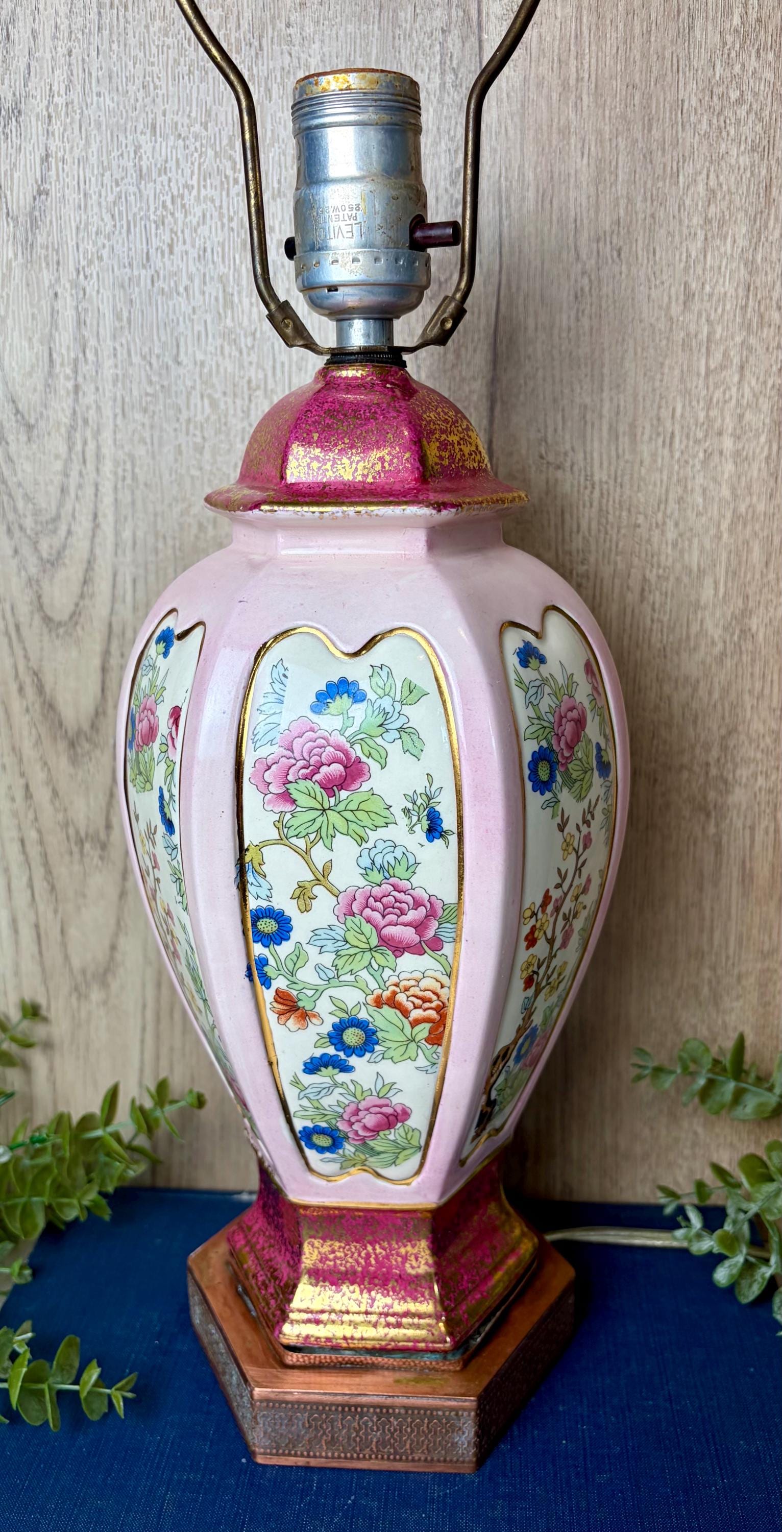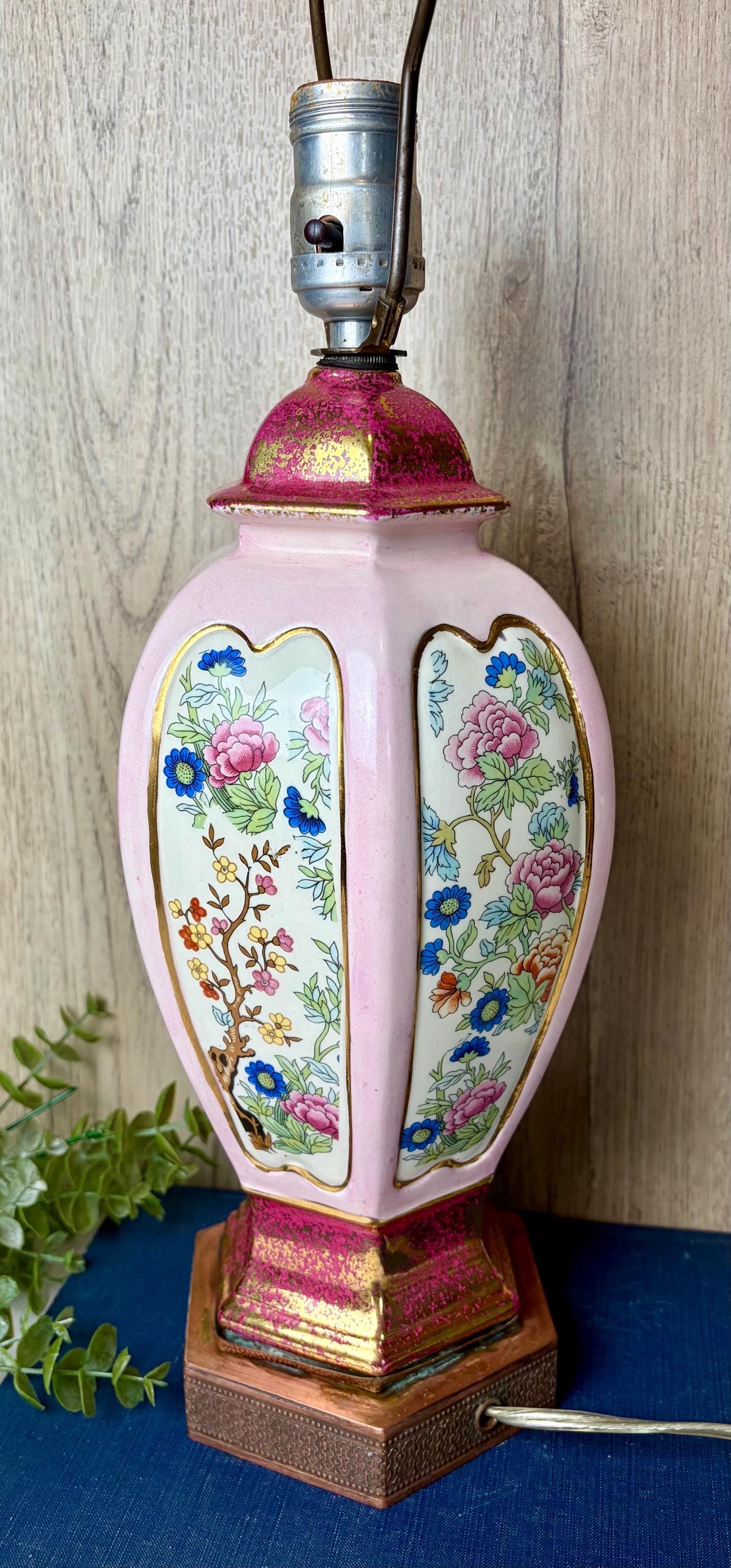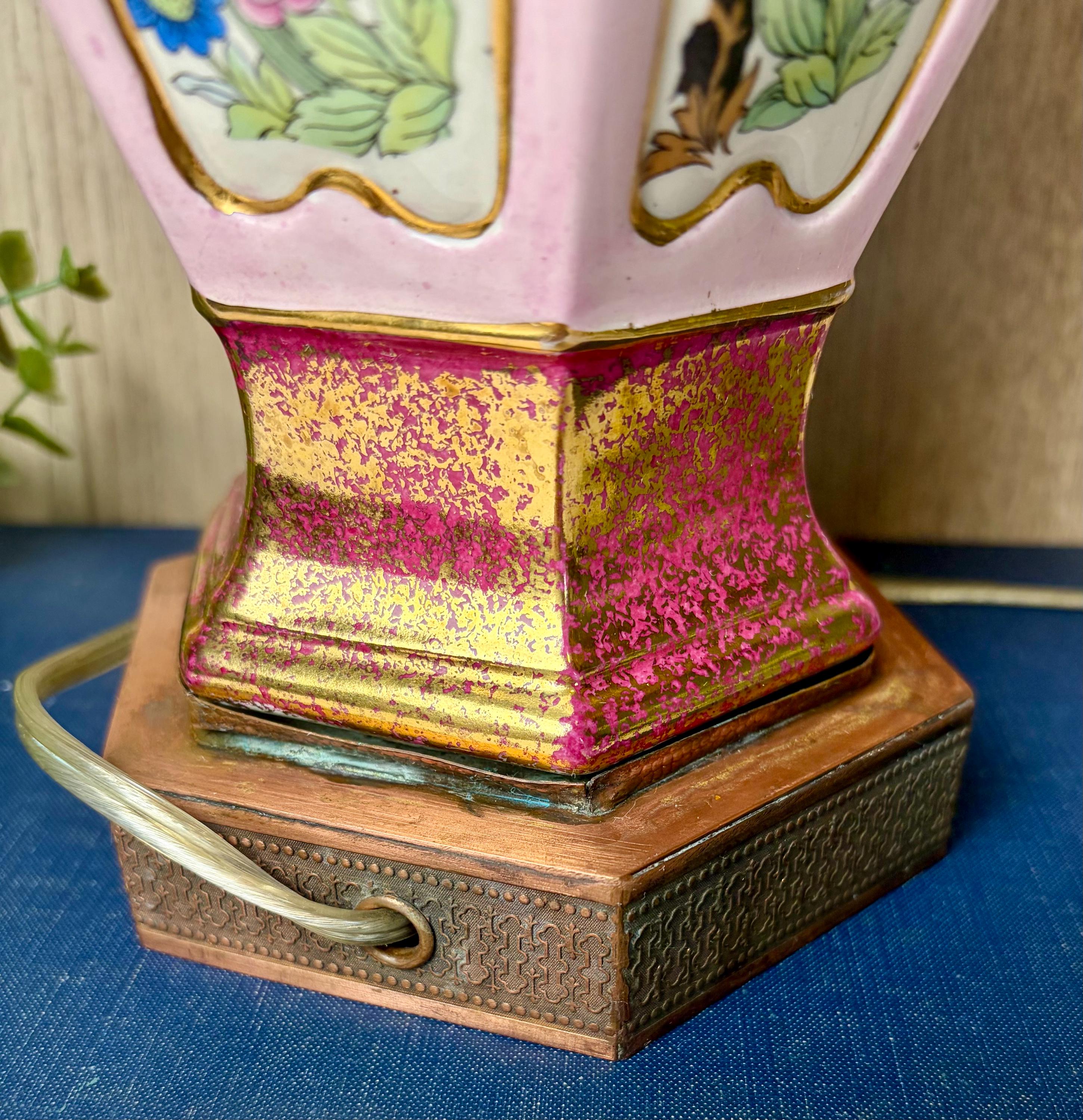 Details • Vintage porcelain table lamp • Soft pink body with floral panels • Gold gilt accents and decorative metal base • Brass harp and finial included • Classic Hollywood Regency / Chinoiserie aesthetic
