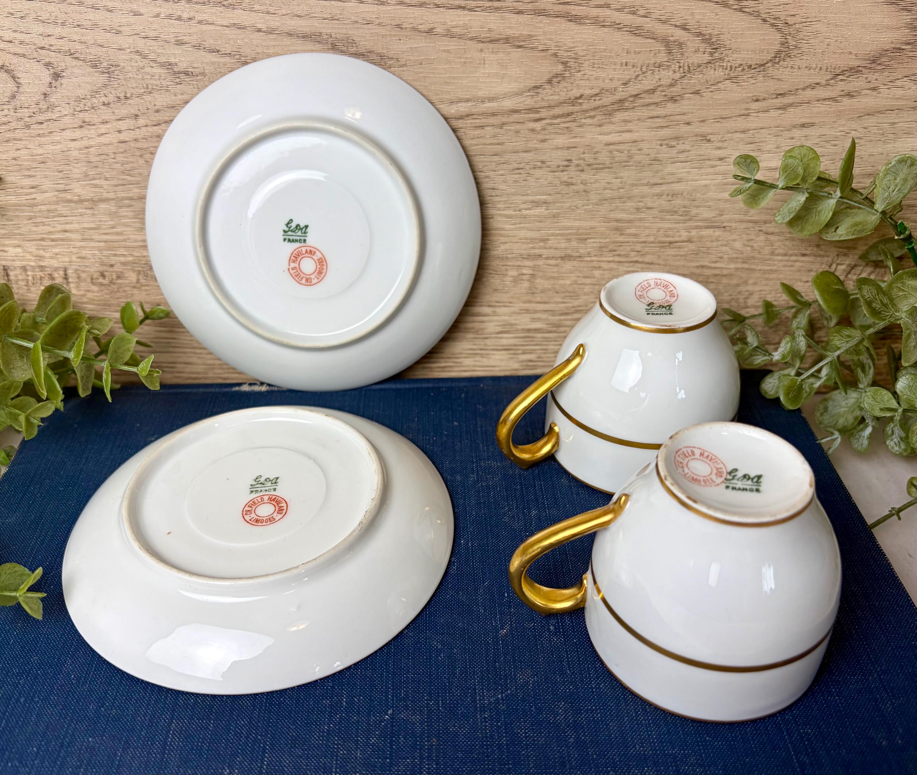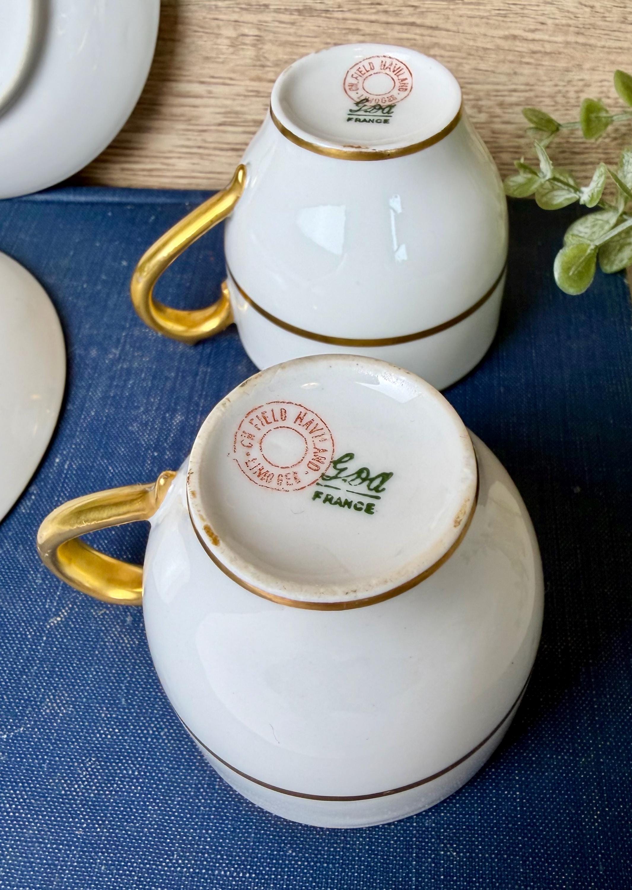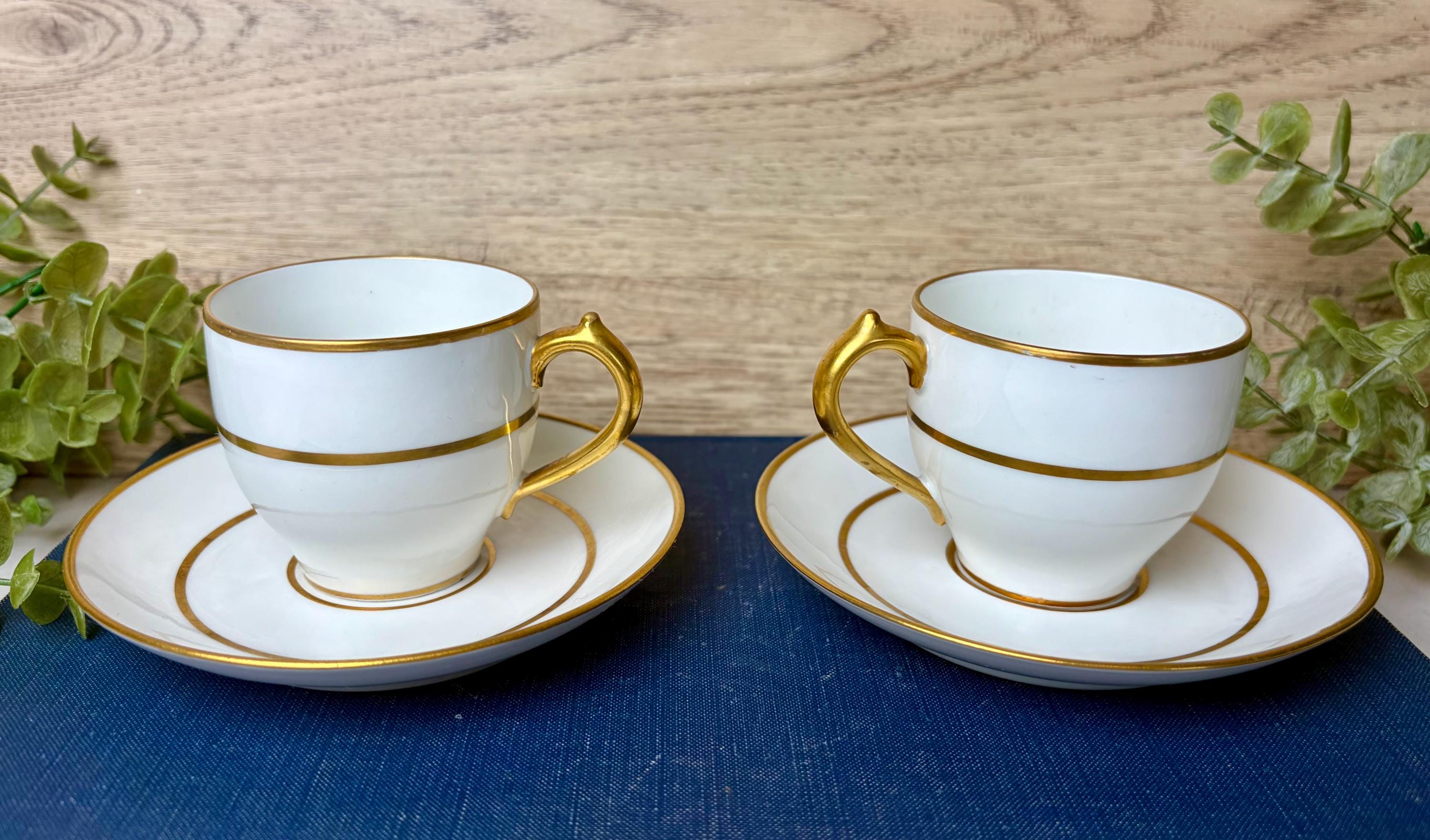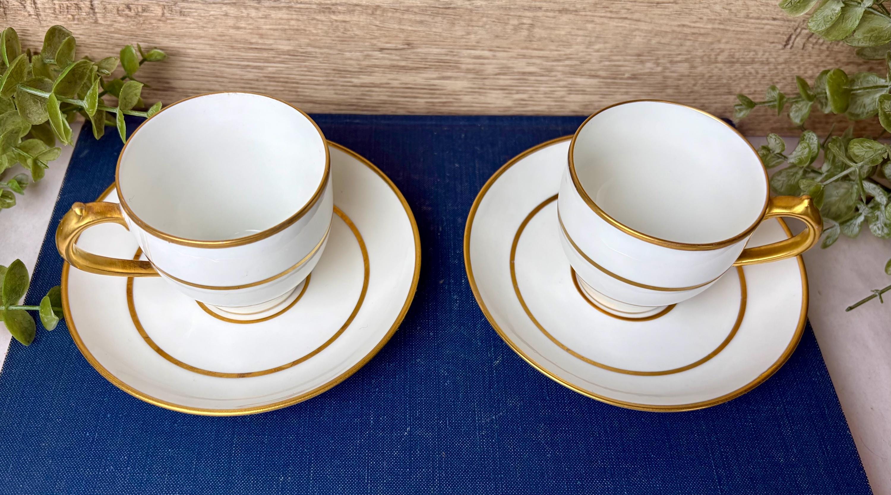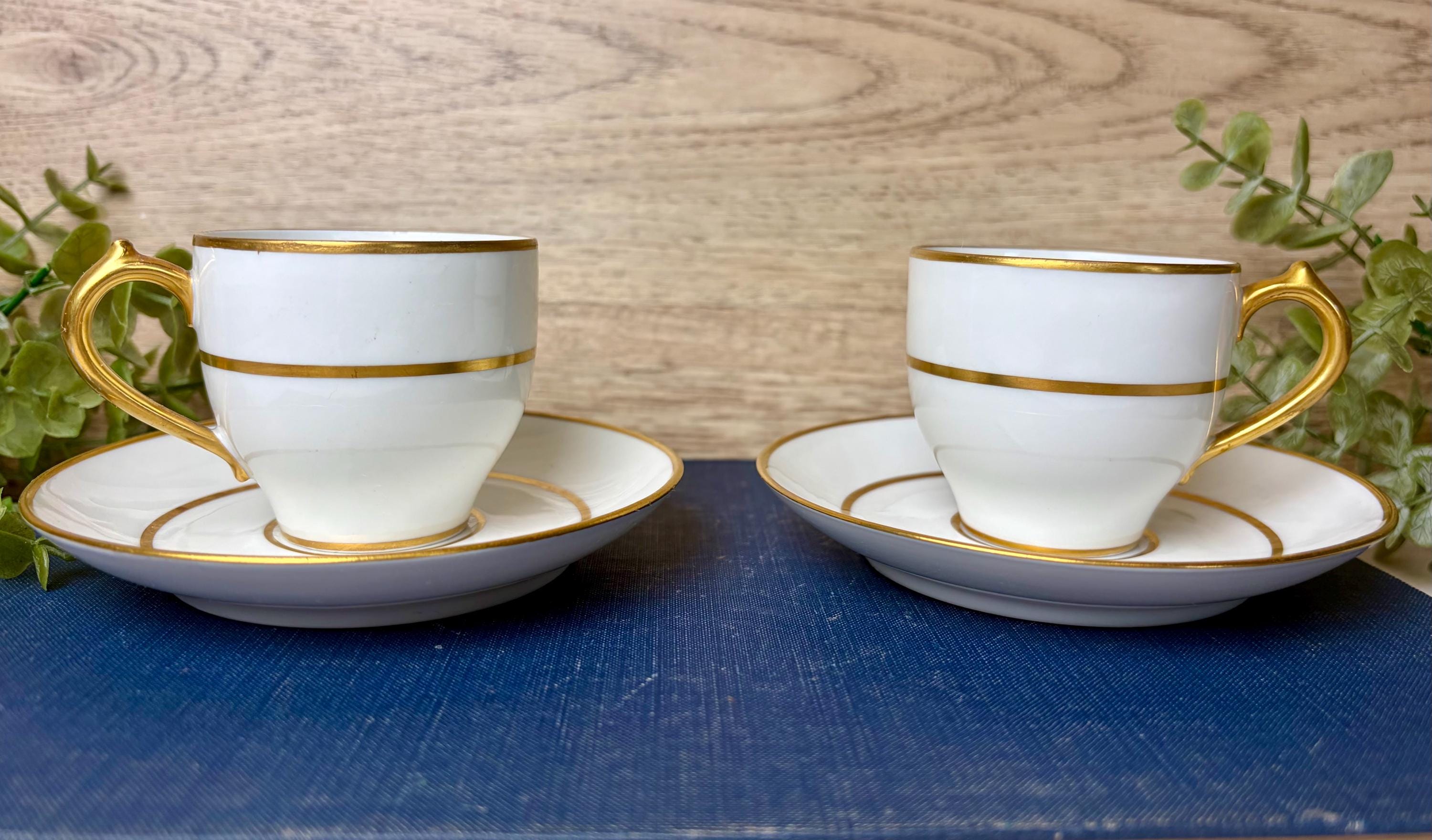 This elegant vintage set of two porcelain cups and saucers features a timeless white glaze accented with classic gold gilt bands and handles. The pieces are marked France with Haviland / Limoges stamps on the underside, indicating quality French porcelain craftsmanship.