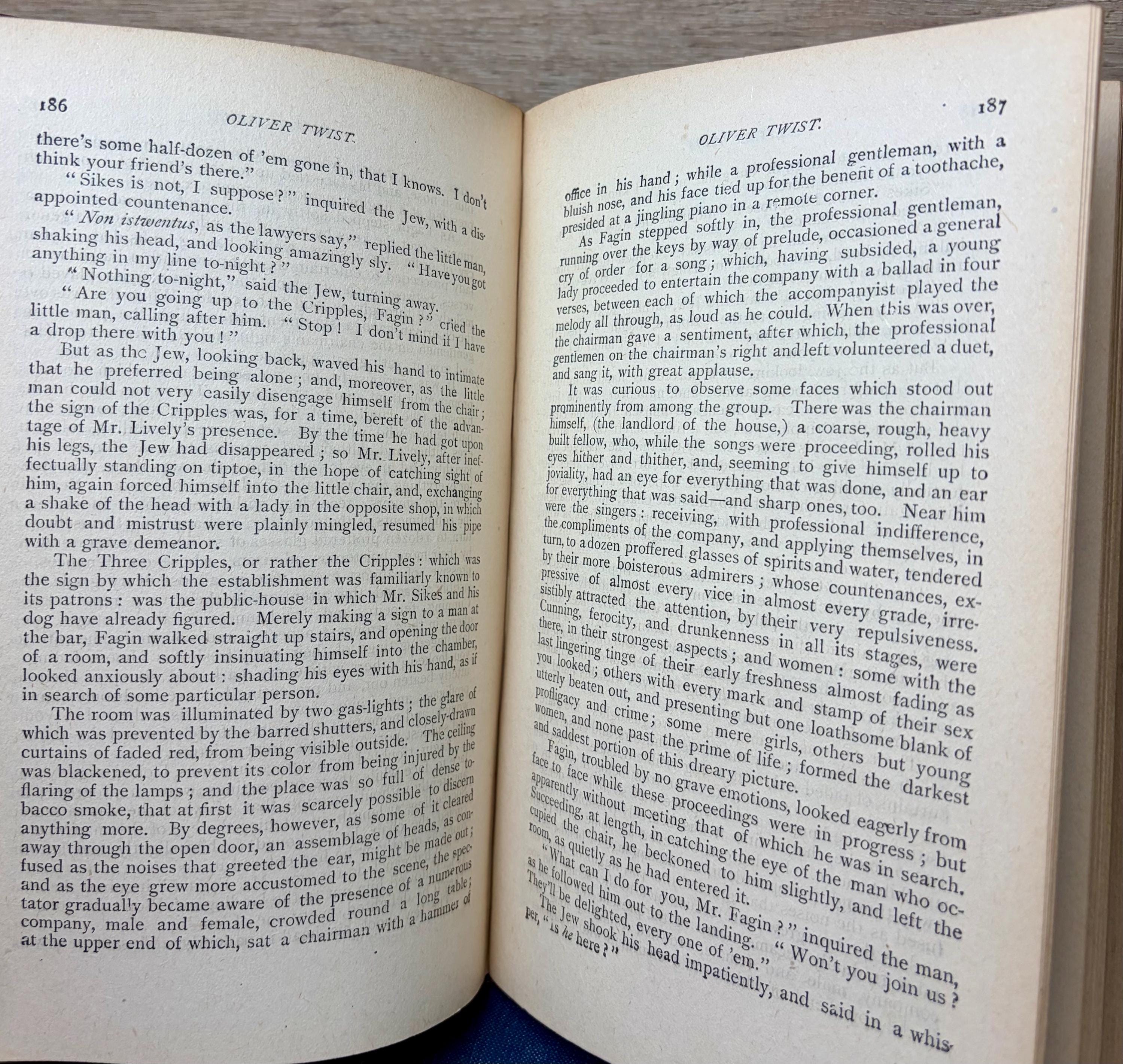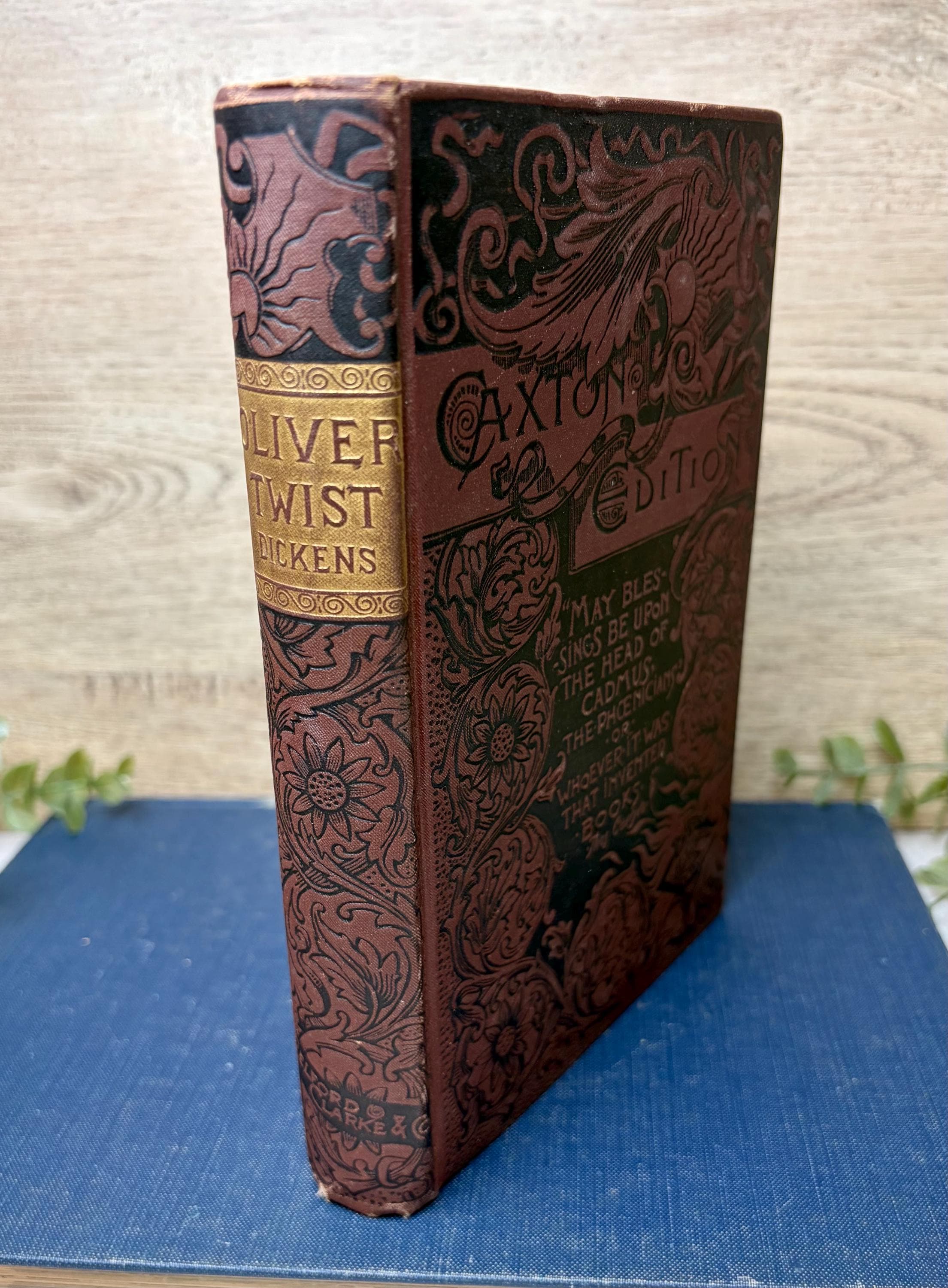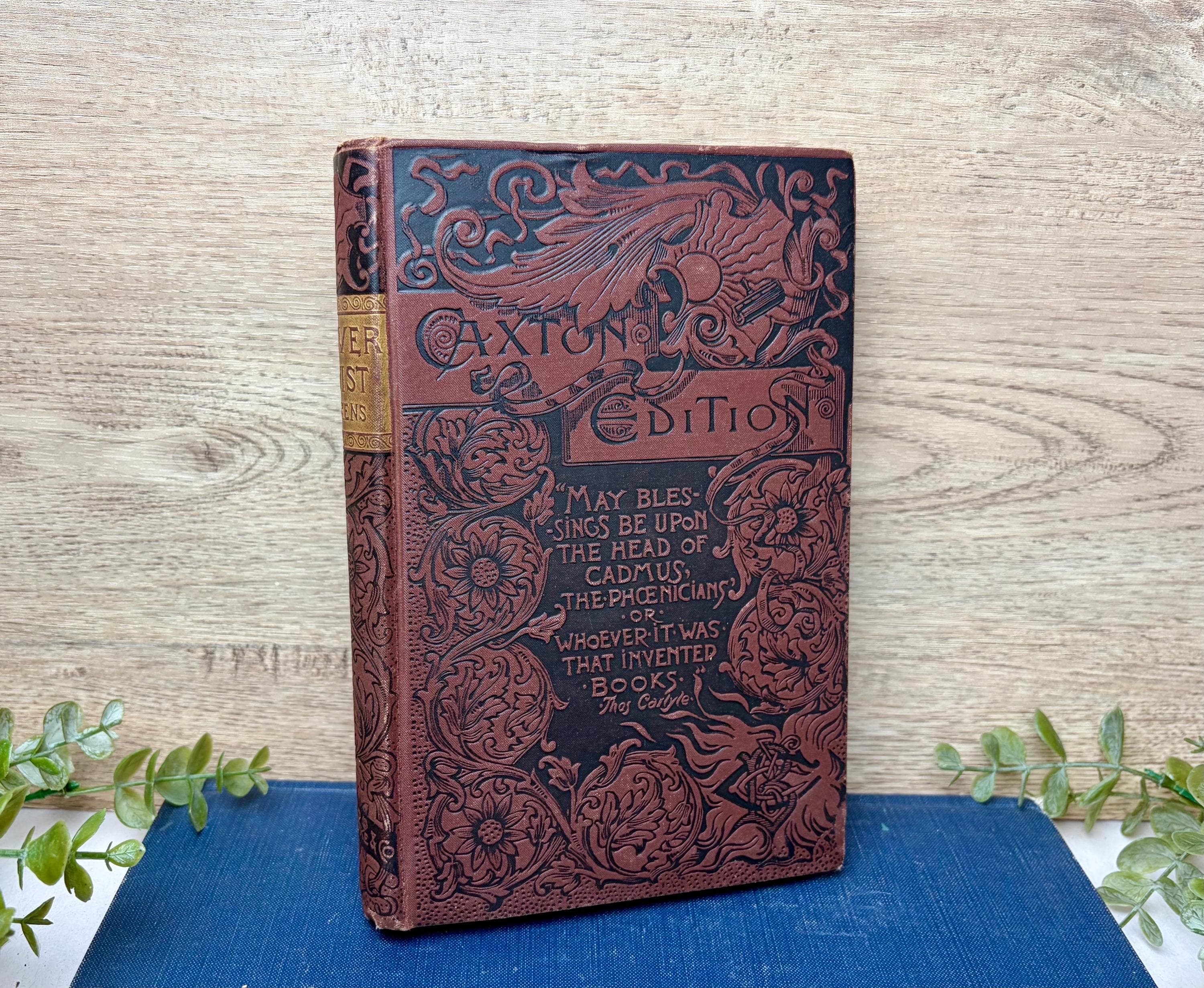 This is a rare 1888 "Caxton Edition" of Charles Dickens' classic, The Adventures of Oliver Twist, published by the notable firm Belford, Clarke & Co. in Chicago, New York, and San Francisco. This edition is particularly desirable for its beautiful brown cloth decorative binding, featuring intricate black embossed floral and scrollwork designs typical of the high-Victorian era.