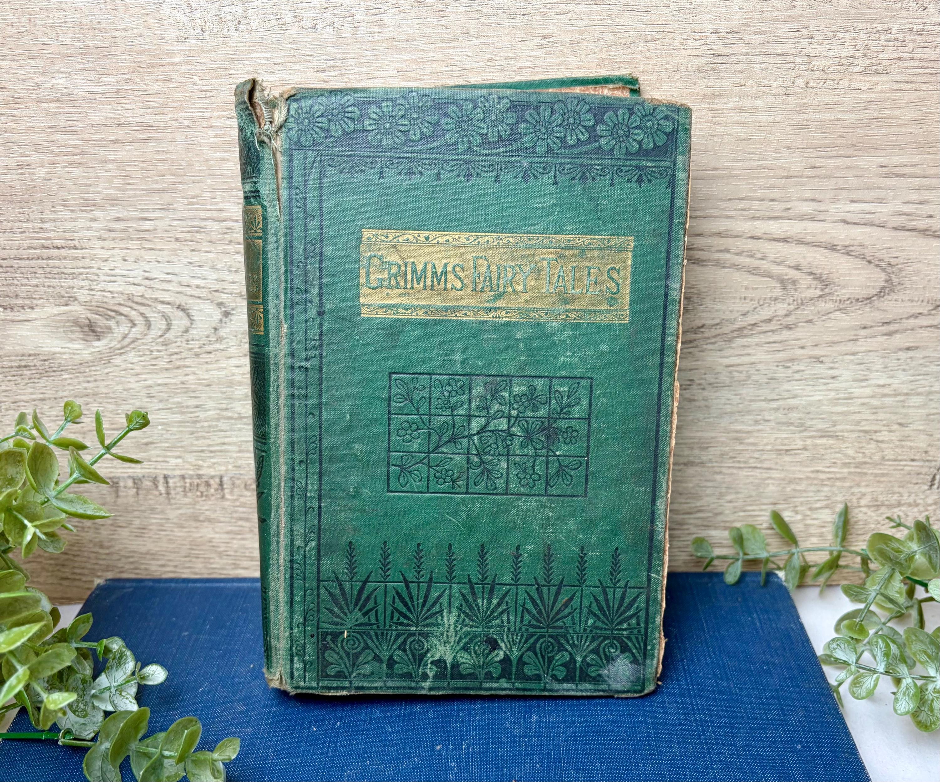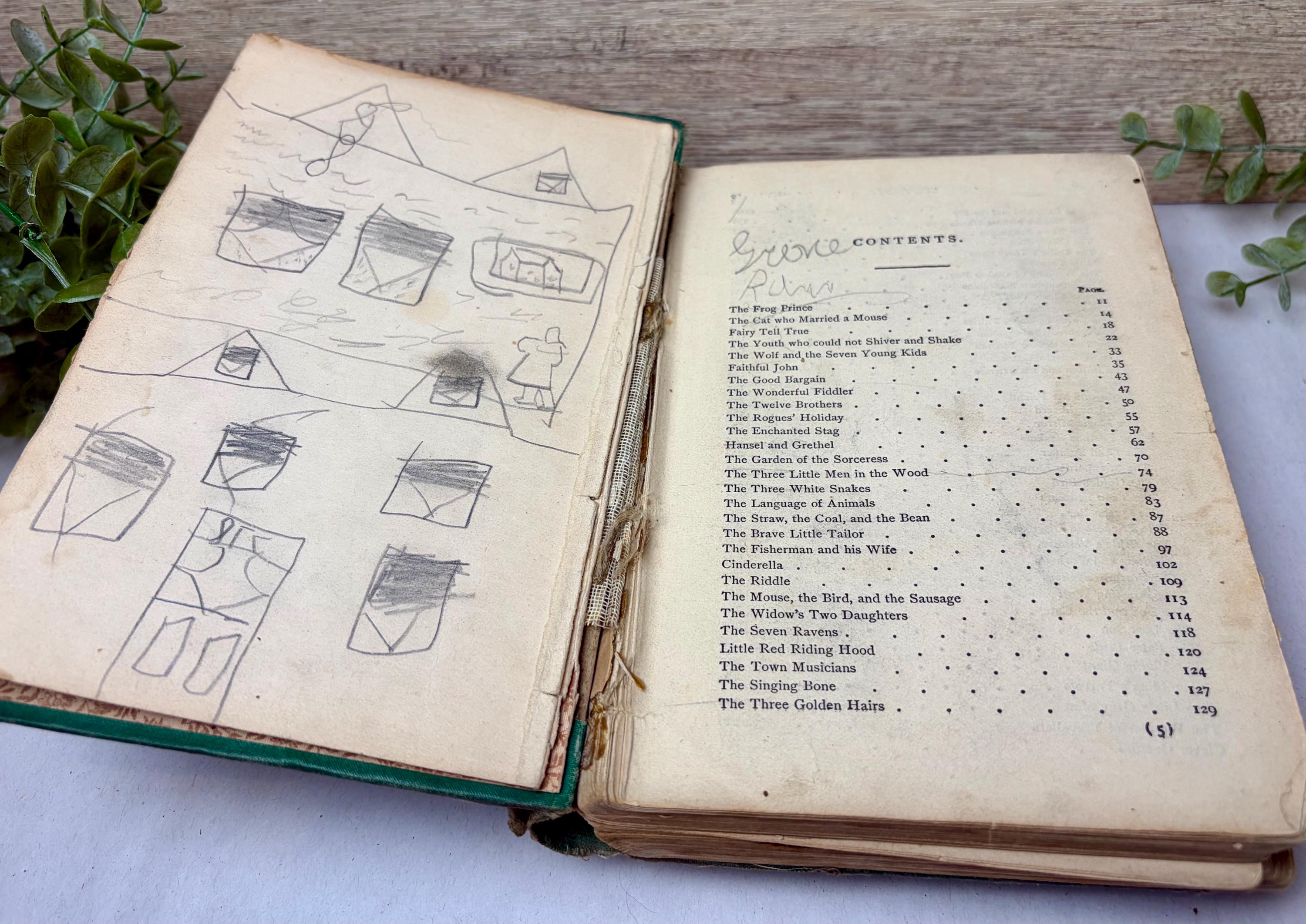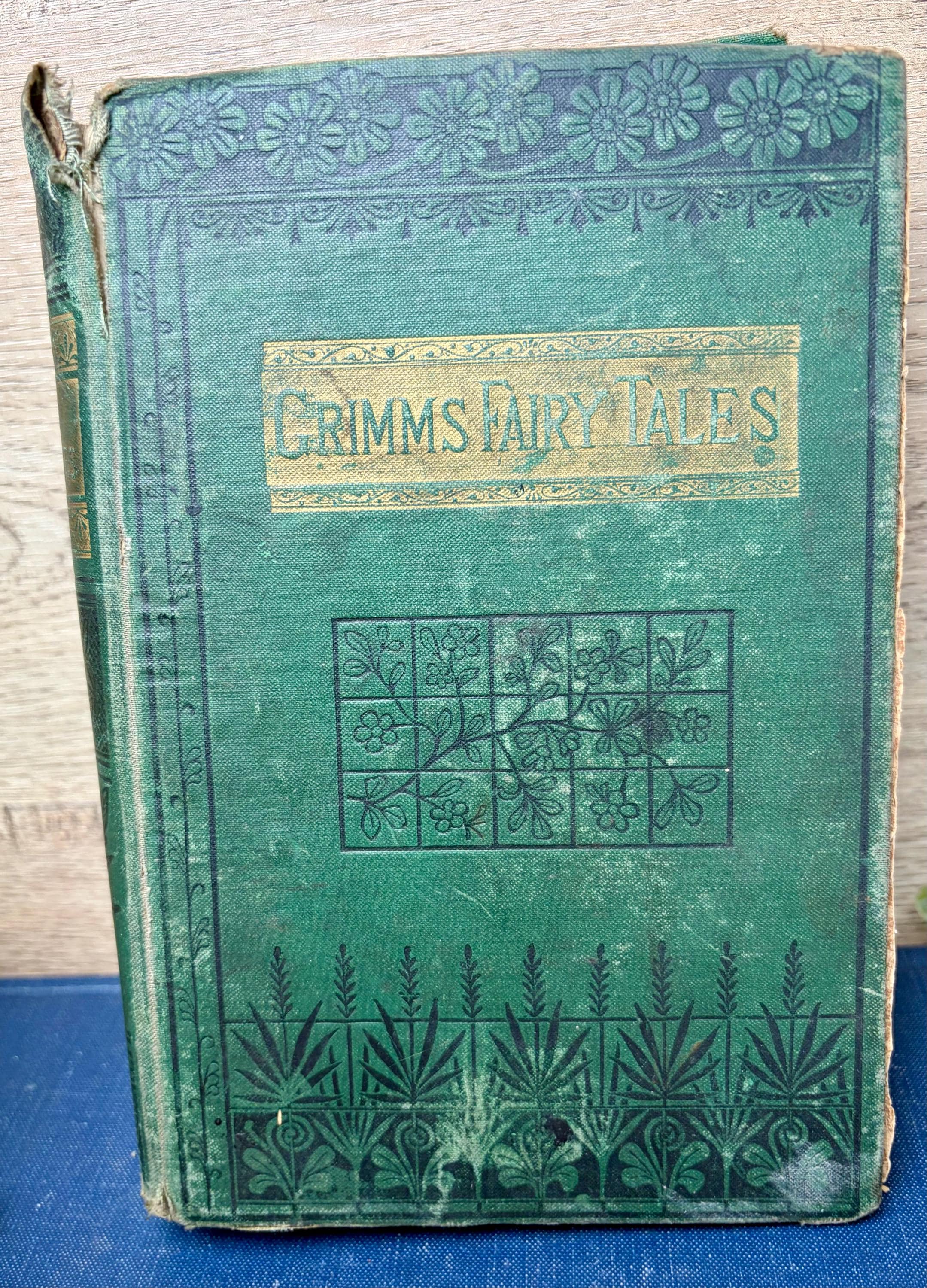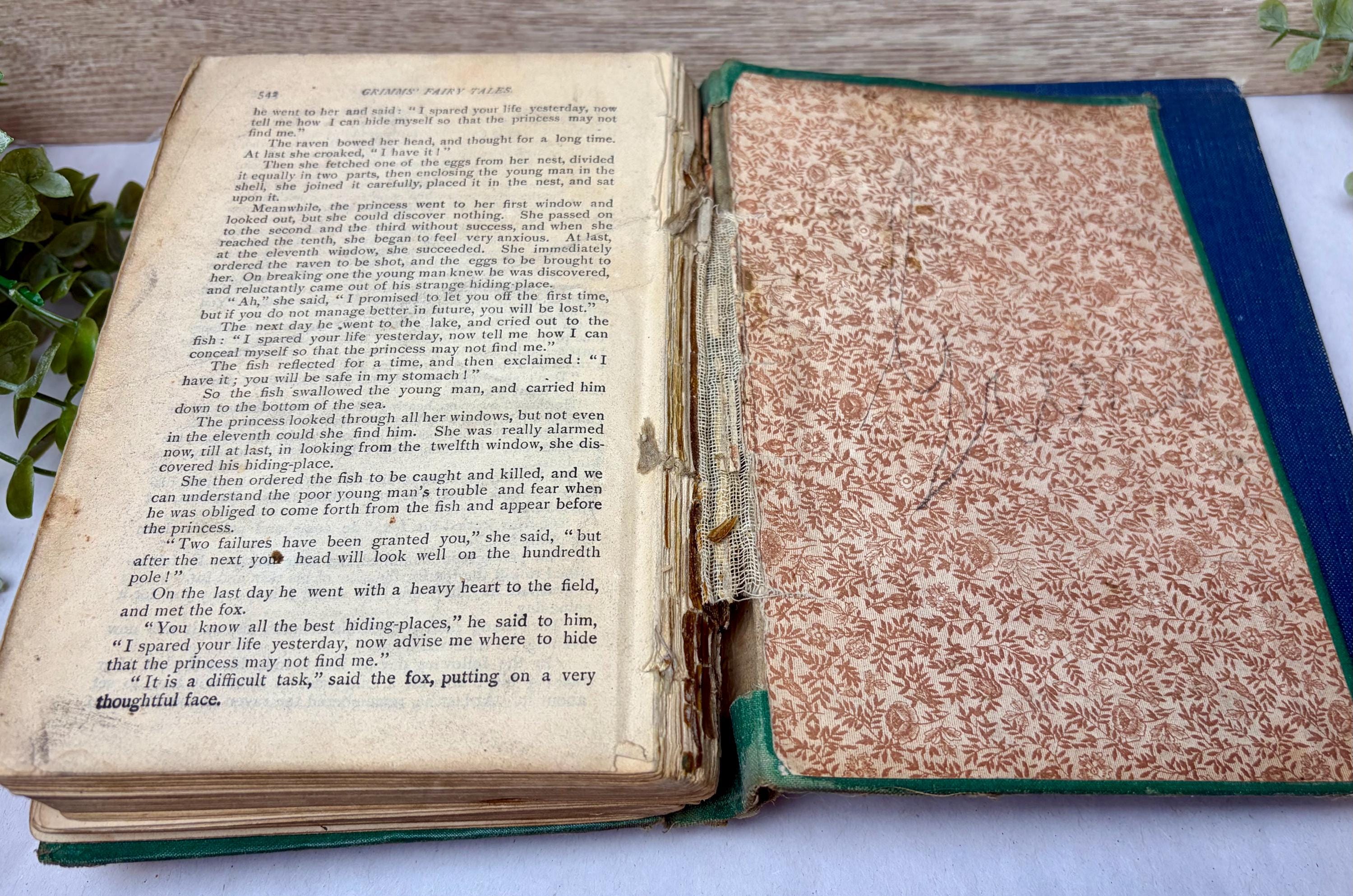 Step back in time with this charmingly worn Victorian edition of Grimms’ Popular Tales. Featuring a striking emerald green cloth cover with ornate black stamped illustrations and gold gilt lettering, this book is a quintessential example of 19th-century book design. While this copy has seen over a century of use, its "flaws" tell a story of their own. It features delightful original pencil drawings and doodles on the inner flyleaves—a rare glimpse into the imagination of a child from generations past. Perfect for: • Home Decor: A stunning "shelfie" piece for those who love the dark academia or cottagecore aesthetic. • Gift for Bibliophiles: A unique piece of history for the collector who values character over "mint condition." Specifications • Title: Grimms' Popular Tales (Grimms' Fairy Tales) • Author: The Brothers Grimm • Format: Hardcover, Green cloth with gilt and black stamping • Features: Comprehensive Table of Contents including classics like Cinderella, The Frog Prince, and Hansel and Gretel. Condition Report (Read Carefully) This book is in heavily distressed antique condition. It is being sold as-is for its historical and aesthetic value. • Binding: The spine is fragile with significant fraying at the head and foot. The hinges are cracked, and the text block is loosening from the cover. • Pages: Significant foxing (age spotting) and browning throughout. Some pages have small tears or folded corners. • Markings: Includes charming antique pencil drawings and a previous owner's name ("Grover") on the inner pages. • Cover: General shelf wear, rubbing on the gold gilt, and bumped corners.