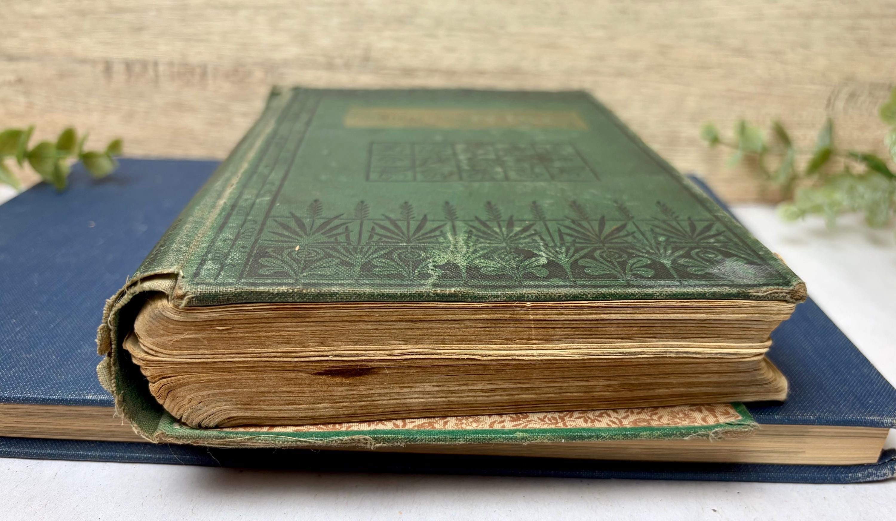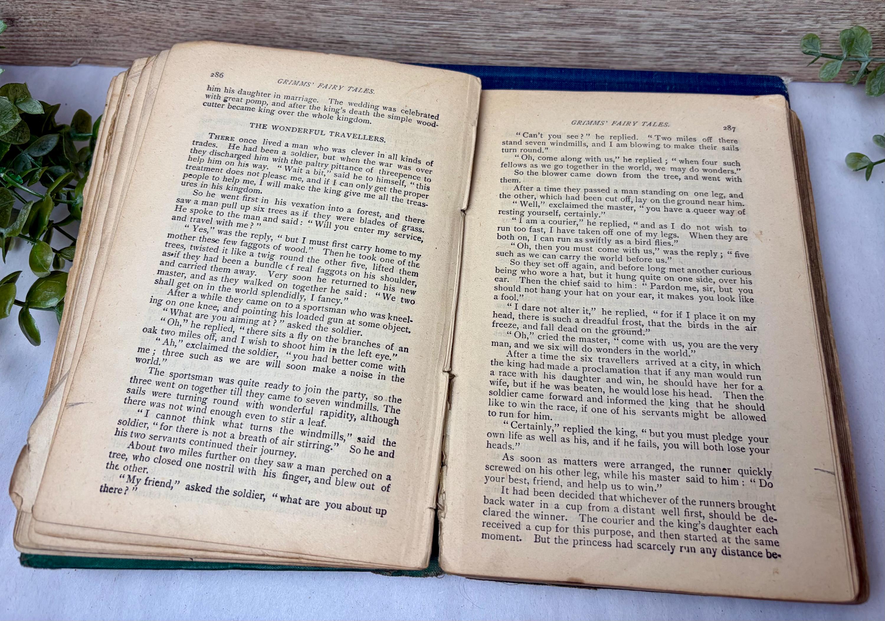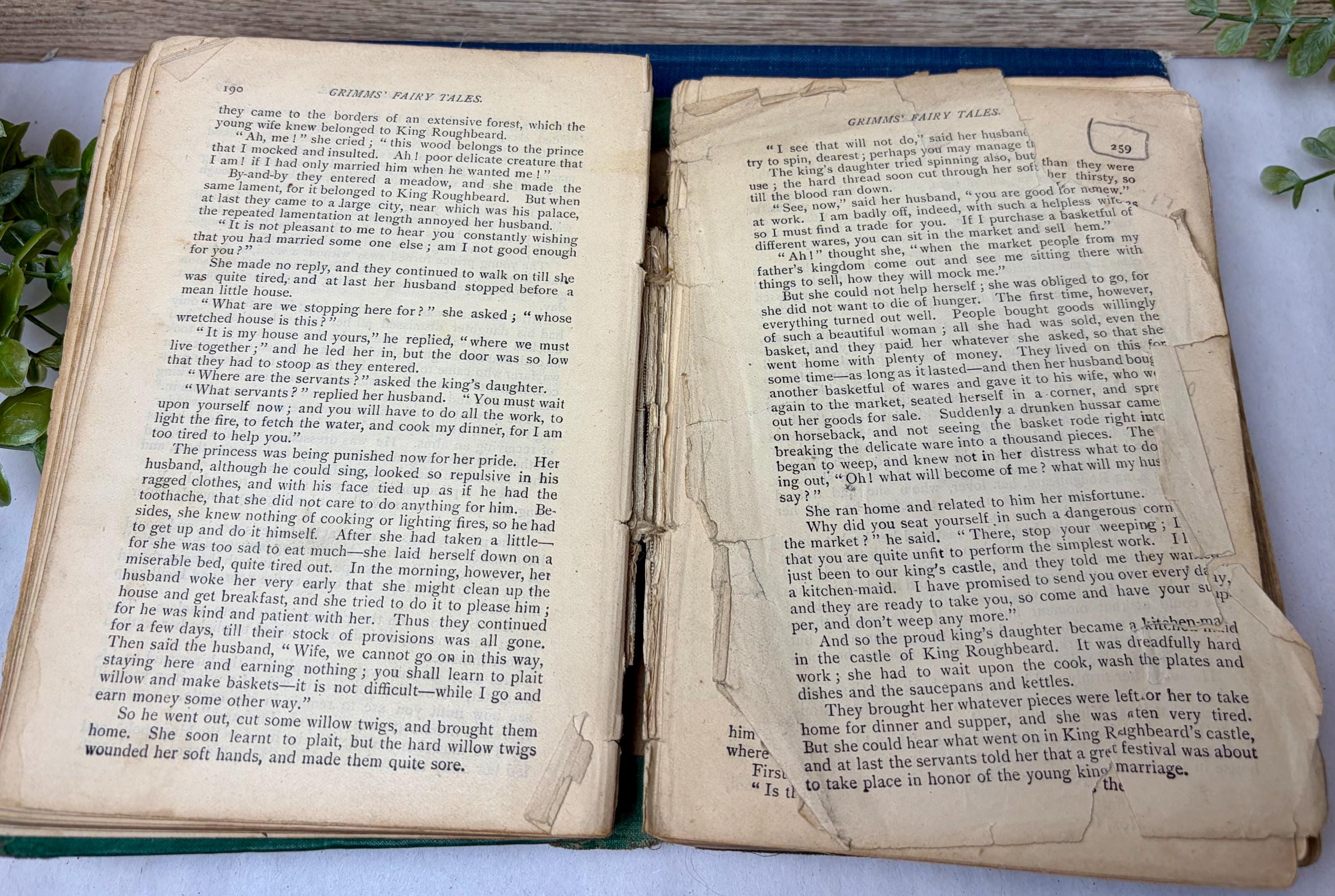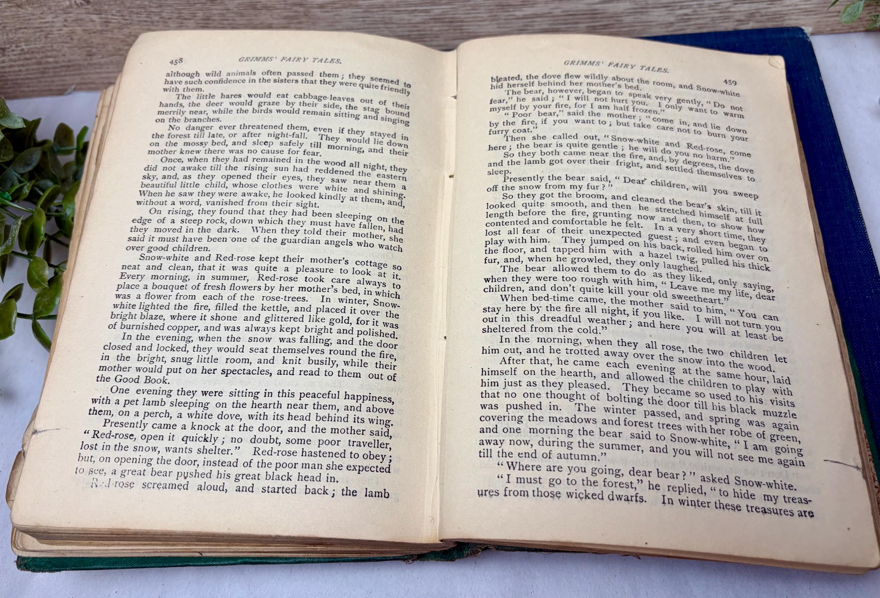 Step back in time with this charmingly worn Victorian edition of Grimms’ Popular Tales. Featuring a striking emerald green cloth cover with ornate black stamped illustrations and gold gilt lettering, this book is a quintessential example of 19th-century book design. While this copy has seen over a century of use, its "flaws" tell a story of their own. It features delightful original pencil drawings and doodles on the inner flyleaves—a rare glimpse into the imagination of a child from generations past. Perfect for: • Home Decor: A stunning "shelfie" piece for those who love the dark academia or cottagecore aesthetic. • Gift for Bibliophiles: A unique piece of history for the collector who values character over "mint condition." Specifications • Title: Grimms' Popular Tales (Grimms' Fairy Tales) • Author: The Brothers Grimm • Format: Hardcover, Green cloth with gilt and black stamping • Features: Comprehensive Table of Contents including classics like Cinderella, The Frog Prince, and Hansel and Gretel. Condition Report (Read Carefully) This book is in heavily distressed antique condition. It is being sold as-is for its historical and aesthetic value. • Binding: The spine is fragile with significant fraying at the head and foot. The hinges are cracked, and the text block is loosening from the cover. • Pages: Significant foxing (age spotting) and browning throughout. Some pages have small tears or folded corners. • Markings: Includes charming antique pencil drawings and a previous owner's name ("Grover") on the inner pages. • Cover: General shelf wear, rubbing on the gold gilt, and bumped corners.